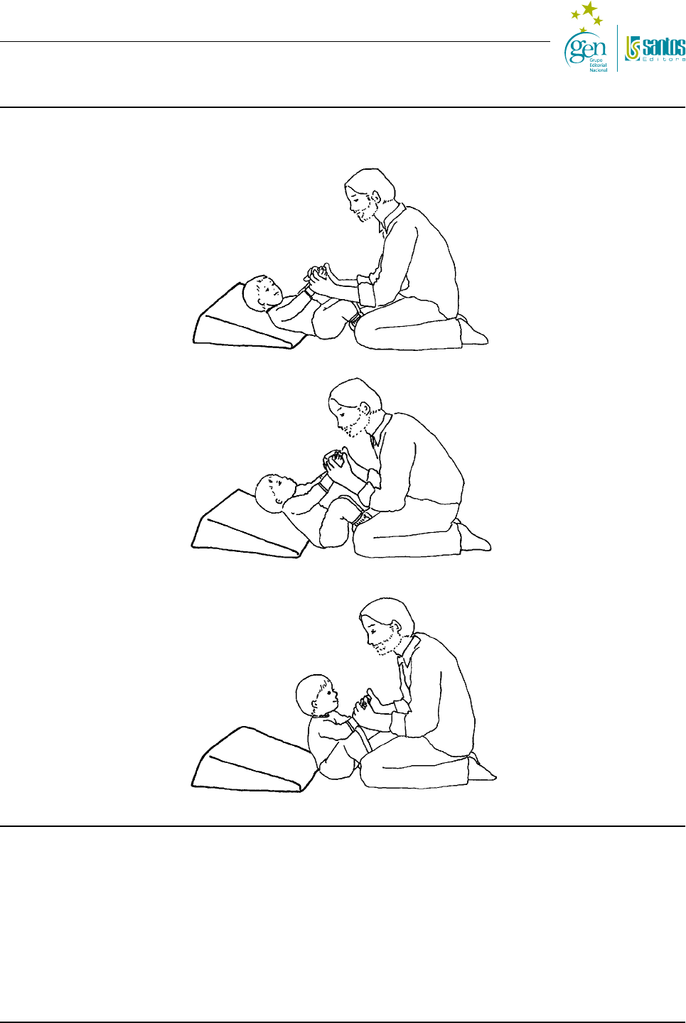 Método SARAH – Reabilitação baseada na família e no contexto da criança com lesão cerebral Desenvolvimento Motor © Livraria Santos Editora Lúcia Braga & Campos da Paz Atividade 5 De deitado para sentado Objetivo: Estimular o equilíbrio cervical de crianças maiores com dificuldades de elevar a cabeça a partir da posição horizontal. Como fazer: Deite a criança na posição supina, apoiando a parte superior do tronco e da cabeça em um suporte acolchoado ou em uma rampa de espuma. Segure suas mãos e, lentamente, ajude-a a passar para a posição sentada. Brincadeiras, como serra-serra, estimulam a sua participação. Essa mesma atividade pode ser utilizada com crianças e adolescentes em fase de recuperação motora após a lesão cerebral, para estimulação tanto do equilíbrio cervical como da transferência da posição deitada para a sentada.