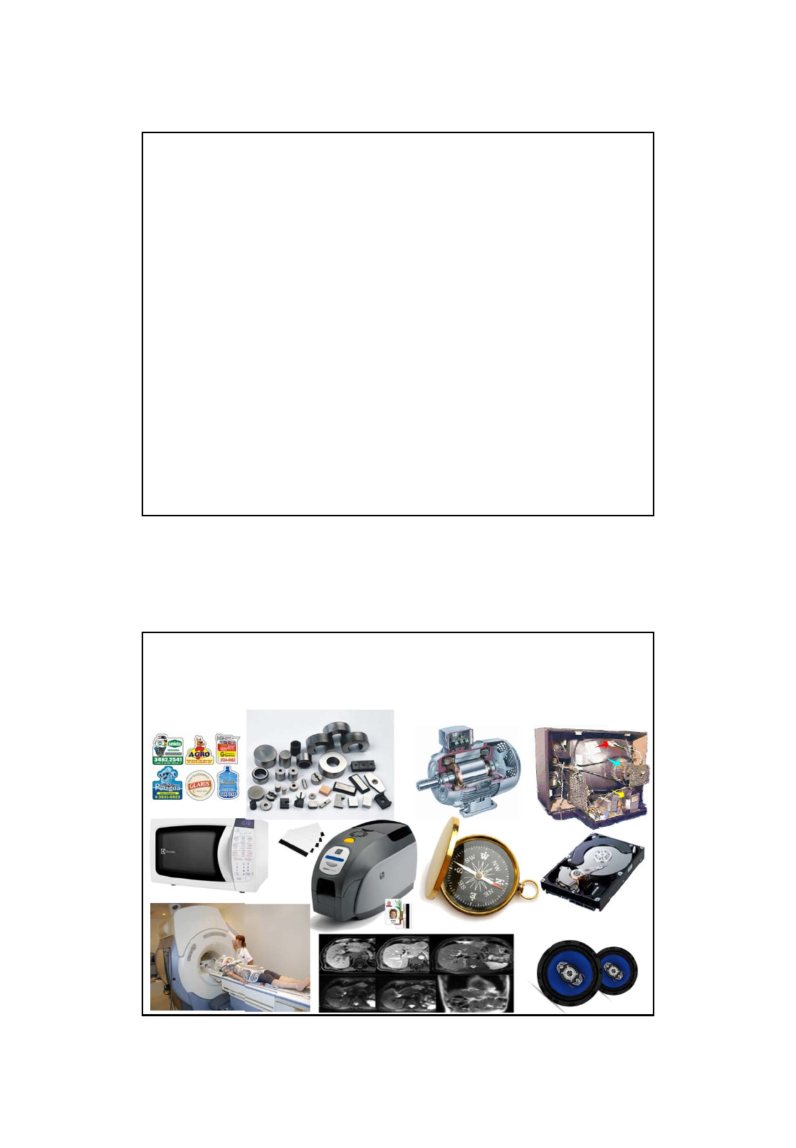 9/29/2017 1 Campo Magnético Prof. Cristiano Oliveira Ed. Basilio Jafet – sala 202 crislpo@if.usp.br Eletricidade e Magnetismo – IME Força Magnética Imãs permanentes, Motores, cinescópios de TV, fornos microondas, alto-falantes, impressoras, discos magnéticos, equipamentos de ressonância magnética, etc LE CT UR E NO TE S PR OF . C RI ST IA NO 9/29/2017 2 Força Magnética Forças magnéticas só atuam em cargas em movimento. Uma forma de investigar este fenômeno é utilizando o conceito de campo magnético, inicialmente produzido por um imã permanente, depois por um condutor conduzindo corrente elétrica, espira de corrente, etc. Magnetismo Foram observados há mais de 2500 anos, em fragmentos de minério de ferro nas proximidades da antiga cidade de magnésia (Manisa / Turquia) Esses fragmentos são hoje conhecidos como imãs permanentes Experimentalmente verifica-se que: • Um imã permanente exerce uma força sobre outro imã, ou sobre um pedaço de ferro não imantado • Uma haste de ferro em contato com um imã natural, se torna imantada • Uma haste imantada flutuando sobre a água ou suspensa por um fio preso no seu centro, tende a se alinhar na direção norte-sul (bússola) Antes de se compreender que a interação magnética pode ser explicada em termos de cargas em movimentos, se explicava esse fenômeno com base nos chamados pólos magnéticos. Em um imã permanente, uma das extremidades é denominada pólo Norte (N) e a outra pólo Sul (S) LE CT UR E NO TE S PR OF . C RI ST IA NO 9/29/2017 3 Imã Permanente • Pólos opostos se atraem • Pólos de mesmo nome se repelem • Um objeto de ferro é atraído por qualquer um dos pólos do imã Imã / Linhas de Campo • Podemos dizer que o imã cria um campo magnético no espaço em torno dele e um segundo corpo sofre a ação desse campo. • Uma agulha de bussola tende a se alinhar com o campo magnético do local onde está. Ou seja, a própria Terra é um imã. LE CT UR E NO TE S PR OF . C RI ST IA NO 9/29/2017 4 Imã / Linhas de Campo • A analogia com o campo elétrico pode ser feita até certo ponto apenas. • Na natureza existem cargas positivas e negativas isoladas. No entanto, até o presente momento não foi encontrado um pólo magnético isolado, ou o monopolo magnético. • Se um imã é quebrado em duas partes, cada extremidade de cada pedaço constitui um pólo oposto ao já existente. Magnetismo e movimento de cargas Primeira evidência de relação entre magnetismo e movimento de cargas: 1819, pelo cientista Oersted, que verificou que a agulha de uma bussola era desviada por um fio conduzindo uma corrente elétrica. Posteriormente, cientistas como André Ampère (França), Michael Faraday (Inglaterra) e Joseph Henry (EUA) prosseguiram nestes estudos, obtendo resultados e propriedades correlatas. Hoje se sabe que as forças magnéticas entre dois corpos são produzidas pelo efeito magnético dos elétrons dos átomos no interior dos corpos. Em corpos imantados, existe um movimento coordenado de alguns elétrons dos átomos, e em corpos não imantados, esses movimentos não são coordenados. LE CT UR E NO TE S PR OF . C RI ST IA NO 9/29/2017 5 Campo Magnético Pode-se obter as propriedades do campo magnético através de sua interação com cargas em movimento O campo magnético é um campo vetorial, ou seja, trata-se de uma grandeza vetorial associada a cada ponto do espaço. Usaremos o símbolo para designar o campo magnético Por definição o vetor sai do polo norte e entra no polo sul de um imã permanente. Experimentalmente pode-se obter as características da força magnética que atua em uma carga em movimento. • Carga elétrica em repouso não sofre a ação de forças magnéticas • A força magnética não possui a mesma direção do campo magnético , porém atua sempre em uma direção simultaneamente perpendicular à direção de e à direção da velocidade . Campo Magnético Como e são vetores, podemos escrever essa força como o produto vetorial de deles: Força magnética em uma particula carregada em movimento. A unidade de B no SI é 1N.s/(C.m). Como o ampère é igual a um coulomb por segundo (1A=1C/S), [B]=1N/(A.m). Essa unidade recebe o nome de tesla [T]: LE CT UR E NO TE S PR OF . C RI ST IA NO 9/29/2017 6 Campo Magnético Outra unidade bastante comum é o gauss (1G=10 - 4 T). O campo magnético da terra é da ordem de 1 G. A magnetosfera protege a superfície da Terra das partículas carregadas do vento solar. É comprimida no lado diurno (Sol) devido à força das partículas que chegam, e estendido no lado noturno. Interior dos átomos: campos da ordem de 10T Maior campo estacionário de laboratório: 45T Maior campo pulsado (~ms): 120T Na superfície de uma estrela de nêutrons : 10 8 T Medição de B Tubo de raios Catódicos • Acelera‐se cargas (elétrons) utilizando por exemplo um campo elétrico constante. • Estes elétrons incidem em uma tela fosforecente • Sem campo magnético estar presente, o feixe atinge a tela no centro. Ao se ligar o campo magnético, o feixe sofre uma deflexão. • Pela medida da posição de deflexão, pode‐se estimar a direção, sentido e módulo do campo elétrico aplicado. LE CT UR E NO TE S PR OF . C RI ST IA NO 9/29/2017 7 Tubo de raios Catódicos Um feixe de prótons (q=1.6x10‐19C) se move a 3.0x105 m /s em um campo magnético uniforme de 2.0T direcionado ao longo do eixo z. A velocidade de cada próton repousa no plano xz em uma direção que forma um angulo de 30º com o eixo z positivo. encontre a força no próton LE CT UR E NO TE S PR OF . C RI ST IA NO 9/29/2017 8 Qual caminho a partícula negativa fará? 1, 2 ou 3? Justifique!!! Força de Lorentz Quando uma partícula carregada se move em uma região do espaço onde existem simultaneamente um campo elétrico e um campo magnético, ambos os campos exercem forças sobre a partícula. A força resultante F será a soma vetorial da força elétrica e da força mag