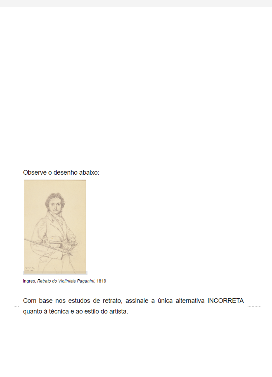• 0,175 em 0,175 pontos Sobre o desenho de retrato, considere as seguintes afirmações: I. As duas condições básicas que devem reunir um bom retrato são: oferecer uma semelhança com o modelo e ser, em si, mesmo uma obra de arte. II. No que diz respeito à semelhança, ela deve ser exata, pois, se não há uma semelhança, não há retrato. III. O artista é livre para fazer sua interpretação e há a necessidade de que o retrato possa ser admirado e julgado como uma obra de arte, prescindindo inclusive da semelhança com o modelo. IV. A semelhança não é o bastante para um bom retrato. Contempla as características do desenho de retrato APENAS o que se afirma em: Resposta Selecionada: b. I, III e IV • Pergunta 2 errei essa 0 em 0,175 pontos Resposta Selecionada: b. Trata-se de uma obra calma, lírica e contemplativa, cuja feição suave do homem é feita com traços macios que trazem a sua presença da sombra para a luz. • Pergunta 3 0,175 em 0,175 pontos Foi a partir do final do século XIX que houve uma mudança significante no estilo do desenho, em seus princípios técnicos, conceituais e estéticos. Assinale, abaixo, a única alternativa que NÃO caracteriza o desenho moderno e a produção de Rodin. Resposta Selecionada: b. Seus desenhos agradavam às pessoas pelo fato de os temas serem eróticos; as pessoas sentiam-se encantadas com suas linhas livres e com o fluir das tintas para fora dos contornos. • Pergunta 4 0,175 em 0,175 pontos Resposta Selecionada: c. Albert Dürer