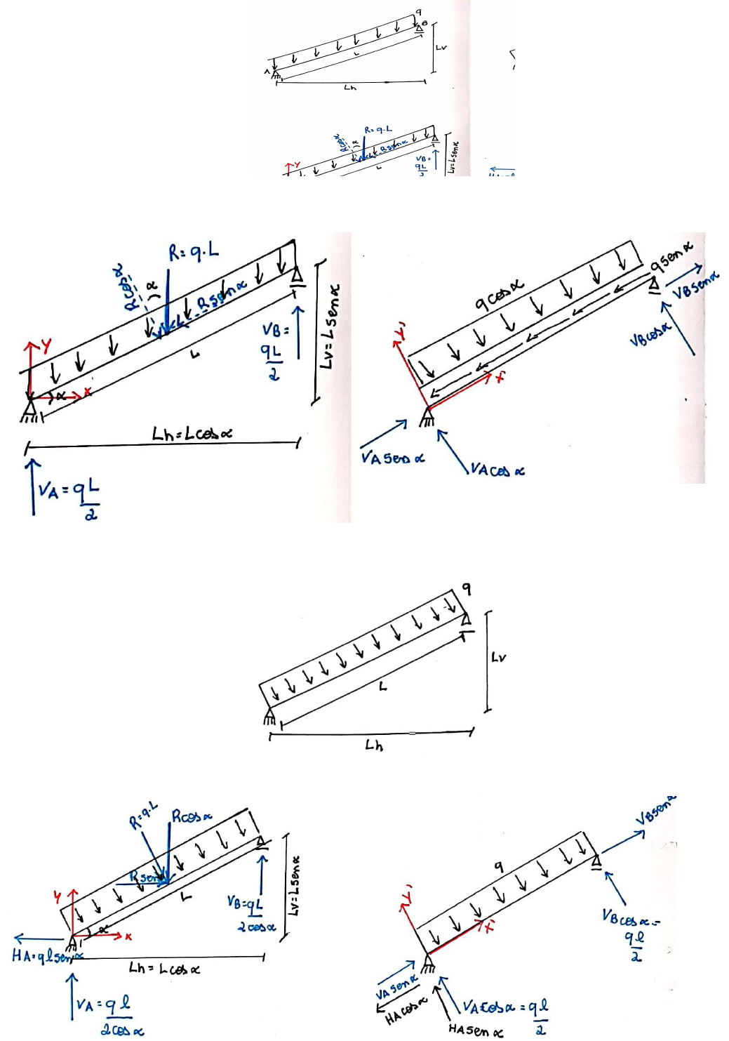 CARREGAMENTO DISTRIBUÍDO AO LONGO DA VIGA INCLINADA · Decomposição no eixo global para cálculo das reações de apoio. · Decomposição no eixo local para cálculo dos esforços internos. CARREGAMENTO DISTRIBUÍDO AO LONGO DO EIXO DA VIGA – PERPENDICULAR AO EIXO DA VIGA · Decomposição no eixo global para cálculo das reações de apoio. · Decomposição no eixo local para cálculo dos esforços internos. CARREGAMENTO DISTRIBUÍDO AO LONGO DA PROJEÇÃO HORIZONTAL · Decomposição no eixo global para cálculo das reações de apoio. · Decomposição no eixo local para cálculo dos esforços internos. CARREGAMENTO DISTRIBUÍDO AO LONGO DA PROJEÇÃO VERTICAL · Decomposição no eixo global para cálculo das reações de apoio. · Decomposição no eixo local para cálculo dos esforços internos.