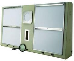 Câmara Clara É uma sala localizada ao lado da câmara escura e está exposta a todo tipo de luz. É o local onde os profissionais recebem as radiografias após o processamento para estudo das imagens. Acessório radiológico encontrado na Câmara Clara: Negatoscópio: Para visualização dos filmes após a revelação. Características: - Chapa de aço pintado nas cores bege ou cinza (universal); - Visor em acrílico branco de aspecto leitoso em sua face anterior; - Reator convencional ou de partida rápida (acendem mais rapidamente); - 02 Lâmpadas fluorescentes de 15 W; - Bivolt manual; - Luminância entre 3000 a 3500 nits, acendimento individual para cada corpo; - Prendedor de radiografias; O Negatoscópio é usado em pé, na mesa ou fixado na parede. Acompanha uma lupa para ampliação de pequenas estruturas. Seus tamanhos variam para acomodar de 1 (um) a 12 (doze) filmes, dependendo do tamanho, porém, na mamografia os negatoscópio são especiais, foram desenhados para visualizar imagens de 18 x 24 cm, que é o tamanho do filme para mamografia, as lâmpadas e os acrílicos são mais claros do que os dos raios-X convencionais, devido à dificuldade de diferenciação dos diversos tipos de tecidos mamários. (Figura 09). Figura 09: Negastoscópio para mamografia. Fonte: http://www.delgrandi.com.br/br/abre_produto.asp?id_produto=44 (Acesso em 08/04/2015). Chassi Radiográfico: são compartimentos onde se inserem os filmes virgens que serão irradiados. - Parte superior do chassi: é composta por alumínio e permite que os raios-X o atravessem. - Parte inferior: é composta por alumínio e revestida por chumbo (por onde os raios- X não conseguirão transpor). Possuem cantos em nylon alto impacto, travas plásticas com sistema push, espuma flexível especial garantido perfeito contato entre filme e écran e acabamento em pintura. O tamanho do chassi é equivalente ao tamanho do filme, exemplo, se o chassi é 18 x 24 cm, o tamanho do filme é 18 x 24 cm.