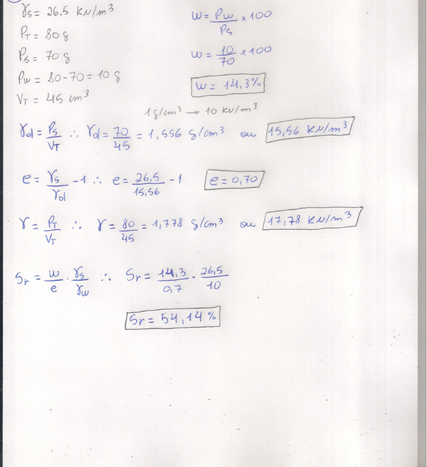 ATIVIDADE Uma amostra quartzosa típica tem 45 cm3 quando está úmida e pesa 80g. Depois de secada em estufa pesa 70g. Supondo um γs = 26,5 kN/m3, calcule w, Sr, e, γ, γd. A porosidade de uma areia é de 37% e o peso específico das partículas sólidas é igual a 26,5 kN/m3. Pede−se determinar: a) O seu índice de vazios; b) O seu peso específico seco; c) O seu peso específico quando Sr = 50% e d) O seu peso específico saturado.