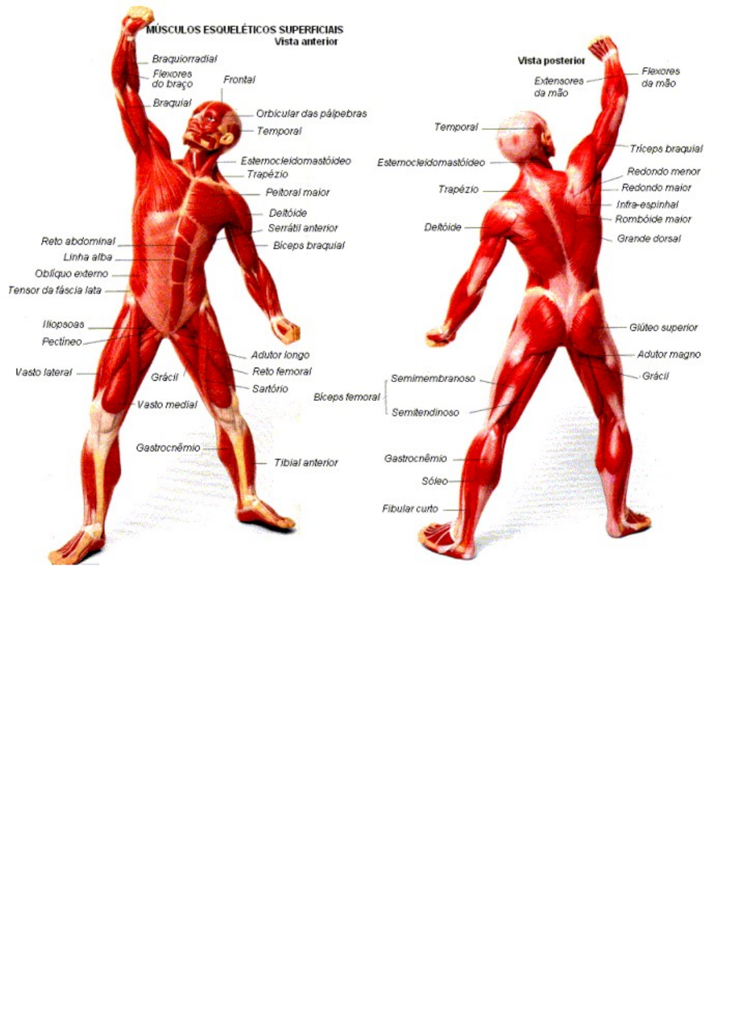 EXERCÍCIOS DE FIXAÇÃO 1. Quais são as funções do sistema muscular? 2. Cite os componentes de um músculo estriado esquelético. 3. Em uma atividade muscular sempre há a ação de 2 tipos de músculos. Quais são eles e qual a função de cada um para que ocorra um movimento? 4. Quais são os 3 tipos de músculos existentes no corpo humano e onde estão localizados? 5. Explique a diferença entre atrofia e hipertrofia. 6. Quais músculos formam o tórax e o abdome? 7. Cite 4 músculos dos membros inferiores. 8. Quais os músculos mais comuns na aplicação de injeções? 9. Cite 4 músculos dos membros superiores. 10. Complete com o nome do músculo: a. Flexiona o braço: b. Principal músculo da mastigação: c. Forma o couro cabeludo: d. Responsável pelo movimento giratório da cabeça: e. Principal músculo da respiração: Trabalho: Explique pra que serve e como funciona o ATP