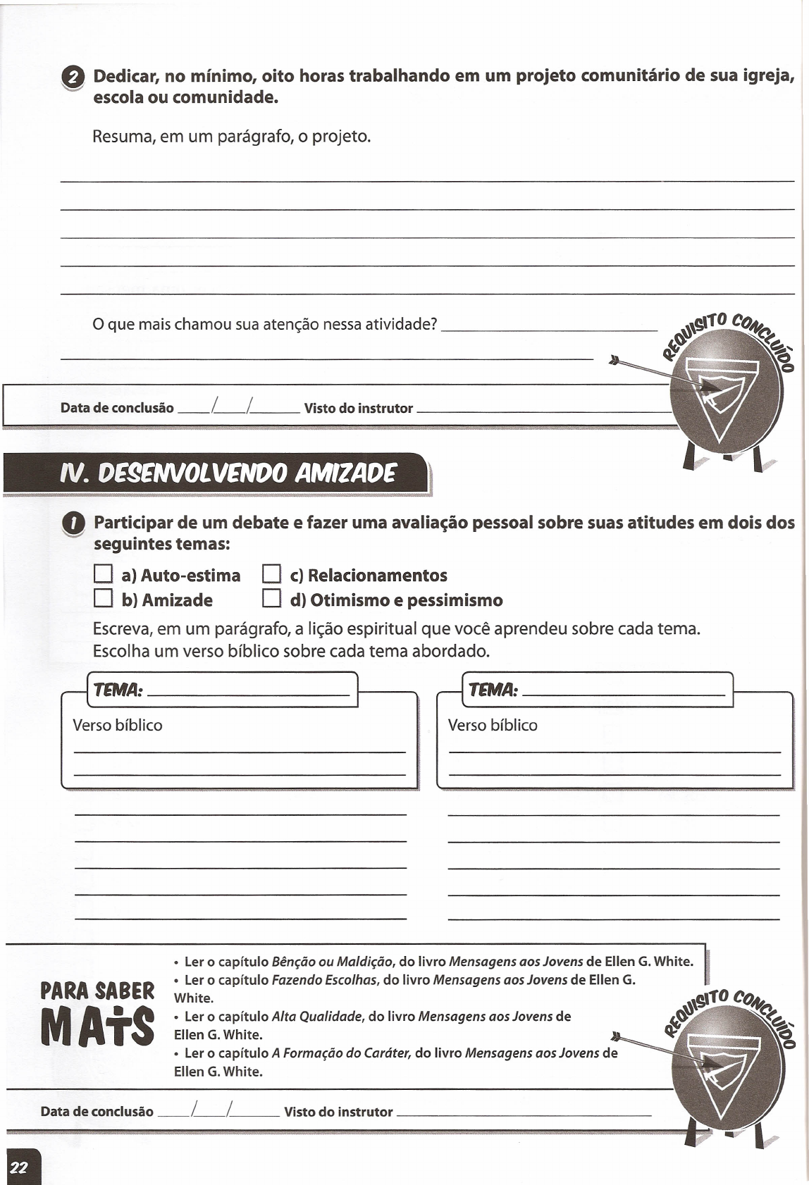 Q Dedicar, no mínimo, oito horas trabalhando em um projeto comunitário de sua igreja, ~ escola ou comunidade. ~A: ~--~ ~A: I---~ Resuma, em um parágrafo, o projeto. IV. DE9ENVOLVENDO AMIZADE l o que mais chamou sua atenção nessa atividade? _ Data de conclusão __ L__ L__ Visto do instrutor _ o Participar de um debate e fazer uma avaliação pessoal sobre suas atitudes em dois dos ~ .segumtes temas: O a}Auto-estima O c}Relacionamentos O b) Amizade O d) Otimismo e pessimismo Escreva, em um parágrafo, a lição espiritual que você aprendeu sobre cada tema. Escolha um verso bíblico sobre cada tema abordado. Verso bíblicoVerso bíblico PARA SABER MAtS • Ler o capítulo Bênção ou Maldição, do livro Mensagens aos Jovens de Ellen G. White. • Ler o capítulo Fazendo Escolhas, do livro Mensagens aos Jovens de Ellen G. White. • Ler o capítulo Alta Qualidade, do livro Mensagens aos Jovens de Ellen G. White. • Ler o capítulo A Formação do Caráter, do livro Mensagens aos Jovens de Ellen G. White. Data de conclusão __ L__ L__ Visto do instrutor _
