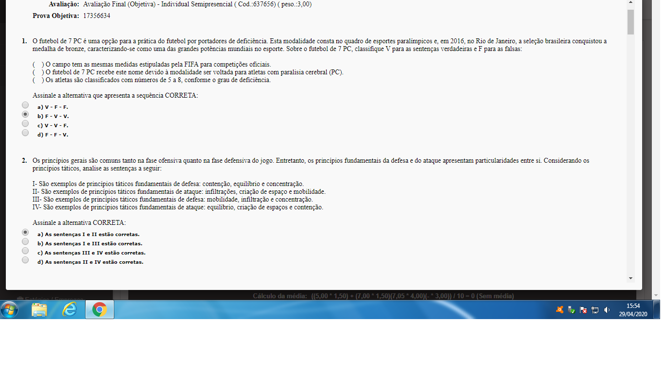 O futebol de 7 PC é uma opção para a prática do futebol por portadores de deficiência. Esta modalidade consta no quadro de esportes paralímpicos e, em 2016, no Rio de Janeiro a seleção brasileira conquistou a medalha de bronze caracterizando-se como uma das grandes potências mundiais no esporte. Sobre o futebol de 7 PC, classifique V para as sentenças verdadeiras e F para as falsas: O campo tem as mesmas medidas estipuladas pela FIFA para competições oficiais. O futebol de 7 PC recebe este nome devido à modalidade ser voltada para atletas com paralisia cerebral (PC). Os atletas são classificados com números de 5 a 8, conforme grau de deficiência. Assinale a alternativa que apresenta a sequência CORRETA: O campo tem as mesmas medidas estipuladas pela FIFA para competições oficiais. O futebol de 7 PC recebe este nome devido à modalidade ser voltada para atletas com paralisia cerebral (PC). Os atletas são classificados com números de 5 a 8, conforme grau de deficiência. a) F b) F V. c) V V F. d) F V.