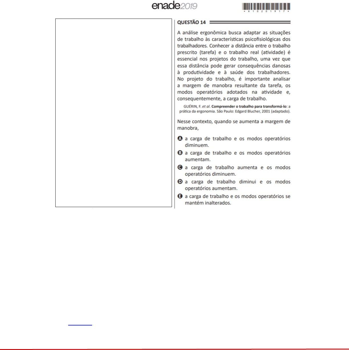 ERGONOMIA – DESAFIO ENADE - SOLUÇÃO TURMAS 6O E 6P Questão (1) Definir: “distância” entre trabalho prescrito e trabalho real Definir: “margem de “manobra” Definir: “carga de trabalho” Definir: “modos operatórios” Com base nas definições anteriores, responder e justificar a resposta da questão 14 ao lado (ENADE 2019) SOLUÇÃO Distância entre “Trabalho Prescrito e Trabalho Real” Trabalho prescrito (tarefa) é tudo aquilo que é definido antecipadamente pela organização e fornecido ao trabalhador para que o mesmo possa realizar o trabalho. Contrariamente, o trabalho real (atividade) é o trabalho tal como ele se realiza concretamente, mediante condições reais para esta execução. Entre o trabalho prescrito e o trabalho real se inscrevem múltiplas variabilidades relativas ao processo de trabalho (meios, matéria e atividade) e que não podem ser previamente antecipadas. É no espaço entre o trabalho prescrito e o trabalho efetivamente realizado que se inscreve a realidade da atividade humana em meios profissionais. Fonte: Laboreal versão On-line ISSN 1646-5237Laboreal vol.13 no.1 Porto jul. 2017 http://dx.doi.org/10.15667/laborealxiii0117ep Margem de manobra Entre as tarefas prescritas pela organização de trabalho e a atividade realmente executada está a chamada “margem de manobra”, que permite aos trabalhadores reordenar as condições da própria execução e alterar o modo operatório para outro mais favorável à sua saúde. Fonte: Universidade Tecnológica Federal do Paraná - UTFPR Campus Ponta Grossa - Paraná - Brasil ISSN 1808-0448 / v. 04, n. 01: p. 101-115, 2008 D.O.I.: 10.3895/S1808-04482008000100007 Revista Gestão Industrial A ESTRATÉGIA OPERATÓRIA UTILIZADA PELOS TRABALHADORES E O HIATO EXISTENTE ENTRE O TRABALHO PRESCRITO E O TRABALHO REAL Carga de Trabalho Um dos principais objetivos da ergonomia é ter uma carga de trabalho adequada, buscando a melhoria dos níveis de conforto, satisfação, eficiência e segurança no trabalho, caso contrário, sua inadequação pode influenciar a saúde e segurança do trabalhador, além de afetar a organização. Diferentes conceitos descrevem o termo carga de trabalho. De maneira geral, Wickens, Gordon e Liu (1998) entendem a carga de trabalho como a razão entre o tempo requerido e o tempo real disponível para a realização das tarefas. Outros autores como Moraes e Mont'Alvão (2000) citam que fatores relacionados ao ambiente físico e aos subsistemas técnico e humano geram a carga de trabalho. Já Hart (1982) apud Corrêa (2003) explica a carga de trabalho como a interação de fatores internos e externos ao trabalhador, resultando em uma experiência subjetiva. Para Diniz e Guimarães (2004), a carga de trabalho é o termo usado para descrever o efeito que a demanda tem sobre o trabalhador, em termos de esforço mental e físico, relacionando a quantidade de informação processada e o esforço empregado para que a tarefa seja desempenhada. Embora tenham conceitos diferenciados, todos os autores parecem concordar que as tarefas (ou fatores ligados a ela) influenciam na geração da carga de trabalho. No entanto, é importante salientar que é uma avaliação sob o ponto de vista de quem executa a tarefa, e não da tarefa propriamente dita, uma vez que depende de características individuais (CORRÊA, 2003). Nesse caso, fatores que interferem na carga de trabalho, podendo aumentá-la ou diminuí-la, são o conhecimento do trabalhador e a sua experiência na atividade. Assim, é esperado que trabalhadores novatos tenham uma carga de trabalho mais elevada que os experientes, bem como espera-se que a fase de aprendizagem de novas tarefas exija uma carga de trabalho maior aos indivíduos do que as tarefas rotineiras (AMALBERTI, 1996). A carga de trabalho pode ainda se manifestar nos trabalhadores como uma sobrecarga ou uma subcarga. A sobrecarga de trabalho corresponde a uma saturação do consumo de recursos, enquanto a subcarga é resultante da ausência de estímulos para a realização da tarefa. Ambas acarretam problemas para o ser humano na realização de seu trabalho (AMALBERTI, 1996). Assim, conhecendo os fatores intervenientes na carga de trabalho, é possível prevenir possíveis sobrecargas ou subcargas no trabalho de cada um. Fonte: Production - Print version ISSN 0103-6513On-line version ISSN 1980-5411 Prod. vol.19 no.3 São Paulo 2009 https://doi.org/10.1590/S0103-65132009000300014 Avaliação da carga de trabalho dos operadores de uma empresa distribuidora de derivados de petróleo Modos Operatórios O modo operatório designa as atividades ou operações que devem ser executadas para se atingir o resultado final desejado, o objetivo da tarefa. Ele pode ser prescrito (ditado pela empresa) ou real (o modo particular adotado pelo trabalhador para fazer face à variabilidade acima mencionada). Fonte: http://www.unergo.org/uploads/2/5/5/7/25570883/aet_organiza%C3%87%C3%83o_do_trabalho_interpreta%C3%87%C3%83o_nr_17.pdf A partir da análise das definições, conclui-se que a alternativa D é a correta. Questão (2) Resolver a questão a seguir (ENADE 2017) SOLUÇÃO a) Queixas físicas: dificuldades de postura, problemas de iluminação inadequada, nível de ruídos, não existência de padrões ergonômicos nos móveis e equipamentos utilizados. b) AET (Análise Ergonômica do Trabalho) (fonte: slide apostila AET) Um grande conjunto de recomendações pode ser citado nesta resposta. O importante é sempre relacionar com as etapas de análise da tarefa e da atividade. c) Ferramentas de Apoio Normas ABNT (Requisitos técnicos para máquinas e equipamentos) QFD (Desdobramento da Função Qualidade) Engenharia e Análise do Valor FMEA – Análise do Modo e Efeito de Falhas Questão (3) a) Relacione as soluções apresentadas no enunciado da questão 32 ao lado (ENADE 2014) à aplicação de Análise do Valor (EAV). b) Resolva a questão 32, justificando sua resposta. SOLUÇÃO 