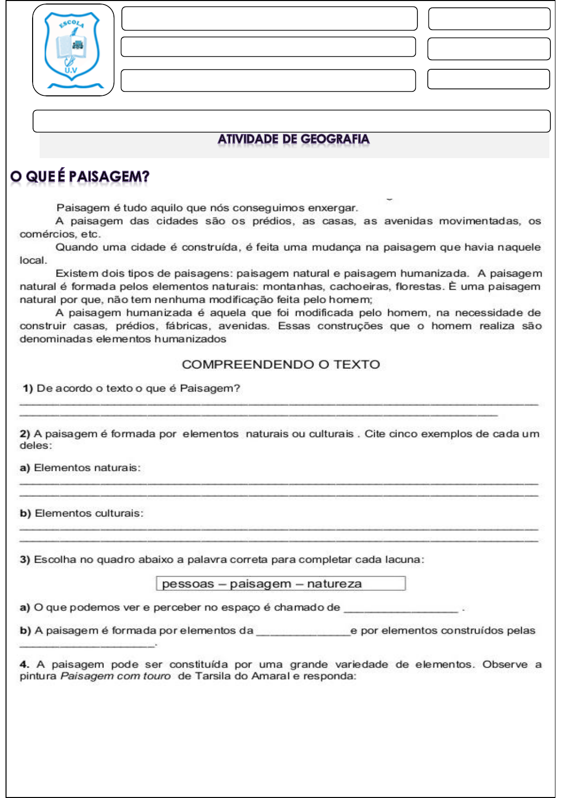 Escola Municipal Unidos dos Vale – Sítio do Mato Componente Curricular: Geografia Turma: 7º ANO A/B Valor: -------------- Aluno (a): Professora: Zenaide Oliveira Data: 28/04/2020 Turno: Mat/Vespert 7) O globo terrestre é uma forma de representação da Terra. Nele podemos observar as linhas imaginárias, importantes para o estabelecimento das coordenadas geográficas, que são medidas estabelecidas para localizar um ponto na superfície do planeta. Considerando as coordenadas geográficas, associe os termos listados na Coluna A aos conceitos apresentados na Coluna B. COLUNA A 1 latitude 2 longitude 3 paralelos 4 meridianos COLUNA B ( ) linhas imaginárias verticais que convergem para os pólos; ( ) linhas imaginárias cujo plano é perpendicular ao eixo de rotação da Terra ( ) distância, expressa em graus, cujo ponto inicial é Greenwich ( ) medida, em graus, que estabelece as coordenadas ao norte e ao sul Assinale a alternativa que preenche corretamente os parênteses da Coluna B, de cima para baixo. a) 1, 2, 3, 4 b) 1, 2, 4, 3 c) 4, 3, 2, 1 d) 3, 1, 2, 4 e) 3, 2, 1, 4 8) O planeta Terra é o _______________ do Sistema Solar mais próximo do sol, sendo classificado como um planeta ______________. A maior parte de sua superfície é composta por ______________ e sua camada externa é muito fina, recebendo a denominação de ____________________. Essa camada não é contínua, ao contrário do que ocorre em outros planetas, sendo segmentada em várias ___________________. Assinale a alternativa que completa corretamente as lacunas acima. a) quarto – rochoso – rochas – atmosfera – placas tectônicas b) terceiro – comum – rochas – crosta terrestre – formas de relevo c) quarto – Joviano – água – atmosfera – camadas de ar d) terceiro – rochoso – água – crosta terrestre – placas tectônicas
