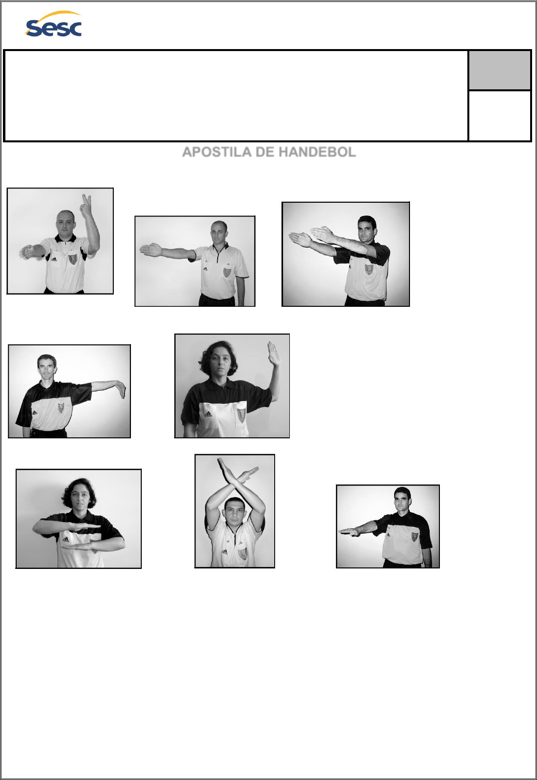 1 Centro Educacional Sesc Cidadania Ensino Médio APOSTILA DE HANDEBOL I. REGRAS E PENALIDADES DO HANDEBOL Exclusão 2 minutos. Tiro livre – direção Tiro lateral – direção. Tiro de meta Advertência jogo passivo Sobrepasso ou segurar a Exclusão Invasão de área bola por mais de 3 seg. Professor (a): Maura e Marcelo Disciplina: Educação Física Aluno (a):__________________________________________________________________________________ Série: ______Turma: ______ No. ______ Data: 04 / 03 /2019 2 Golpear Falta de ataque Gol Advertência (amarelo Deter, segurar ou empurrrar Manter distância de 3 metros Desqualificação (vermelho) Permissão para que duas Drible ilegal Jogo passivo pessoas autorizadas a participar entrem na quadra durante o “tempo” QUADRA DE JOGO 3 REGRAS DO JOGO 1. A área do goleiro e o goleiro Somente o goleiro tem o direito de permanecer em sua área. Quando um jogador de quadra entrar na área de gol deve-se tomar as seguintes decisões: a) tiro de meta, quando um jogador de quadra da equipe de posse de bola no ataque entrar na área de gol com a bola ou entrar sem a bola, mas ganhar vantagem ao fazê-lo. b) tiro livre, quando um jogador de quadra da equipe defensora entrar na área de gol e ganhar vantagem, mas não impede uma clara chance de gol. c) tiro de 7 metros, quando um jogador de quadra da equipe defensora entrar na área de gol e por isso impede uma clara chance de gol. Entrar na área de gol não será penalizado quando: a) um jogador entrar na área de gol depois de jogar a bola, desde que isto não crie uma desvantagem para os adversários; b) um jogador de uma das equipes entrar na área de gol sem a bola e não ganhar vantagem fazendo isto. É proibido a qualquer outro jogador tocar na bola que ali se encontrar, parada ou rolando ou mesmo com o próprio goleiro. O goleiro pode sair da sua área e jogar como qualquer jogador, desde que não tenha a bola em seu poder no momento da saída da área. Fora de sua área, o goleiro é considerado um jogador de quadra e está sujeito às mesmas regras que os demais. Pode voltar para a sua área a qualquer momento desde que esteja sem a bola. O goleiro pode tocar a bola com qualquer parte do corpo, sempre que estiver numa tentativa de defesa, dentro de sua área de gol. É permitido tocar a bola quando ela estiver no ar sobre a área de gol. Se um jogador lançar a bola dentro de sua própria área de gol, as decisões a tomar devem ser as seguintes: a) gol, se a bola entrar na baliza; b) tiro livre, se a bola ficar dentro da área de gol ou se o goleiro tocar a bola e ela não entrar na baliza. c) tiro de canto, se a bola sair pela linha de fundo; d) o jogo continua, se a bola passar através da área de gol e voltar para a área de jogo, sem ser tocada pelo goleiro. 2. Ao jogador é permitido: Utilizar braços e mãos para se apoderar da bola; Utilizar a mão aberta para tirar a bola do adversário (sem bater): Barrar com o tronco o caminho do adversário, mesmo que ele não esteja com a posse da bola. 3. As principais faltas do jogador são: Agarrar, empurrar, segurar o adversário; 4 Invadir a área do goleiro; Usar os pés para apossar-se da bola ou defender-se; Ficar com a bola na mão por mais de três segundos sem driblar; Dar mais de três passos sem driblar a bola; Tirar a bola da mão do adversário; Jogar-se sobre a bola que se encontra rolando na área de jogo. 4. Tiro de Lateral Quando a bola sai por uma das linhas laterais é sinalizado um tiro lateral. A bola será reposta em jogo por um jogador do time contrário a aquele que tocou por último na bola, colocando um ou os dois pés sobre a linha lateral, passando a bola para um companheiro. Se o jogador que cobra o lateral não colocar um pé sobre a linha lateral, o árbitro corrige-o. No Handebol, para cobrar qualquer penalidade o jogador não pode tirar o pé de apoio do chão. 5. Tiro Livre Na cobrança do tiro livre os jogadores da defesa podem ficar alinhados um ao lado do outro, com os braços levantados, formando uma barreira. Devem estar a uma distância igual ou superior a três metros em relação ao atacante com a bola. O tiro livre é cobrado da linha de tiro livre quando a infração ocorre nas imediações da área de goleiro. Pode ser executado sem esperar a autorização do árbitro e a formação da barreira. Porém, se o árbitro apitar, o arremesso deverá ser executado dentro do tempo de 3 (três) segundos. Caso se esgote o tempo, será cobrado tiro livre pelo adversário. Durante a execução do tiro livre, nenhum jogador da equipe que está de posse da bola poderá ficar entre a linha de gol e a linha de tiro livre. Além disso, ao jogador atacante não é permitido atirar a bola contra a barreira. O jogador poderá arremessar ao gol, por cima ou pelo lado da barreira, desde que não ameace a integridade física do adversário. Essas infrações são punidas com tiro livre. O tiro livre é aplicado quando o jogador: Toca a bola com os pés; Entra e sai irregularmente do campo; Maneja a bola irregularmente; Comete infrações nas imediações da área de gol; Agarra, empurra ou segura o adversário; Dá mais de três passos com a bola na mão sem driblá-la; Atira-se sobre a bola que está rolando colocando em risco a integridade física do adversário; Soca a bola para tirá-la do adversário. Infrações cometidas pelo goleiro também são punidas com tiro livre. 5 Quando as infrações não são cometidas nas imediações da área do goleiro o tiro livre é cobrado do local exato onde ocorreu a infração, porém continua valendo a regra de nenhum jogador da equipe que está de posse da bola ficar entre a linha de gol e a linha de tiro livre. 6. Tiro de Meta O tiro de meta é cobrado quando um adversário arremessa à baliza e a bola sai pela linha de fundo, tocada ou não pelo goleiro. Somente o goleiro pode executar o tiro de meta. O tiro de meta deve ser executado dentro da área de goleiro e durante o 