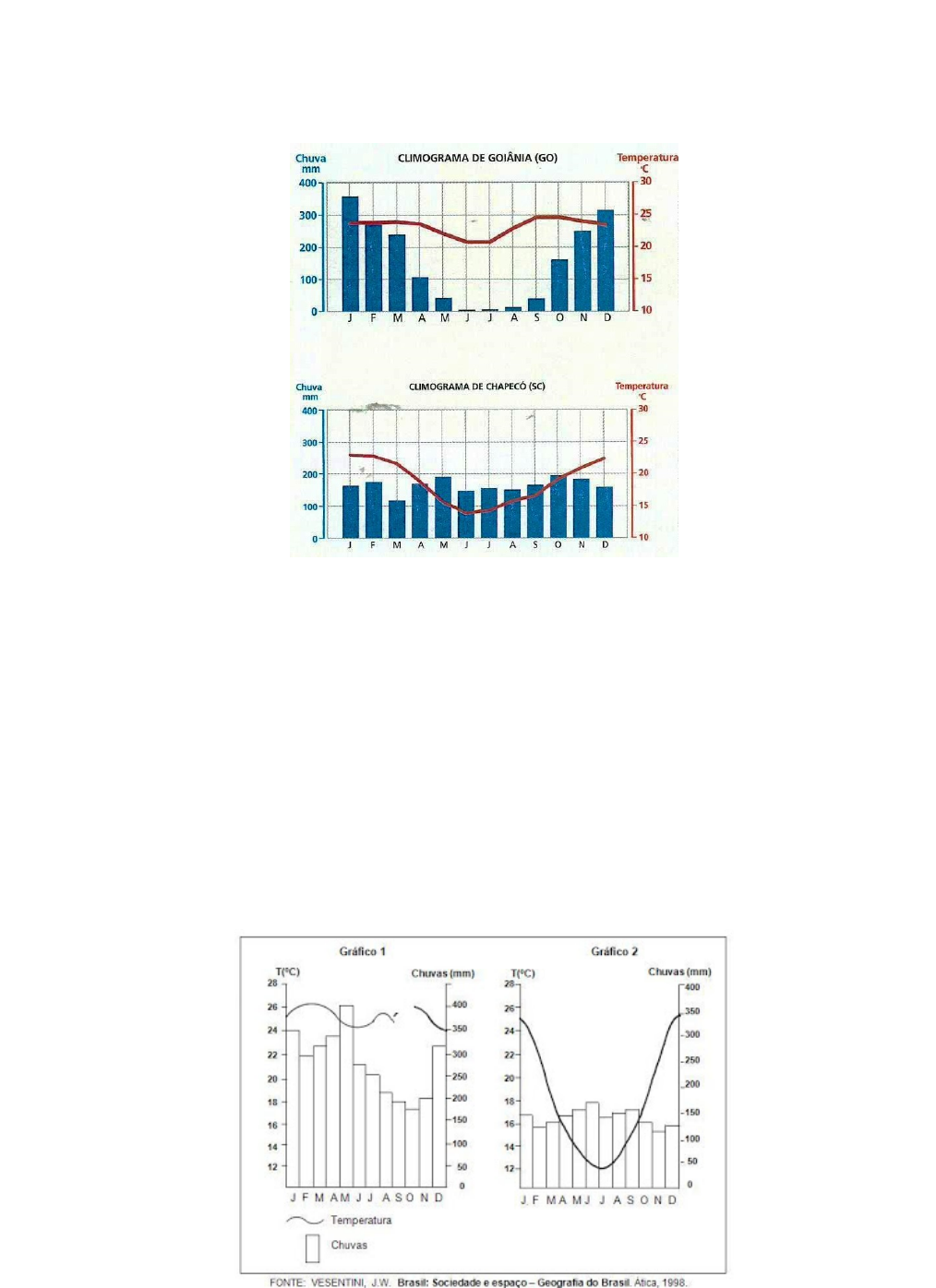 1- O climograma é um gráfico que mostra a chuva ou precipitação média, medida em milímetros (mm), e a temperatura média, medida em graus Celsius (°C), de um local ou região. A precipitação está representada nas colunas e a temperatura na linha. As letras sob as colunas indicam os meses do ano. Observe os climogramas a seguir e responda. a) Quais são os meses mais chuvosos em Goiânia? Em qual estação do ano ocorre o período de seca? Dezembro, janeiro e fevereiro. O período de estiagem ocorre no inverno. b) Em que meses ocorreram a maior e a menor temperatura em Chapecó? Em Chapecó, a maior média de temperatura é a de mês de janeiro (23°) e a menor média ocorre, geralmente, em julho. c) Que diferenças você observa entre as temperaturas médias de Chapecó e Goiânia? Em Goiânia, as temperaturas médias são mais elevadas e variam menos entre os meses de inverno e verão. Em Chapecó há maior amplitude térmica ao longo do ano. d) Que clima está representado no climograma de Chapecó? e no de Goiânia? Em Chapecó o clima é o subtropical. Em Goiânia ocorre o clima tropical. 2- Observe atentamente os dois climogramas e assinale “V” para as informações verdadeiras, e “F” para as frases falsas: a. ( ) O gráfico 1 representa uma cidade mais chuvosa do que a cidade representada no gráfico 2 b. ( ) O gráfico 1 apresenta grande amplitude térmica. c. ( ) O gráfico 2 apresenta grande amplitude térmica. d. ( ) O gráfico 2 representa uma localidade localizada no hemisfério sul. e. ( ) O gráfico 2 representa uma localidade localizada no hemisfério norte. f. ( ) A variação de temperatura é maior na localidade representada no gráfico 2. g. ( ) No gráfico 2, as chuvas são bem distribuídas ao longo do ano. h. ( ) Pode-se deduzir que os dados do gráfico 1 representam uma localidade do Sertão Nordestino, com clima semi-árido. i. ( ) As chuvas estão melhores distribuídas no gráfico 1. j. ( ) A temperatura está mais equilibrada, com poucas variações, ao longo do ano no gráfico 1. 3- Observe o climograma de Natal e, com base nele, complete o texto abaixo. Em grande parte da Região Nordeste, predomina o clima Tropical_____________ Em Natal, os meses mais frios foram _______________ e _________________ , com média térmica de ___ºC. As chuvas foram escassas e irregulares, com secas que se estenderam por mais de 6 meses. As chuvas só ultrapassaram os 100 mm nos meses de ________________, _________________ , ____________ e _______________. A formação vegetal que predomina nesta região é a _______________ e o mês mais chuvoso de todos é Abril, com precipitações que chegam a ____mm. 4- Observe o climograma abaixo e depois responda as questões: a) A qual clima existente no Brasil o climograma acima pode estar associado? a) Tropical. b) Tropical de Altitude. c) Subtropical. d) Equatorial. Justifique sua resposta. 5- Com base nas informações abaixo, construa um climograma da cidade de fictícia de “Verdes Mares”, do ano de 2009: Mês Temperatura (ºC) Precipitação (mm) Janeiro 23 75 Fevereiro 22 75 Março 19 90 Abril 15 50 Maio 11 30 Junho 8 15 Julho 8 20 Agosto 10 25 Setembro 12 40 Outubro 15 70 Novembro 19 100 Dezembro 22 90