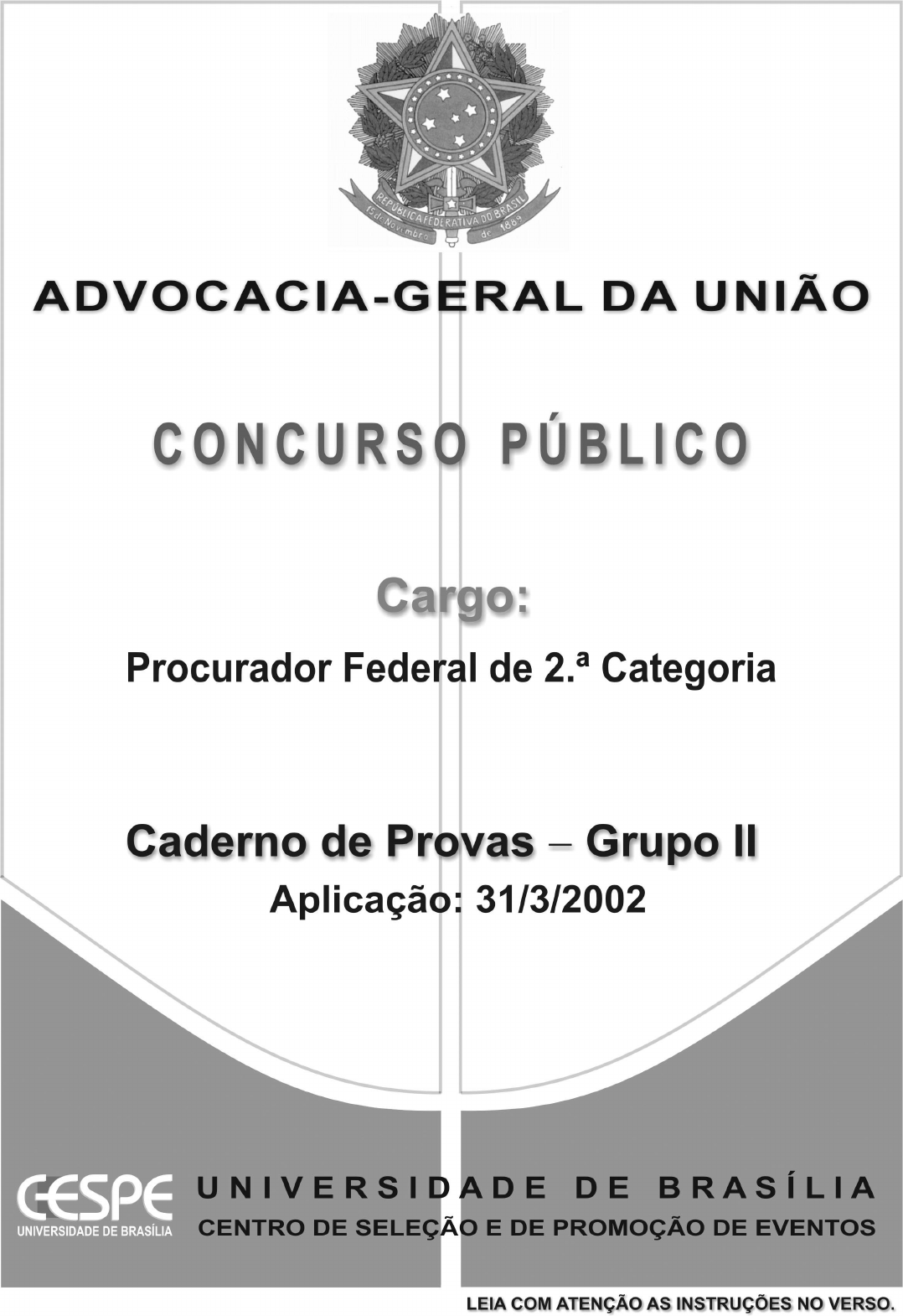 ADVOCACIA-GERAL DA UNIÃO Concurso Público – Aplicação: 31/3/2002 CARGO: PROCURADOR FEDERAL DE 2.ª CATEGORIA INSTRUÇÕES 1 Este caderno consta das provas do Grupo II. 2 Caso o caderno esteja incompleto ou tenha qualquer defeito, o candidato deverá solicitar ao fiscal de sala mais próximo que tome as providências cabíveis. 3 Na prova objetiva, recomenda-se não marcar ao acaso: cada item cuja resposta divirja do gabarito oficial definitivo acarretará a perda de 0,20 ponto, conforme consta no Edital n.o 1/2002 – CESPE/UnB, de 1.º/2/2002. 4 Não é permitida a utilização de nenhum material de consulta que não seja fornecido pelo CESPE. 5 Durante as provas, o candidato não deverá levantar-se ou comunicar-se com outros candidatos. 6 A duração das provas é de cinco horas e trinta minutos, já incluído o tempo destinado à identificação — que será feita no decorrer das provas —, ao preenchimento da Folha de Respostas e à transcrição do texto definitivo da prova discursiva para a respectiva folha, nos locais apropriados. 7 A desobediência a qualquer uma das determinações constantes nas presentes Instruções, na Folha de Rascunho, na Folha de Respostas ou na Folha de Texto Definitivo poderá implicar a anulação das provas do candidato. AGENDA I 2/4/2002 – Divulgação dos gabaritos oficiais preliminares das provas objetivas na Internet — no endereço eletrônico http://www.cespe.unb.br — e nos quadros de avisos do CESPE/UnB —, em Brasília. II 3 e 4/4/2002 – Recebimento de recursos contra os gabaritos oficiais preliminares das provas objetivas exclusivamente nos locais que serão informados na divulgação desses gabaritos. III 15/5/2002 – Data provável da divulgação (após a apreciação de eventuais recursos), no Diário Oficial da União e nos locais mencionados no item I, do resultado final das provas objetivas e do resultado provisório da prova discursiva. Observações: • Não serão objeto de conhecimento recursos em desacordo com o estabelecido no item 11 DOS RECURSOS do Edital n.o 1/2002 – CESPE/UnB, de 1.º/2/2002. • Informações relativas ao concurso poderão ser obtidas pelo telefone 0(XX)–61–448–0100. • É permitida a reprodução deste material, desde que citada a fonte. UnB / CESPE – AGU Grupo II Concurso Público – Aplicação: 31/3/2002 Cargo: Procurador Federal de 2.ª Categoria – 1 / 12 É permitida a reprodução, desde que citada a fonte. ADVOCACIA-GERAL DA UNIÃO Concurso Público – Aplicação: 31/3/2002 CARGO: PROCURADOR FEDERAL DE 2.ª CATEGORIA GRUPO II Nas questões de 43 a 70, marque, de acordo com o comando de cada uma delas: itens CERTOS na coluna C; itens ERRADOS na coluna E. Na Folha de Respostas, a indicação do campo SR servirá somente para caracterizar que o candidato desconhece a resposta correta; portanto, a sua marcação não implicará apenação ao candidato. Use a Folha de Rascunho para as devidas marcações e, posteriormente, a Folha de Respostas. Texto I – questões 43 e 44 Nas sociedades contemporâneas, ocorre um processo de1 retirar da própria regra sua nitidez, sua precisão. De um lado, os agentes se reportam a ela como se suas próprias ações sempre tivessem um lado excepcional, como se aquilo que fizeram não4 viesse a ser bem o caso da regra. Mas, de outro, e isso é mais importante, as regras e as instituições de vigilância oscilam em relação aos casos a que se aplicam, como se seus sentidos7 fossem sempre relaxados, passíveis de interpretações desviantes. A impunidade que daí deriva não está ligada, pois, a diferenças sociais que impliquem que nem todos sejam iguais perante a lei,10 mas tão-só a que todos se submetem a ela como se vestissem roupas muito maiores que as devidas. A sociedade moderna é democraticamente relaxada. 13 Por isso não me satisfaz designá-la como sociedade do espetáculo. A tragédia clássica não seguia regras muito bem definidas? As imprecisões por que passam as regras que16 norteiam nossas condutas não estão atravessadas pela oposição entre essência e aparência, não formamos uma sociedade de sofistas, mas nos comportamos como se todos estivéssemos19 acometidos de astigmatismo, de tal modo que entre o real e a gramática que nos permite falar dele sempre se exerce um método de projeção em constante hipertrofia. É como se22 medíssemos uma distância com metros de borracha, por meio de categorias topológicas, porquanto se relaxaram as regras de vigilância. Nessas condições, em que o espaço público está25 poluído por vagas interpretações e por jurisprudências coniventes, vem a ser natural que os agentes se voltem para as esferas da vida íntima, onde eles próprios agem e vigiam suas28 próprias ações, recusando a mediação de terceiros. No entanto, nessa barbárie da indefinição, contra a qual o legalismo e o totalitarismo pretendem aparecer como os31 remédios mais eficazes, convém observar a riqueza de novos horizontes possíveis. Não é nesses caldos que também se desenvolvem os germes da liberdade? Mas, para isso, seria34 preciso que se armasse uma esfera da reflexão vigilante, capaz de espelhar todo esse processo segundo uma gramática de compensações ponderadas.37 José Arthur Giannotti. Folha de S. Paulo, “Mais!”, 3/3/2002, p. 9 (com adaptações). QUESTÃO 43 Em relação às inferências permitidas pelas idéias do texto I, julgue os itens a seguir. Ø Geralmente, as ações dos agentes sociais contemporâneos tendem a ser justificadas com um caráter de exceção às regras. Ù A impunidade que deriva da imprecisão das regras abrange de forma diferente os diversos transgressores, sempre de acordo com o segmento social ao qual pertencem. Ú A forma de vida moderna tem sido chamada de sociedade do espetáculo, porque obedece às regras estabelecidas pelos autores das tragédias clássicas, como Sófocles, Ésquilo e Eurípedes. Û O tecido das relações e instituições