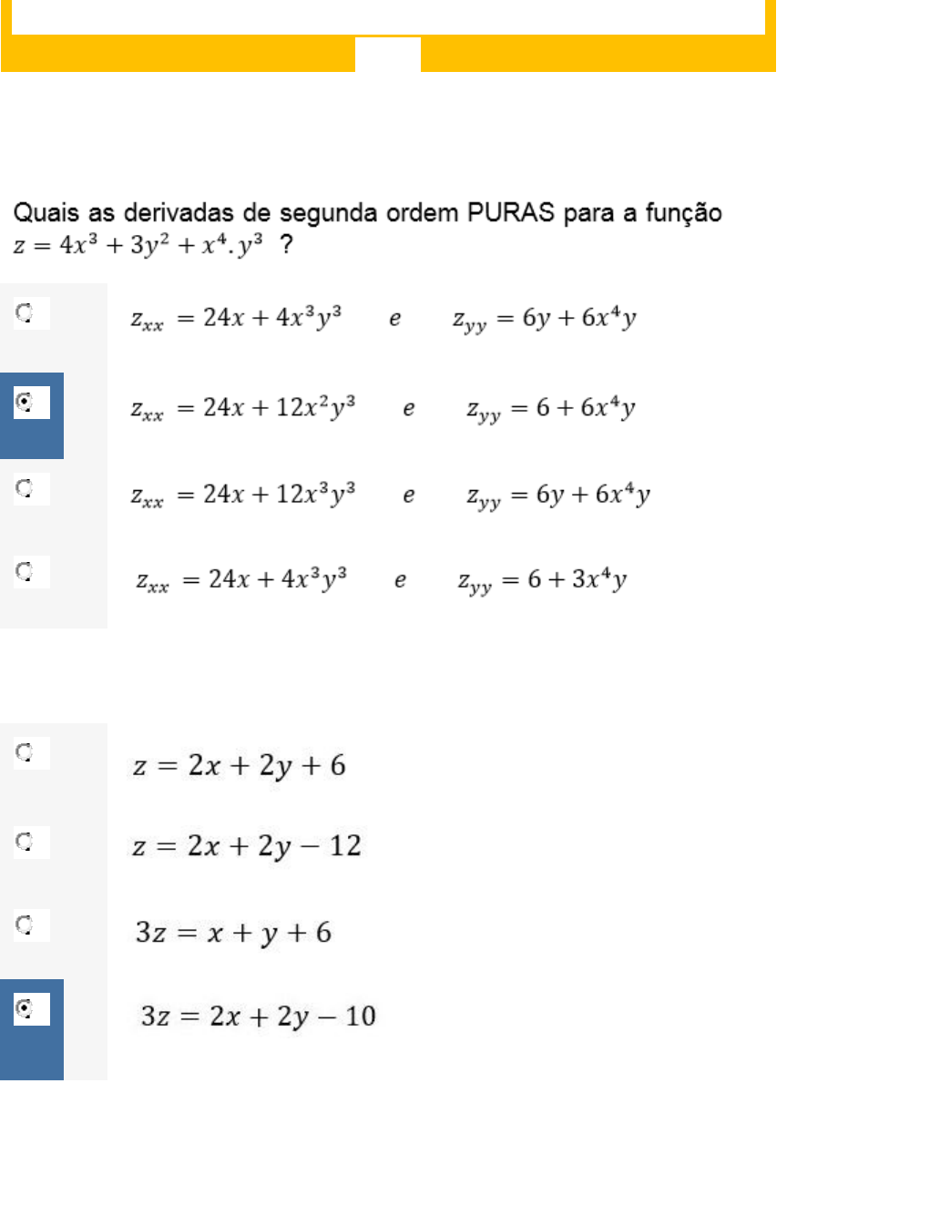 APOL 1 Cálculo Diferencial e Integral a Várias Variáveis 2020 NOTA : 100 Questão 1/10 - Cálculo Diferencial e Integral a Várias Variáveis . A . B . C . D . Questão 2/10 - Cálculo Diferencial e Integral a Várias Variáveis Calcule o plano tangente à superfície z2 x y + x z = 2 y no ponto P( 1 ; 1 ; -2 ) A . B . C . D . Questão 3/10 - Cálculo Diferencial e Integral a Várias Variáveis . A . B . C . D Questão 4/10 - Cálculo Diferencial e Integral a Várias Variáveis . A . B . C . D . Questão 5/10 - Cálculo Diferencial e Integral a Várias Variáveis Determine as derivadas parciais de primeira ordem para a função implícita A . B . C . D . Questão 6/10 - Cálculo Diferencial e Integral a Várias Variáveis Quais as primeiras derivadas de: A . B . C D . Questão 7/10 - Cálculo Diferencial e Integral a Várias Variáveis . A . B . C . D . Questão 8/10 - Cálculo Diferencial e Integral a Várias Variáveis . A . B . C . D . Questão 9/10 - Cálculo Diferencial e Integral a Várias Variáveis Calcular o plano tangente à superfície no ponto P( 2; 2; 2 ) A . B . C . D . Questão 10/10 - Cálculo Diferencial e Integral a Várias Variáveis . A . B . C . D .