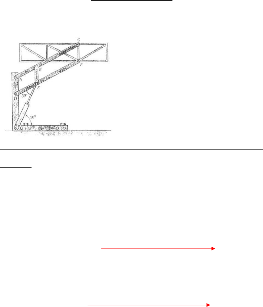 Universidade Federal da Bahia Faculdade de Arquitetura ARQA21 – Prof. Dr. Alberto Leal Aula 02 – Exercício 03 O cilindro hidráulico GE aplica à haste DF uma força P dirigida ao longo da reta GE. Sabendo que P deve ter uma componente de 600 N na direção perpendicular a DF, determine: − Intensidade de P. − Componente paralela a DF. 1º Passo: Determinação da intensidade e orientação da força resultante através da abordagem vetorial. − A força resultante está inclinada 30º em relação ao segmento DF. − A componente da força perpendicular a DF é dada por �⃗� �̅� = 𝑃 ∙ 𝑠𝑒𝑛30𝑜 𝑧 . − Considera-se 𝑧 como o versor perpendicular ao vetor 𝐷𝐹⃗⃗⃗⃗ ⃗. �⃗� �̅� = 𝑃 ∙ 𝑠𝑒𝑛 30 𝑜 𝑧 = 600 𝑧 𝑃 = 1.200 𝑁 − Sabendo que a componente na direção paralela ao vetor 𝐷𝐹⃗⃗⃗⃗ ⃗ é dada por �⃗� �̅� = 𝑃 ∙ 𝑐𝑜𝑠 30 𝑜 𝑡 , é possível afirmar que: �⃗� �̅� = 1.200 ∙ cos 30 𝑜 𝑡 �⃗� �̅� = 1.039,23 𝑡 − O versor 𝑡 é paralelo ao segmento de reta DF.