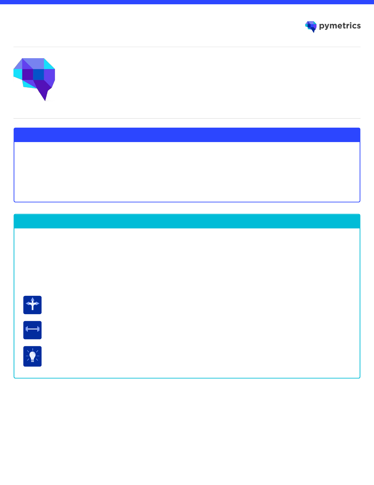 Perfil pymetrics Geilson Silva 100.000+ pontos de dados coletados enquanto candidatos e funcionários atuais jogam 9 categorias agregadas a partir de seus resultados em todos os jogos pymetrics 1 perfis pymetrics exclusivos por pessoa usados para se candidatar a qualquer função em qualquer empresa com o pymetrics COMO SEU PERFIL É USADO Seu perfil pymetrics descreve seus resultados cognitivos e emocionais e como você se compara à população em geral. Ele nunca será compartilhado diretamente com empregadores ou outros terceiros. Para uma candidatura de emprego específica, os resultados do candidato são comparados aos resultados dos funcionários existentes na função. Para funções diferentes, categorias diversas podem ser mais ou menos importantes para o sucesso, o que leva a um candidato indicado à essa função. ENTENDA SEUS RESULTADOS As categorias pymetrics avaliam tendências naturais estáveis, que não costumam mudar com o tempo. Por conta disto, seu perfil será salvo durante um ano, após o qual você terá a oportunidade de jogar novamente se desejar. Lembre-se, este é seu perfil personalizado e permanecerá o mesmo independentemente do cargo para o qual você se candidatar. Originalidade é a medida de quanto você se destaca da população em geral dentro de uma categoria pymetrics. Estas são as suas categorias mais originais: TOMADA DE DECISÃO: Você costuma dedicar tempo para refletir antes de tomar decisões, em vez de usar seu instinto. É provável que você também seja um planejador meticuloso que pensa bem antes de reagir a uma situação. ESFORÇO: Você costuma trabalhar com a mesma dedicação em todas as tarefas, independentemente da sua expectativa em relação à recompensa por conclui-las com êxito. APRENDIZADO: Você costuma abordar situações e tarefas de uma forma que é familiar para você, em vez de experimentar novos métodos. É provável que erros não afetem seu ritmo, e talvez você dedique tempo para considerar as opções antes de mudar sua abordagem a uma tarefa. Page 1 of 4 DETALHES DA CATEGORIA 1 TOMADA DE DECISÃO MAIS ORIGINAL DEFINIÇÃO A abordagem de uma pessoa à tomada de decisões. SEUS RESULTADOS Você costuma dedicar tempo para refletir antes de tomar decisões, em vez de usar seu instinto. É provável que você também seja um planejador meticuloso que pensa bem antes de reagir a uma situação. O QUE ISTO SIGNIFICA NO TRABALHO É provável que funções ou locais de trabalho que promovem e incentivam decisões e planejamentos lógicos e bem pensados sejam os mais adequados para você. COISAS A SEREM OBSERVADAS Observe as situações ambíguas em que não será possível reunir o máximo de informações desejadas. Nessas situações, às vezes uma decisão rápida é mais eficaz ou apropriada do que uma que leva mais tempo para considerar. 2 ESFORÇO MAIS ORIGINAL DEFINIÇÃO A abordagem de uma pessoa em relação ao esforço investido com base no tamanho da recompensa e na probabilidade de sucesso. SEUS RESULTADOS Você costuma trabalhar com a mesma dedicação em todas as tarefas, independentemente da sua expectativa em relação à recompensa por conclui-las com êxito. O QUE ISTO SIGNIFICA NO TRABALHO Você costuma a ser igualmente trabalhador, independentemente das recompensas. Por isso, talvez você trabalhe bem em ambientes onde recompensas e reconhecimento são pouco frequentes. COISAS A SEREM OBSERVADAS Trabalhar duro, independentemente da recompensa, pode ser útil, mas durante períodos de muito trabalho, convém investir menos tempo e esforço em tarefas menos importantes. Assim, você pode ter mais tempo para concluir atividades de trabalho mais importantes. 3 APRENDIZADO MAIS ORIGINAL DEFINIÇÃO A abordagem de uma pessoa à mudança de comportamento com base em novas informações. SEUS RESULTADOS Você costuma abordar situações e tarefas de uma forma que é familiar para você, em vez de experimentar novos métodos. É provável que erros não afetem seu ritmo, e talvez você dedique tempo para considerar as opções antes de mudar sua abordagem a uma tarefa. O QUE ISTO SIGNIFICA NO TRABALHO Para você, talvez seja mais adequado trabalhar em ambientes onde as tarefas são consistentes ou rotineiras. COISAS A SEREM OBSERVADAS Adotar uma abordagem consistente às tarefas e não se deixar intimidar ao cometer erros pode ajudar você a conclui-las com eficiência. Preste atenção a momentos em que tentar uma nova maneira de trabalhar pode levar a resultados vantajosos. Page 2 of 4 DETALHES DA CATEGORIA 4 FOCO DEFINIÇÃO A tendência de uma pessoa de se concentrar em uma ou mais tarefas. SEUS RESULTADOS Você costuma pensar de forma rápida e lidar facilmente com as mudanças no ambiente. Além disso, talvez você trabalhe em várias tarefas ao mesmo tempo, adaptando-se a mudanças nas circunstâncias com eficiência. O QUE ISTO SIGNIFICA NO TRABALHO Para você, talvez seja mais adequado trabalhar em ambientes dinâmicos e em constante movimento, onde a abordagem preferida para concluir o trabalho e as prioridades mudam frequentemente. COISAS A SEREM OBSERVADAS Nas situações em que se concentra apenas em uma tarefa por um longo período de tempo, em geral você fica distraído. É possível equilibrar isso fazendo intervalos regulares e encontrando maneiras de tornar a tarefa mais envolvente. 5 ATENÇÃO DEFINIÇÃO A abordagem de uma pessoa ao gerenciamento de distrações e informações recebidas. SEUS RESULTADOS Você não costuma ser facilmente perturbado por erros e consegue manter o ritmo até concluir uma tarefa. Você também costuma reagir e responder rapidamente a informações não relacionadas à tarefa em que está trabalhando. O QUE ISTO SIGNIFICA NO TRABALHO É provável que você costume mudar rapidamente entre tarefas, fazendo várias coisas ao mesmo tempo. Para você, talvez seja mais adequado trabalhar em ambientes onde o mais importante é a rapidez para concluir tarefas. COISAS 