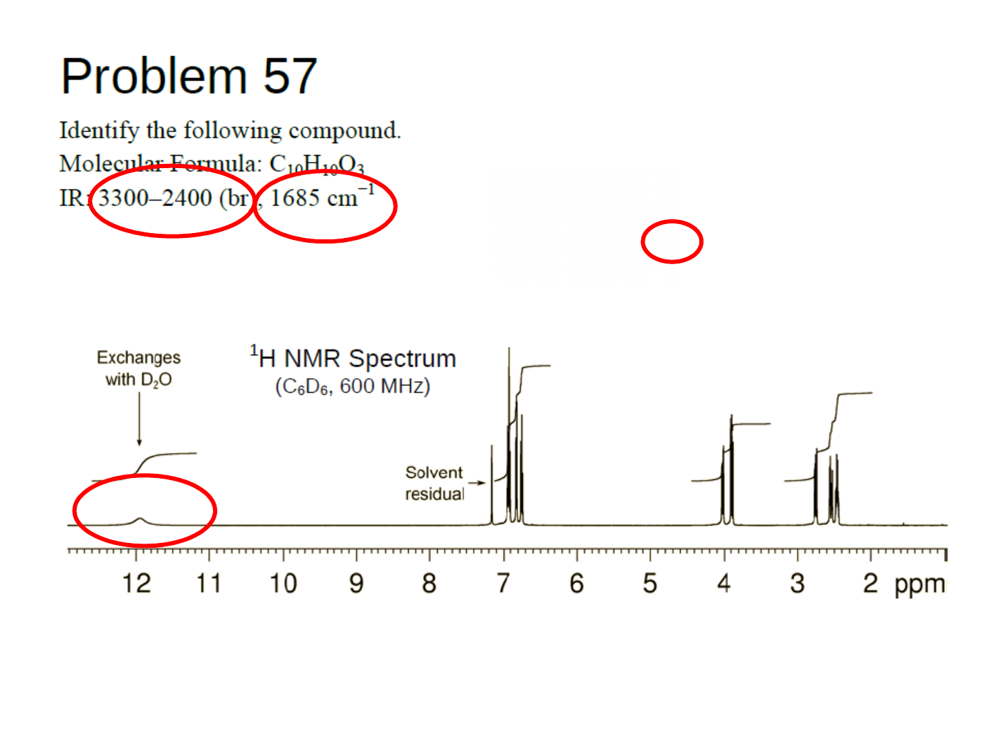 1 IDH= 10-5+1 = 6 ligações duplas Suspeita de anel aromático Espectro de 1H Sinais entre 6,7 – 6,95 ppm (tripletos e dubletos)( Aromático); Sinais em 4,05 ppm (dt) e 3,9 ppm (dd) – Sinais em 2,75 ppm(dd), 2,52 ppm(dd) e 2,54 ppm(multipleto). 2 3 Espectro de 13C Sinais em 179 ppm – Carbonila; Sinais em 154 ppm – carbono sp2 ligado a oxigênio; Sinais entre 117 – 130 ppm – Carbono de anel aromático; Sinais em 67 ppm Carbono ligado a oxigênio; Sinais em 38 ppm e 28 ppm – carbono sp3 – CH,CH2 ou CH3. 4 Espectro de 13C ¹H δ (ppm) Tipo de sinal A 2,48 multipleto B1 2,55 dd B2 2,75 dd C1 3,9 dd C2 4,05 dt D 6,75 t E 6,82 d F 6,91 d G 6,93 t H 11,9 S 5 ¹³C δ (ppm) 1 28 2 38 3 67 4 117 5 119,5 6 120 7 128 8 130 9 154 10 179 6 Espectro de 13C 7 ¹H-¹H COSY H Acoplando com A B1 e B2 ; C1 e C2 B1 A B2 A C1 A C2 A D E F A B2 B1 F E C2 C1 D G 8 ¹H-¹H COSY H Acoplando com A B1 e B2 ; C1 e C2 B1 A B2 A C1 A C2 A D E E D;F F E; G G F A B2 B1 F E C2 C1 D G 8 9 ¹H -13C me-HSQC A B2 C1 B1 C1 C2 C2 C3 H Ligado ao C A 2 B1 1 B2 1 C1 3 C2 3 D E F G 10 ¹H -13C me-HSQC C5 C8 C7 C6 C4 D E F G H Ligado ao C A 2 B1 1 B2 1 C1 3 C2 3 D 6 E 8 F 4 G 7 11 ¹H δ (ppm) Ligado ao C Com δ (ppm) A 2,48 2 38 B1 2,55 1 28 B2 2,75 1 28 C1 3,9 3 67 C2 4,05 3 67 D 6,75 6 120 E 6,82 8 130 F 6,91 4 117 G 6,93 7 128 H 11,9 - - - - 5 119,5 - - 9 154 - - 10 179 12 Estruturas possíveis: 13 Estruturas possíveis: IDH: 6 14 ¹H -13C HMBC C7 C3 C2 C1 C6 C5 C4 C10 C9 C8 A C2 C1 B2 B1 A 2 lig 3lig 2 3 5 10 15 ¹H -13C HMBC C7 C3 C2 C1 C6 C5 C4 C10 C9 C8 A C2 C1 B2 B1 C7 B1 e B2 2 lig 3lig 5 2 4 9 10 16 ¹H -13C HMBC C7 C3 C2 C1 C6 C5 C4 C10 C9 C8 A C2 C1 B2 B1 C7 C1 e C2 2 lig 3lig 5 2 4 9 10 17 ¹H -13C HMBC C7 C6 C5 C4 C9 C8 D G F E D 2 lig 3lig 5 8 4 9 18 ¹H -13C HMBC C7 C6 C5 C4 C9 C8 D G F E E 2 lig 3 lig 5 7 19 ¹H -13C HMBC C7 C6 C5 C4 C9 C8 D G F E F 2 lig 3 lig 6 9 20 ¹H -13C HMBC C7 C6 C5 C4 C9 C8 D G F E G 2 lig 3 lig 8 9 21 ¹H -13C HMBC C7 C6 C5 C4 C9 C8 C2 A C1 B1 B2 22 ¹H -13C HMBC C7 C6 C5 C4 C9 C8 C2 A C1 B1 B2 23 ¹H -13C HMBC C7 C6 C5 C4 C9 C8 C2 A C1 B1 B2 24 Ácido 3,4-diidro-2H-benzopirano-3-carboxílico RO O H HOC H CH 3 CH CH 2 H C C C A R' R R" C 2 C 1 B 1 B 2 D E F G C 2 C 3 C 1 A R' R O C 2 C 1 B 1 B 2 R" C 8 C 4 C 7 C 9 C 5 C 6 R R' D E F G R C 10 O O H 8 4 7 9 5 6 D E F G O 3 2 110 O O H B 1 B 2 A C 1 C 2 8 4 7 9 5 6 D E F G O 3 2 110 O O H B 1 B 2 A C 1 C 2 8 4 7 9 5 6 D E F G O 3 2 110 O O H B 1 B 2 A C 1 C 2 8 4 7 9 5 6 D E F G O 3 2 110 O O H B 1 B 2 A C 1 C 2
