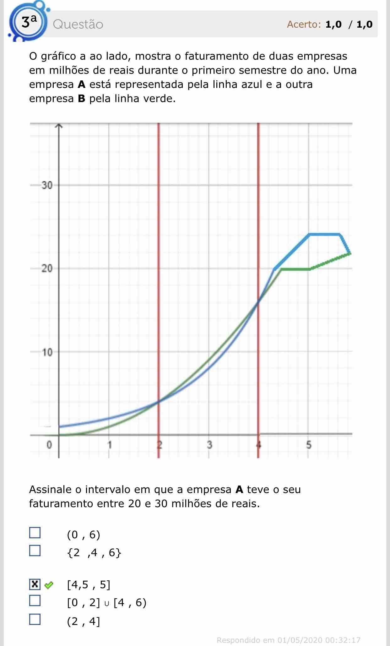 o gráfico mostra o faturamento de duas empresas, A e B em milhões de reais (eixo y) durante o primeiro semestre do ano (eixo x)...