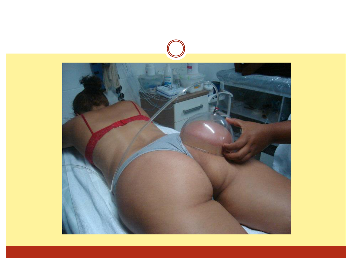 Dermotonia Histórico da Ventosaterapia Podemos conceituar ventosaterapia como método de tratamento milenar utilizado por chineses e egípcios, aperfeiçoado pela Medicina tradicional chinesa, trazendo, com isso, grandes benefícios à humanidade ao longo dos anos. Histórico da Ventosaterapia Os antigos egípcios foram os primeiros a fazer uso sistemático das ventosas. Evers Papyrus, considerado o texto médico mais antigo, de 1.550 a. c., descreveu sangrias por meio de ventosas para "remover a matéria estranha do corpo Primeiros Instrumentos Primeiros Instrumentos Dermotonia A principal diferença entre a ventosaterapia e a dermotonia e a introdução de uma bomba de sucção. O aparelho utilizado para a aplicação da dermotonia possui uma bomba de sucção, geradora da pressão negativa. Essa bomba nos permite, por meio de um equipamento programado e controlado por um vacuômetro e/ou manômetro, modular a pressão em unidades de mmHg. Dermotonia - Equipamento Ventosas de plástico (ou polipropileno) Ventosas confeccionadas de vidro. Dermotonia - Equipamento Dermotonia A dermotonia é um método de tratamento que utiliza a depressomassagem sob três formas: • Depressomassagem pulsada (DMP) • Depressomassagem contínua (DMC) • Depressodrenagem linfática (DDL) Depressomassagem pulsada (DMP) O tratamento é realizado com uma frequência de ventosagem. O cabeçote de massagem é aplicado durante aproximadamente dois segundos e realiza um bombeamento da microcirculação. Permite uma estimulação eficaz dos linfonodos linfáticos. Depressomassagem contínua (DMC) A ventosagem aplicada sobre toda a superfície. O sentido de aplicação corresponde ao objetivo terapêutico desejado, pois os traços longitudinais apresentam efeitos predominantemente circulatórios, os traços transversais têm efeito descontraturantes e os movimentos circulares realizam um amaciamento das zonas de fibrose e descongestiona o tecido profundo. A intensidade deverá permanecer de 100 mmHg a 250 mmHg. Depressodrenagem linfática (DDL) A ventosagem aplicada sobre toda a superfície, porém o método é fraco, e a pressão é de 30 mmHg a 60 mmHg. Nesse caso, ocorre uma drenagem linfática de qualidade sobre os trajetos linfáticos. Depressomassagem Efeitos Fisiológicos e Terapêuticas A força de aspiração das ventosas é particularmente eficaz na remoção de infiltrado subcutâneo, dos líquidos intersticiais e nódulos da hipoderme, aumentando a irrigação sanguínea dos músculos e tecidos, melhorando assim a nutrição e as trocas metabólicas. Os benefícios obtidos incluem uma hiper-vascularização, hiper-oxigenação, drenagem do líquido intersticial e linfático, e relaxamento muscular. INDICAÇÕES Dermotonia Drenagem Linfática Depressomassagem pulsada sobre a região dos linfonodos (manobra de abertura): coloca-se a ventosa sobre a região dos linfonodos, sem executarmos o deslizamento (utiliza-se normalmente uma pressão máxima entre 600 mmHg e 700 mmHg). Depressomassagem contínua sobre todos trajetos linfáticos na direção da ação clássica de reabsorção da linfa; a pressão não deverá ultrapassar 60 mmHg. Repete-se o primeiro passo (manobra de fechamento). Envelhecimento cutâneo - Rugas Depressomassagem Contínua – realizando uma esfoliação, por toda face, pescoço, colo; (A camada córnea precisa estar livre das células descamantes para poder bem desempenhar o seu papel de regulação e hidratação). Depressomassagem Pulsátil – Movimentos de estimulação cutânea, restaura a microcirculação cutânea, estimula a atividade dos fibroblastos e melhora a flexibilidade da pele. Depressodrenagem Linfática estimula os traços vasculares, drenando os exudatos metabólicos (melhorando a cor da pele) e realiza um “alisamento” cutâneo. Lipodistrofia Ginóide - Celulite Depressomassagem Pulsátil => Descongestionar zonas lipodistróficas Depressomassagem Contínua => Provoca hiperemia a fim de obter um efeito lipolitíco sobre as lipodistrofias Depressomassagem Pulsátil => Manobra de abertura das regiões ganglionares Depressodrenagem Linfática => Atrair a linfa na direção dos coletores linfáticos Depressomassagem Pulsátil => Manobra de fechamento das regiões ganglionares Estrias Depressomassagem Pulsátil - ao redor da região com estria Depressomassagem Contínua - sobre a estria melhor troficidade da cicatriz atrófica. Pela estimulação dos fibroblastos, origem reconstrução do colágeno e fibras elásticas. Quelóides e Cicatrizes Hipertróficas Depressomassagem pulsada nas bordas cicatriciais na pressão máxima por 10 segundos. Depressomassagem contínua sobre todos os trajetos cicatriciais, a pressão depende da sensibilidade de cada paciente, até obtermos uma hepiremia. Lipoaspiração Lipoaspiração Queimadura