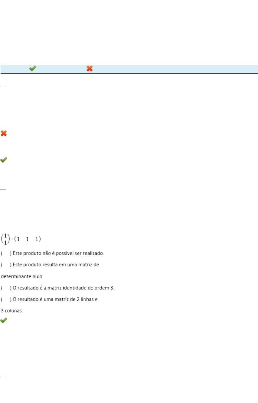 Geometria Analítica e Álgebra Vetorial (EMC02) Avaliação: Avaliação I - Individual FLEX ( Cod.:512315) ( peso.:1,50) Prova: 16762867 Nota da Prova: 8,00 Legenda: Resposta Certa Sua Resposta Errada Parte superior do formulário 1. As propriedades dos determinantes permitem que possamos realizar diversos cálculos sem a necessidade de operacionalizá-los. Um exemplo disso é o fato em que se o determinante de uma matriz A qualquer é igual a 5, se multiplicarmos uma linha da matriz por 2, o determinante da nova matriz passa a ser igual a 10. Visto isso, seja A uma matriz quadrada de ordem 2 e B uma matriz quadrada de ordem 3, tais que detA . detB = 1, o valor de det(3A) . det(2B) é: a) 6. b) 36. c) 5. d) 72. 2. Ao realizar o produto entre duas matrizes, devemos saber que o produto de uma matriz por outra não é determinado por meio do produto dos seus respectivos elementos. Precisamos realizar a verificação da possibilidade de resolução procedendo a análise das ordens das matrizes envolvidas. Baseado nisso, a partir do produto colocado a seguir, classifique V para as opções verdadeiras e F para as falsas e, em seguida, assinale a alternativa que apresenta a sequência CORRETA: a) F - F - F - V. b) F - F - V - F. c) V - F - F - F. d) F - V - F - F. 3. Para realizar a discussão de um sistema linear, devemos verificar se o sistema é SPD (possível e determinado), SPI (possível e indeterminado) ou SI (impossível). Com base no sistema apresentado, analise as opções a seguir e, em seguida, assinale a alternativa CORRETA: a) Somente a opção III está correta. b) Somente a opção IV está correta. c) Somente a opção II está correta. d) Somente a opção I está correta. 4. Ao estudar as propriedades dos determinantes, notamos que o seu resultado é alterado quando operamos com as suas linhas, realizando multiplicações por escalares e/ou combinando-as. Na situação a seguir, o determinante de uma matriz é 42. Se multiplicarmos a primeira linha da matriz por três e dividirmos sua segunda coluna por nove, a nova matriz terá determinante igual a? I- 14. II- 18. III- 36. IV- 42. Assinale a alternativa CORRETA: a) Somente a opção I está correta. b) Somente a opção II está correta. c) Somente a opção III está correta. d) Somente a opção IV está correta. 5. Muitas vezes, quando nos deparamos com algum valor desconhecido em um determinante, devemos resolver a equação mediante uma resolução de um determinante. Baseado nisso, seja a equação a seguir, analise as sentenças quanto ao seu conjunto solução e assinale a alternativa CORRETA: a) Somente a sentença II está correta. b) Somente a sentença III está correta. c) Somente a sentença I está correta. d) Somente a sentença IV está correta. 6. No estudo das matrizes, verificamos que podemos realizar uma série de operações entre elas. No entanto, os procedimentos a serem realizados não são tão simples assim e alguns critérios devem ser verificados antes de realizar os procedimentos de cálculo. Por exemplo, é muito importante na multiplicação entre matrizes saber realizar a análise da ordem das matrizes a serem operadas para verificar a viabilidade da realização do cálculo e prever a ordem da matriz resposta. Sobre o exposto, analise as sentenças a seguir: I- O produto das matrizes A(3 x 2) . B(2 x 1) é uma matriz 3 x 1. II- O produto das matrizes A(5 x 4) . B(5 x 2) é uma matriz 4 x 2. III- O produto das matrizes A(2 x 3) . B(3 x 2) é uma matriz quadrada 2 x 2. Assinale a alternativa CORRETA: a) Somente a sentença III está correta. b) Somente a sentença I está correta. c) As sentenças I e II estão corretas. d) As sentenças I e III estão corretas. 7. Joaquim faltou na aula e pegou emprestado o caderno de seu amigo Manoel para estudar e copiar a matéria atrasada. No entanto, como este seu amigo não era nada caprichoso parte da resolução de uma das questões de multiplicação de matrizes aprendida estava apagada. Sobre a resolução ilegível na matriz apresentada, analise as opções a seguir e assinale a alternativa CORRETA: a) Somente a matriz II. b) Somente a matriz III. c) Somente a matriz IV. d) Somente a matriz I. 8. A transposta de uma matriz A deve possuir todos os elementos que a matriz A (original) possui, porém, dispostos em uma condição que "troca" os elementos das linhas da matriz A para colunas da matriz transposta, indicada por At. Esta matriz especial possui algumas propriedades importantes. Sobre o exposto, avalie as asserções a seguir: I) (-A)t = - (At) é verdadeiro, pois observa-se que a matriz apenas foi multiplicada por (-1). PORQUE II) (A+B)t = Bt + At é verdadeiro, pois os elementos das matrizes A e B são iguais. Assinale a alternativa CORRETA: a) As asserções são verdadeiras, porém a justificativa dada na II é falsa. b) A asserção I é verdadeira, porém, a II é falsa. c) As asserções I e II são falsas. d) A asserção I é falsa e a II é verdadeira. 9. O esquema a seguir indica as diversas possibilidades de soluções de um sistema linear: a) a = 0. b) a = 1. c) a = 3/4. d) a = -14/3. 10. Matriz quadrada é a que tem o mesmo número de linhas e de colunas. Esse tipo especial de matriz possui um número real associado. A este número real, damos o nome de determinante da matriz. Baseado nisso, sabendo que o determinante de uma matriz é igual a 5, assinale a alternativa CORRETA que apresenta o valor do novo determinante, obtido pela multiplicação de uma linha por -4: a) 20. b) -4. c) 1/20. d) -20. Prova finalizada com 8 acertos e 2 questões erradas. Parte inferior do formulário