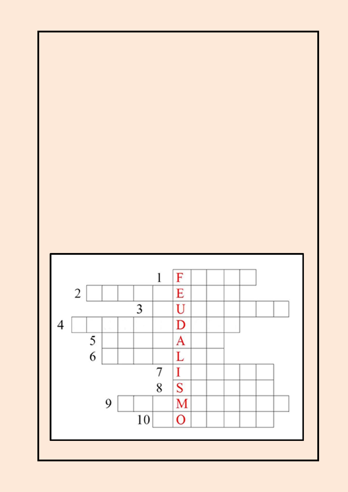 Centro de Ensino Urbano Rocha Imperatriz, ____ de agosto de 2016. Professora: Mary alvarenga Atividade de História Com base no seu conhecimento sobre o feudalismo, resolva a cruzadinha. 1. Era a unidade de produção do feudalismo. 2. Nobres que praticavam de luta a cavalo. 3. Os que concediam a terra . 4. Imposto cobrado pelo uso dos instrumentos e instalações do senhor. 5. O que recebia a terra. 6. Povo de origem germânica, que invadiram Roma e depuseram o imperador em 476 a.C 7. Principal instituição da Idade Média, considerada a grande senhora feudal. 8. Além de trabalharem de graça três dias por semana na terra do senhor, tinham de entregar- lhes uma parte do que produziam. 9. Eram chamados de bárbaros pelos romanos. 10. Significa a obrigação do servo de trabalhar três dias por semana nas terras do senhor. Boa sorte!!!! RESPOSTAS 1. Era a unidade de produção do feudalismo - feudo 2. Nobres que praticavam de luta a cavalo - cavaleiro 3. Os que concedia a terra - Suserano 4. Imposto cobrado pelo uso dos instrumentos e instalações do senhor - Banalidades 5. O que recebia a terra - vassalo 6. Povo de origem germânica, que invadiram Roma e depuseram o imperador em 476 a.C - Hérulos 7. Principal instituição da Idade Média, considerada a grande senhora feudal - Igreja 8. Além de trabalharem de graça três dias por semana na terra do senhor, tinham de entregar- lhes uma parte do que produziam. - Servos 9. Eram chamados de bárbaros pelos romanos - Germânicos 10. Significa a obrigação do servo de trabalhar três dias por semana nas terras do senhor - Corveia