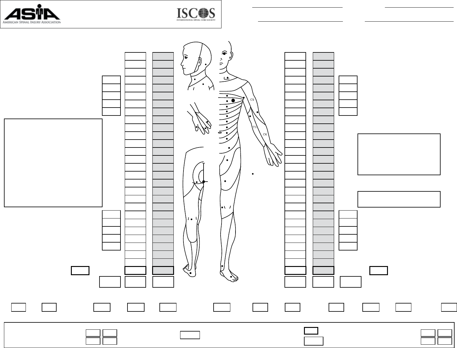 REV 04/19Page 1/2 This form may be copied freely but should not be altered without permission from the American Spinal Injury Association. NEUROLOGICAL LEVELS Steps 1- 6 for classification as on reverse 1. SENSORY 2. MOTOR R L 3. NEUROLOGICAL LEVEL OF INJURY (NLI) 4. COMPLETE OR INCOMPLETE? Incomplete = Any sensory or motor function in S4-5 5. ASIA IMPAIRMENT SCALE (AIS) (In injuries with absent motor OR sensory function in S4-5 only) 6. ZONE OF PARTIAL PRESERVATION Most caudal levels with any innervation SENSORY MOTOR R L MOTOR SUBSCORES SENSORY SUBSCORES UER +UEL = UEMS TOTAL LER + LEL = LEMS TOTAL PPR + PPL = PP TOTALLTR + LTL = LT TOTAL MAX (25) (25) (50) (25) (25) (50) (56) (56) (112)MAX MAX (56) (56) (112)MAX (50) (56) (56) RIGHT TOTALS (MAXIMUM) (56) (56) (50) LEFT TOTALS (MAXIMUM) (VAC) Voluntary Anal Contraction (Yes/No) (DAP) Deep Anal Pressure (Yes/No) C5 C6 C7 C8 T1 C5 C6 C7 C8 T1 L2 L3 L4 L5 S1 L2 L3 L4 L5 S1 C2 C3 C4 S2 S3 S4-5 T2 T3 T4 T5 T6 T7 T8 T9 T10 T11 T12 L1 C2 C3 C4 S2 S3 S4-5 T2 T3 T4 T5 T6 T7 T8 T9 T10 T11 T12 L1 RIGHT LEFT UER (Upper Extremity Right) LER (Lower Extremity Right) UEL (Upper Extremity Left) LEL (Lower Extremity Left) Elbow flexors Wrist extensors Elbow extensors Finger flexors Finger abductors (little finger) Hip flexors Knee extensors Ankle dorsiflexors Long toe extensors Ankle plantar flexors Elbow flexors Wrist extensors Elbow extensors Finger flexors Finger abductors (little finger) Hip flexors Knee extensors Ankle dorsiflexors Long toe extensors Ankle plantar flexors Pin Prick (PPR)Light Touch (LTR) Pin Prick (PPL)Light Touch (LTL) SENSORY KEY SENSORY POINTS MOTOR KEY MUSCLES MOTOR KEY MUSCLES 0 = Absent 1 = Altered 2 = Normal NT = Not testable 0*, 1*, NT* = Non-SCI condition present SENSORY (SCORING ON REVERSE SIDE) 0 = Total paralysis 1 = Palpable or visible contraction 2 = Active movement, gravity eliminated 3 = Active movement, against gravity 4 = Active movement, against some resistance 5 = Active movement, against full resistance NT = Not testable 0*, 1*, 2*, 3*, 4*, NT* = Non-SCI condition present MOTOR (SCORING ON REVERSE SIDE) Comments (Non-key Muscle? Reason for NT? Pain? Non-SCI condition?): C2 C2 C3 C4 T3 S4-5 S3 S2 S1 L5 L 4 L 3 L 2 C3 C4 T2 T4 T5 T6 T7 T8 T9 T10 T11 T12 L1 L2 L3 L4 L5 C8 C7 C6 Dorsum Palm Key Sensory Points Patient Name Date/Time of Exam Examiner Name Signature INTERNATIONAL STANDARDS FOR NEUROLOGICAL CLASSIFICATION OF SPINAL CORD INJURY (ISNCSCI) Page 2/2 A = Complete. No sensory or motor function is preserved in the sacral segments S4-5. B = Sensory Incomplete. Sensory but not motor function is preserved below the neurological level and includes the sacral segments S4-5 (light touch or pin prick at S4-5 or deep anal pressure) AND no motor function is preserved more than three levels below the motor level on either side of the body. C = Motor Incomplete. Motor function is preserved at the most caudal sacral segments for voluntary anal contraction (VAC) OR the patient meets the criteria for sensory incomplete status (sensory function preserved at the most caudal sacral segments S4-5 by LT, PP or DAP), and has some sparing of motor function more than three levels below the ipsilateral motor level on either side of the body. (This includes key or non-key muscle functions to determine motor incomplete status.) For AIS C – less than half of key muscle functions below the single NLI have a muscle grade ≥ 3. D = Motor Incomplete. Motor incomplete status as defined above, with at least half (half or more) of key muscle functions below the single NLI having a muscle grade ≥ 3. E = Normal. If sensation and motor function as tested with the ISNCSCI are graded as normal in all segments, and the patient had prior deficits, then the AIS grade is E. Someone without an initial SCI does not receive an AIS grade. Using ND: To document the sensory, motor and NLI levels, the ASIA Impairment Scale grade, and/or the zone of partial preservation (ZPP) when they are unable to be determined based on the examination results. ASIA Impairment Scale (AIS) Steps in ClassificationMuscle Function Grading Sensory Grading When to Test Non-Key Muscles: 0 = Total paralysis 1 = Palpable or visible contraction 2 = Active movement, full range of motion (ROM) with gravity eliminated 3 = Active movement, full ROM against gravity 4 = Active movement, full ROM against gravity and moderate resistance in a muscle specific position 5 = (Normal) active movement, full ROM against gravity and full resistance in a functional muscle position expected from an otherwise unimpaired person NT = Not testable (i.e. due to immobilization, severe pain such that the patient cannot be graded, amputation of limb, or contracture of > 50% of the normal ROM) 0*, 1*, 2*, 3*, 4*, NT* = Non-SCI condition present a 0 = Absent 1 = Altered, either decreased/impaired sensation or hypersensitivity 2 = Normal NT = Not testable 0*, 1*, NT* = Non-SCI condition present a In a patient with an apparent AIS B classification, non-key muscle functions more than 3 levels below the motor level on each side should be tested to most accurately classify the injury (differentiate between AIS B and C). The following order is recommended for determining the classification of individuals with SCI. INTERNATIONAL STANDARDS FOR NEUROLOGICAL CLASSIFICATION OF SPINAL CORD INJURY Movement Shoulder: Flexion, extension, adbuction, adduction, internal and external rotation Elbow: Supination Elbow: Pronation Wrist: Flexion Finger: Flexion at proximal joint, extension Thumb: Flexion, extension and abduction in plane of thumb Finger: Flexion at MCP joint Thumb: Opposition, adduction and abduction perpendicular to palm Finger: Abduction of the index finger Hip: Adduction Hip: External rotation Hallux and Toe: DIP and PIP flexion and abduction Hallux: Adduction Hip: Extension, abduction, internal rotation Knee: Flexion Ankle: Inversion and eversion Toe: MP and IP extension Root level C5 C6 C7 C8 T1 L2 L3 L4 L