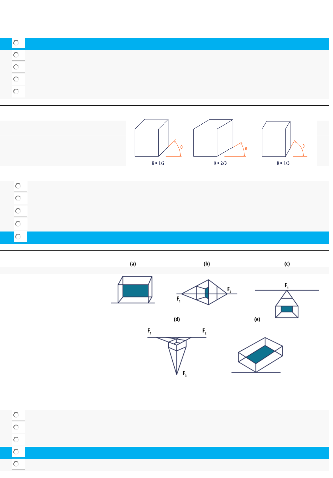Pergunta 1 1 ponto Para proporcionar uma forma agradável a representação do objeto, usa-se um coeficiente de redução ou de alteração. A perspectiva cavaleira a 60º possui seu próprio fator de redução que é diferente das demais perspectivas cavaleira. Com base no texto e no conteúdo estudado, pode-se afirmar que a redução para atenuar a distorção dimensional e melhor representar o objeto é de: a) 1/3 (0,33). b) 2/5 (0,40). c) 2/3 (0,66). d) 1/2 (0,50). e) 3/4 (0,75). Pergunta 2 1 ponto Observe a figura a seguir: DESENHO TEC UNID 4 QUEST 20.PNG Considerando a figura apresentada e o conteúdo estudado sobre perspectiva cavaleira, pode-se afirmar que o fator de redução k aplicado a cada cubo está respectivamente correspondendo aos: a) ângulo de 15º, ângulo de 60º e ângulo de 30º. b) ângulo de 45º, ângulo de 30º e ângulo de 15º. c) ângulo de 60º, ângulo de 30º e ângulo de 45º. d) ângulo de 50º, ângulo de 30º e ângulo de 75º. e) ângulo de 45º, ângulo de 30º e ângulo de 60º.= Pergunta 3 1 ponto Observe as figuras a seguir: DESENHO TEC UNID 4 QUEST 08.PNG Em termos práticos, a representação da perspectiva cavaleira é utilizada a 45.º e dever ser construída a partir do desenho da planta baixa. Considerando o conteúdo estudado e as figuras apresentadas, podemos afirmar que a figura que corresponde à perspectiva cavaleira é: a) a figura c. b) a figura d. c) a figura e. d) a figura a. e) a figura b. Pergunta 4 1 ponto Observe as figuras a seguir: DESENHO TEC UNID 4 QUEST 08.PNG Em termos práticos, a representação da perspectiva cavaleira é utilizada a 45.º e dever ser construída a partir do desenho da planta baixa. Considerando o conteúdo estudado e as figuras apresentadas, podemos afirmar que a figura que corresponde à perspectiva cavaleira é: a) a figura d. b) a figura b. c) a figura a. d) a figura c. e) a figura e. Pergunta 5 1 ponto Leia o texto a seguir: “A fotografia mostra um objeto do mesmo modo como ele é visto pelo olho humano, pois transmite a ideia de três dimensões: comprimento, largura e altura. O desenho, para transmitir essa mesma ideia, precisa recorrer a um modo especial de representação gráfica: a perspectiva. Ela representa graficamente as três dimensões de um objeto em um único plano, de maneira a transmitir a ideia de profundidade e relevo.” Fonte: Pastana, Carlos E. T. Anotações de aula: desenho técnico. Marília: UNIMAR, 2006. p 69. Com base no texto e no conteúdo estudado, analise as afirmativas a seguir: I. A perspectiva cavaleira é um tipo de perspectiva paralela, em que a face paralela ao plano de projeção permanece sem deformação. II. A perspectiva caveira apresenta ângulos iguais entre os eixos de coordenadas. III. Dentro da classificação das projeções geométricas, a perspectiva cavaleira é dividida em: perspectiva trimétrica, dimétrica e isométrica. IV. Na perspectiva isométrica o observador se encontra localizado a uma distância infinita do objeto, tornando as projetantes paralelas. Está correto apenas o que se afirma em: a) II e IV. b) I e III. c) III e IV. d) II e III. e) I e IV. Pergunta 6 1 ponto Observe a figura a seguir: DESENHO TEC UNID 4 QUEST 18.PNG DESENHO TEC UNID 4 QUEST 18 A.PNG Com base nas figuras apresentadas e no conteúdo estudado sobre perspectiva cavaleira, pode-se afirmar que a perspectiva cavaleira é um sistema de projeção cilíndrica no qual os raios projetantes são oblíquos a um plano vertical de projeção, o que provoca uma deformação no objeto representado e: a) torna a face lateral do triedro coincidente com o plano no quadro em que todos os segmentos dos eixos x e z se projetam em verdadeira grandeza (VG). b) torna uma das faces do triedro coincidente com o plano no quadro em que todos os segmentos dos eixos x e z se projetam em verdadeira grandeza (VG). c) torna uma das faces do triedro coincidente com o plano do quadro em quetodos os segmentos dos eixos y e z se projetam em verdadeira grandeza (VG). d) torna a face superior do triedro coincidente com o plano no quadro em que todos os segmentos dos eixos y e z se projetam em verdadeira grandeza (VG). e) torna a face lateral do triedro coincidente com o plano no quadro em que todos os segmentos dos eixos y e z se projetam em verdadeira grandeza (VG). Pergunta 7 1 ponto Observa a figura a seguir: DESENHO TEC UNID 4 QUEST 10.PNG Considerando a figura apresentada e o conteúdo estudado sobre representação das faces do objeto, pode-se afirmar que quando o ângulo α for: a) igual a 45º, as faces horizontais predominam sobre as laterais. b) igual a 45º, as faces horizontais e as laterais são valorizadas igualmente. c) maior que 45º, as faces horizontais e as laterais são valorizadas igualmente. d) menor que 45º, as faces horizontais predominam sobre as laterais e) maior que 45º, as faces laterais irão predominar sobre as horizontais. Pergunta 8 1 ponto Observe a figura a seguir: DESENHO TEC UNID 4 QUEST 11.PNG Considerando a figura apresentada e o conteúdo estudado sobre construção circunferência, analise e ordene as etapas de construção de um objeto cilíndrico de acordo com a sequência correta. ( ) Passo: Traçar uma linha dividindo os lados do quadrado anterior ao meio para, assim será determinado o centro da circunferência frontal, que também devem tangenciar a circunferência posterior. ( ) Passo: Construir as linhas que geram a peça. Trace um quadrado frontal onde os lados são o diâmetro do círculo, repete o processo na parte posterior da mesma maneira que a parte anterior. ( ) Passo: Apagar as linhas auxiliares construídas e reforçar os traços definitivos. ( ) Passo: Traçar a circunferência frontal, usando o compasso e tangentes à circunferência e tangenciar a circunferência para a parte posterior. Agora, assinale a alternativa que apresenta a sequência correta: a) 1, 3, 4, 2. b) 2, 3, 4, 1. c) 2, 1, 4, 3. d) 4, 1, 2, 3. e) 3, 2, 4, 1. Pergunta 9