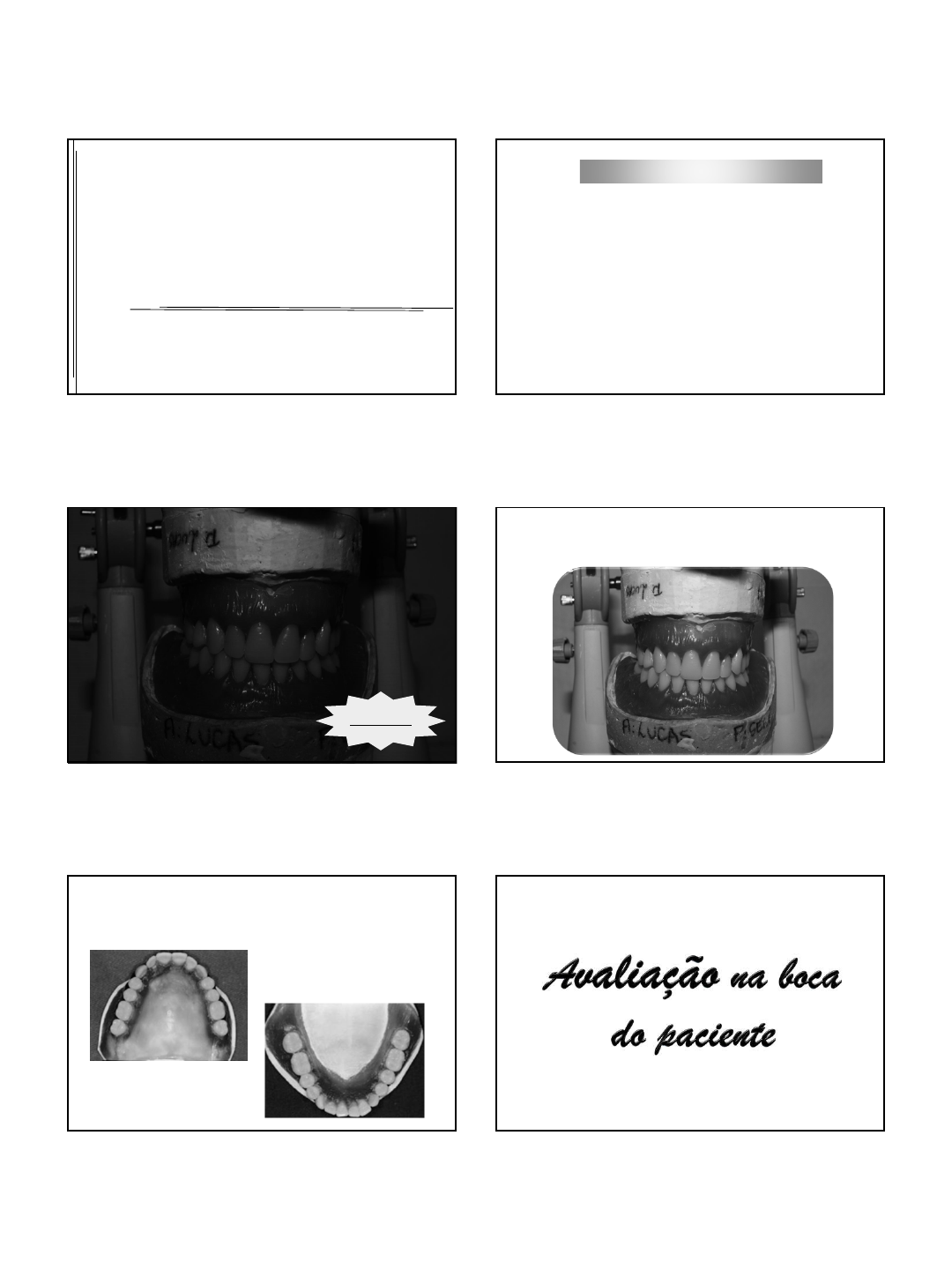 27/11/2016 1 Reabilitações totais Fundamentos Profa. Fabiane Maria Ferreira • Anamnese e exame do paciente (clínico e radiográfico) • Moldagem de estudo (anatômica) → modelos de estudo • Delimitação da área chapeável • Confecção da moldeira individual • Moldagem de funcional → modelo de trabalho • Confecção do plano de orientação (base de prova + rolete de cera) • Registro maxilomandibular • Seleção e montagem dos dentes • Avaliação funcional da seleção e montagem de dentes • Processamento laboratorial • Instalação e ajuste das próteses Etapas clínicas e laboratoriais AVALIAÇÃO NO ASA POSIÇÃO - Disposição de cada dente (regras de montagem) - Relacionados à função e estética ALINHAMENTO - Vista frontal/lateral e oclusal INDISPENSÁVEL AVALIAÇÃO NO ASA 1. Posição APROREM-FOUFU 2. Alinhamento AVALIAÇÃO NO ASA 27/11/2016 2 AVALIAÇÃO DA SELEÇÃO DOS DENTES ARTIFICIAIS TAMANHO (comprimento e largura) FORMA COR 1.TAMANHO (comprimento e largura) 2. Forma Triangular, Quadrado, OvóideTriangular, Quadrado, Ovóide A forma do rosto do paciente deve ser avaliada em observação frontal, baseando-se na proporcionalidade da largura de 3 linhas: (1) Do cabelo (2) Das ATMs (3) Dos ângulos da mandíbula – Forma da face (Berry, 1906; William,1914) – a forma do rosto relaciona-se com a forma do incisivo central Poucas evidências suportam essa teoria, mas ainda sim é bastante utilizada. – Forma do rebordo (Nelson, 1925) – a forma do rebordo, eventualmente também se relaciona com o formato do incisivo central. – Personalidade, sexo e idade (Teoria dentinogênica de Frush & Fisher, 1959) – a mulher normalmente possui dentes com forma mais suaves e arredondadas; já o homem pode apresentar dentes com formas retas e vigorosa, o que não impede que haja mulheres com características mais vigorosas ou vice-versa. Pacientes mais idosos normalmente possuem as bordas incisais desgastadas. – Forma da face (Berry, 1906; William,1914) – a forma do rosto relaciona-se com a forma do incisivo central Poucas evidências suportam essa teoria, mas ainda sim é bastante utilizada. – Forma do rebordo (Nelson, 1925) – a forma do rebordo, eventualmente também se relaciona com o formato do incisivo central. – Personalidade, sexo e idade (Teoria dentinogênica de Frush & Fisher, 1959) – a mulher normalmente possui dentes com forma mais suaves e arredondadas; já o homem pode apresentar dentes com formas retas e vigorosa, o que não impede que haja mulheres com características mais vigorosas ou vice-versa. Pacientes mais idosos normalmente possuem as bordas incisais desgastadas. 2. Forma Triangular, Quadrado, OvóideTriangular, Quadrado, Ovóide • Em pacientes de raça negra os dentes dão a impressão de serem mais claros • Normalmente, as mulheres apresentam dentes mais claros que os homens. • Os pacientes idosos apresentam dentes mais escuros do que os jovens. 3. Cor O Paciente tem que participar da avaliação Nunca dê um espelho na mão para seu paciente segurar. Na maioria das vezes, o paciente aproxima demais o espelho do rosto, invadindo o que chamamos de distância social de visualização. Ultrapassada esta distância, o paciente fica com uma percepção equivocada da forma como as outras pessoas irão observá-los, dando uma impressão alterada do resultado. O mais adequado é que o profissional tenha em seu consultório um espelho na parede situado sobre uma bancada que impeça a aproximação do paciente. Não esquecer de informar ao paciente de cor da futura gengiva não será vermelha 27/11/2016 3 1. Suporte de lábio - Forma e Alinhamento do Arco dental 2. Altura incisal 3. Linha do sorriso - Curvas de Compensação 4. Corredor bucal 5. Linhas de referência 1. Suporte de lábio Reposicionamento correto dos músculos orbiculares que é essencial para a recuperação estética. Avaliar o perfil do paciente sem os dentes Avaliar o perfil do paciente com os dentes 1. Suporte de lábio Ângulo naso-labial, é de aproximadamente 90° Perfil do paciente As inclinações dos dentes anteriores maxilares e mandibulares, em especial os incisivos centrais, são geralmente paralelas ao perfil do paciente, 2. Altura incisal dos dentes - Chama-se de altura incisal à determinação da porção visível dos dentes com o lábio em repouso, - Relação do tubérculo do lábio a uma linha imaginária que passa pelas comissuras com os lábios em repouso. 2. Altura incisal dos dentes - Embora o posicionamento arbitrário do plano de oclusão de 1 a 2 mm abaixo da linha do lábio em repouso resulte num aspecto estético agradável, essa característica pode variar com o gênero, com a idade e com o comprimento do lábio. 0 2. Altura incisal do plano Teste Fonético: pronúncia de palavrascom sons de F e V. Ex: Favela, Fivela Os dentes superiores anteriores deverão tocar suavemente a linha úmido/seca do lábio inferior 27/11/2016 4 3. Linha do sorriso - Curvas de compensação • Os dentes naturais formam uma curva suavemente ascendente, que acompanha a borda superior do lábio inferior. Essa curva é chamada de linha do sorriso. Sorriso invertido Cuidado 4. Corredor Bucal • O corredor bucal é o espaço existente entre a superfície vestibular dos dentes posteriores e a mucosa interna da bochecha; • É influenciado pela sombra da mesma, que altera progressivamente a iluminação dos dentes, auxiliando na obtenção do efeito de gradação ântero-posterior que é essencial para um sorriso natural; 4. Corredor Bucal • Esse espaço deve ser criado no plano de referência e visualizado quando o paciente sorrir. • Deve ser equivalente em ambos os lados. • Nos pacientes “gordinhos” o corredor bucal é mais estreito, nos “magrinhos” o corredor bucal é mais amplo. 5. Linhas de referência Linha média ou mediana Linha alta do sorrisoDistância entre caninos 5. Linhas de referência Linha média ou mediana Verificar c