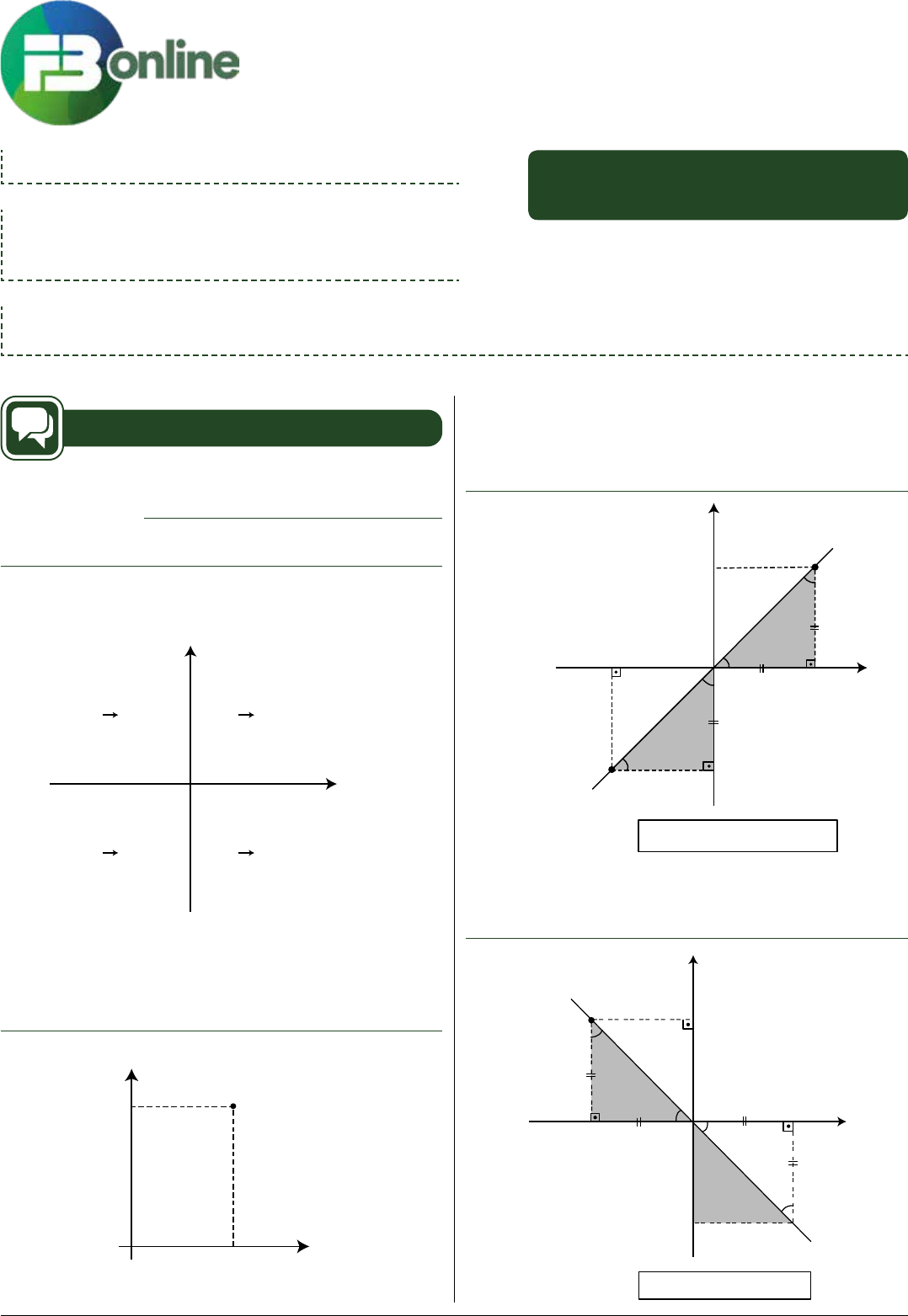 MATEMÁTICA F B O N L I N E . C O M . B R ////////////////// Professor(a): Fabrício Maia assunto: coordenadas no plano, distância entre dois pontos, razão entre dois segMentos, baricentro e colinearidade frente: MateMática i 018.269 - 143535/19 AULAS 65 e 66 EAD – ITA/IME Resumo Teórico Sistema cartesiano ortogonal Plano cartesiano Sendo P(x, y) um ponto do plano cartesiano, ele poderá pertencer a um dos eixos coordenados ou a um dos quatro quadrantes. Veja: y x 1º Q2º Q 4º Q3º Q (–, +) (–, –) (+, –) (+, +) x < 0 y > 0 x < 0 y < 0 x > 0 y < 0 0 x > 0 y > 0 � � � � � � � � � � � � � � � � � � � � Note: → → Ox Eixo das abscissas Oy Eixo das ordenadas Ponto no plano cartesiano ee y yp xp P Coordenadas do ponto (xp, yp) x0 Note: ∈ − → ∈ − → P eixo x P(x, 0) P eixo y P(0, y) Bissetriz dos quadrantes ímpares 45º 45º 45º 45ºP P(x, y) ∈ bissetriz13 ⇔ y = x x1 y1 x2 y2 Logo, dizemos que y = x é a equação da bissetriz dos quadrantes ímpares. Bissetri dos quadrantes pares 45º 45º 45º 45º P P(x, y) ∈ bissetriz24 ⇔ y = –x x1 y1 x2 y2 2F B O N L I N E . C O M . B R ////////////////// Módulo de estudo 018.269 - 143535/19 Logo, dizemos que y = –x é a equação da bissetriz dos qudrantes pares. Distância entre dois pontos yB yA xB xB xB xA xA yBdAB yA C B A ����� � � � � � Dados os dois pontos distintos do plano cartesiano, chama- se distância entre eles a medida do segmento de reta que tem os dois pontos por extremidade. Sendo A(x A , y B ) e B(x B , y B ), aplicando PItágoras, temos: Note que: AB2 = AC2 + BC2 AB2 = (x B – x A )2 + (y B – y A )2 d x x y y ou d x y AB B A B A AB = −( ) + −( ) = ( ) + ( ) 2 2 2 2 ∆ ∆ Segmentos orientados Segmento orientado: diz-se que um segmento de reta é orientado se estão indicadas sua origem e sua extremidade entre os pontos que o definem. Na figura a seguir, temos a representação de reta MN. M N eixo das abscissas É possível orientar esse segmento no sentido de M para N, ou então, de N para M. Escolhendo o sentido de M para N, obtemos o segmento orientado MN � ��� de origem M e extremidade N. Por outro lado, a medida algébrica do segmento orientado dependerá da orientação escolhida e é igual à diferença entre a abscissa da extremidade e a abscissa da origem do segmento. Logo: • Se M (origem) e N (extremidade), então MN x xN M � ��� = − ; • Se N (origem) e M (extremidade), então NM x xM N � ��� = − . Razão entre segmentos colineares e coordenadas do ponto de divisão Na figura a seguir, se os pontos A(x A , y A ) e B(x B , y B ), distintos, são as extremidades de um segmento orientado AB � �� , então as coordenadas (x p , x p ) de um ponto P que divide o segmento dado na razão r AP PB = � �� ��� (com r ≠ –1), são: yB yP yA xA xP xB x B P A y Segundo o Teorema de Tales, pode-se concluir que: r AP PB x x x x y y y y P A B P P A B P = = − − = − − � �� ��� Dessa forma, determina-se as coordenadas do ponto P(x P , y P ): x x x x r x x r x r x x r x x r x x r x P A B P P A B P P P A B P A − − = ⇒ − = ⋅ − ⋅ ⇒ ⇒ + ⋅ = + ⋅ ⇒ ⇒ ⋅ +( )=1 ++ ⋅ ⇒ ⇒ = + ⋅ + ≠− ⇒ = + ⋅ + r x x x r x r com r Ana amente y y r y r c B P A B P A B 1 1 1 , log : , oom r ≠−1 3 F B O N L I N E . C O M . B R ////////////////// 018.269 - 143535/19 Módulo de estudo Coordenadas do ponto médio de um segmento Para o caso de um ponto M diminuir o segmento AB � �� ao meio (r + 1), pelo exposto anteriormente tem-se: y B M A xxBxMxA y A y M y B A B A B M x 1 x x x x 1 1 2 + × + · = = + A B A B M y 1 y y y y 1 1 2 + × + · = = + Assim: M x x y yA B A B+ + 2 2 , Coordenadas do baricentro de um triângulo Se G(x G ; y G ) o baricentro de um triângulo ABC, A(x A ; y A ), B(x B ; y B ) e C(x C ; y C ). Vamos lembrar que: • baricentro de um triângulo é o ponto de intersecção das medianas desse triângulo; • o baricentro divide cada mediana em dois segmentos, tais que o que contém o vértice é o dobro do outro. Na figura, temos: B U U U D G M C A 1 M é o ponto médio de AC, então:· A C M A C M x x x 2 y y y 2 ì +ïï =ïïïíï +ï =ïïïî 2 Condição de alinhamento de três pontos Se os pontos P(x P , y P ), Q(x Q , y Q ) e R(x R , y R ) são distintos e pertencem a uma reta não paralela aos eixos coordenados, por semelhança de triângulos, obtemos uma condição necessária e suficiente para o alinhamento desses três pontos. y yQ yR yP xP xR xQ R P O x x x α α Q Condição: x x x x y y y y x y x y x x R P Q R R P Q R P P R R Q Q − − = − − ⇔ = 1 1 1 0 Exercícios 01. Considere os pontos A: (0, 0), B: (2, 0) e C: (0, 3). Seja P: (x, y) o ponto de intersecção das bissetrizes internas do triângulo ABC. Então x + y é igual a A) 12 5 13+ B) 8 2 11+ C) 10 6 13+ D) 5 E) 2 02. Sejam A = (0, 0), B = (0, 6) e C = (4, 3) vértices de um triângulo. A distância do baricentro deste triângulo ao vértice A, em unidades de distância, é igual a A) 5 3 B) 97 3 C) 109 3 D) 5 3 E) 10 3 4F B O N L I N E . C O M . B R ////////////////// Módulo de estudo 018.269 - 143535/19 03. Se P e Q são pontos que pertencem à circunferência x2 + y2 = 4 e à reta y = 2(1 – x), então o valor do cosseno do ângulo POQ � A) − 3 5 B) − 3 7 C) − 2 5 D) − 4 5 E) − 1 7 04. Seja g a circunferência de equação x2 + y2 = 4. Se r e s são duas retas que se interceptam no ponto P = (1, 3) e são tangentes a g, então o cosseno do ângulo entre r e s é igual a A) 1 5 B) 7 7 C) 1 2 D) 2 2 E) 2 6 5 05. Considere o paralelogramo ABCD onde A = (0, 0), B (–1, 2) e C = (–3, 4). Os ângulos internos distintos e o vértice D deste paralelogramo são, respectivamente: A) p/3, 3p/4 e D = (–2, –5) B) p/3, 2p/3 e D = (–1, –5) C) p/3, 2p/3 e D = (–2, –6) D) p/4, 3p/4 e D = (–2, –6) E) p/3, 2p/3 e D = (–2, –5)