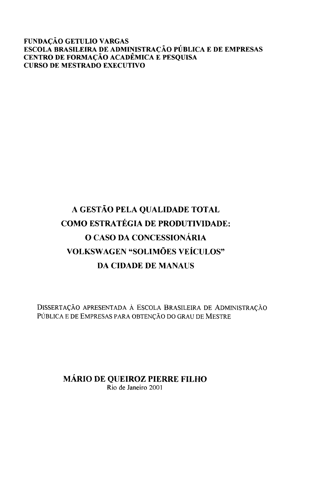 FUNDAÇÃO GETULIO VARGAS ESCOLA BRASILEIRA DE ADMINISTRAÇÃO PÚBLICA E DE EMPRESAS CENTRO DE FORMAÇÃO ACADÊMICA E PESQUISA CURSO DE MESTRADO EXECUTIVO A GESTÃO PELA QUALIDADE TOTAL COMO ESTRATÉGIA DE PRODUTIVIDADE: O CASO DA CONCESSIONÁRIA VOLKSW AGEN "SOLIMÕES VEÍCULOS" DA CIDADE DE MANAUS DISSERTAÇÃO APRESENTADA À ESCOLA BRASILEIRA DE ADMINISTRAÇÃO PÚBLICA E DE EMPRESAS PARA OBTENÇÃO DO GRAU DE MESTRE MÁRIO DE QUEIROZ PIERRE FILHO Rio de Janeiro 2001 E FUNDAÇÃO GETULIO VARGAS ESCOLA BRASILEIRA DE ADMINISTRAÇÃO PÚBLICA E DE EMPRESAS CENTRO DE FORMAÇÃO ACADtMICA E PESQUISA INSTITUTO SUPERIOR DE ADMINISTRAÇÃO E ECONOMIA - ISAE CURSO DE MESTRADO EXECUTIVO A UTILIZAÇÃO DA GESTÃO PELA QUALIDADE TOTAL COMO ESTRA TÉGIA DE PRODUTIVIDADE. O CASO DA CONCESSIONÁRIA VOLKSWAGEN "SOLIMÕES VEÍCULOS" DA CIDADE DE MANAUS. DISSERTAÇÃO DE MESTRADO APRESENTADO POR Mário de Queiroz Pierre Filho APROVADO EM: 16.10.2001 PELA COMISSÃO EXAMINADORA LUIS CÉSAR GONÇALVES DE ARAÚJO - Doutor &p..&~",", - Doutor ~&-&>"O SOARE' DE ANDRADE - Doutor 5 RESUMO Este estudo trata-se de um "estudo de caso - ex post facto" que tem como objetivo demonstrar, a partir das percepções e manifestações dos dirigentes e empregados da empresa Solimões Veículos - Concessionária Volk:swagen de Manaus, como a Gestão pela Qualidade Total - GQT pode influenciar na produtividade das pessoas que compõem esta organização. Com base nos pressupostos da qualidade total, chegou-se a hipótese de que a GQT é uma ferramenta estratégica que pode influenciar na produtividade dos empregados. Como a avaliação de percepções e manifestações de pessoas não é tarefa das mais fáceis e, devido à complexidade que se encaminha o problema de pesquisa, este estudo se caracterizará como sendo descritivo priorizando um tratamento quantitativo e qualitativo aos dados. A metodologia utiliza, basicamente, uma "pesquisa documental", que tem como objetivo a investigação de todos os fatos, acontecimentos e estatísticas que envolvem o problema pesquisado; uma "pesquisa bibliográfica", onde são analisadas e descritas as literaturas existentes a respeito dos temas GQT e Produtividade; e uma "pesquisa de campo", onde se procura demonstrar, a partir das percepções e manifestações dos dirigentes e empregados da empresa estudada, a int1uencia da GQT em suas produtividades. ABSTRACT This research is about a "case study - ex post facto" wich has the objective of showing from the perceptions and manifcstation of the Solimoes Veiculos company employees - Volkswagen branch in Manaus city how the Total Quality Management - TQM may influence the productivity of the people that make part of this company. Based on the Total Quality purposes we got the hypotesis that the TQM is a strategical tool wich may influence people's productivity. As the perceptions and manifestations evaluations of people is not an easy task and due to the complexity that follows the research matter, this study will have descriptive characteristics emphasing a quantitative and qualitive treatment to the data presented. The methodology makes use of a "documental research", aiming the facts investigations, events and statistics related to the subject researched; a "bibliographical research" where the publications on the theme are checked TQM and productivity; and "field research", where we try to demonstrate from the perceptions and manifestations of the employees of the analyzed company: the influence of the TQM in the productivity. DEDICATÓRIA Dedico este estudo, primeiramente a Deus que me deu vida, saúde e inteligência para realizá-lo. Em seguida aos meus amados pais, Mário e Maria Pierre, que foram os responsáveis pela minha formação desde a infância até os dias de hoje. E por último aos meus amados tilhos Brenda, Mário Carlos e Mário Felipe, pela paciência e compreensão que tiveram nesses dois anos em que tive pouco tempo para dar-lhes atenção, amor e carinho. AGRACEDIMENTO É oportuno nesta ocasião que pessoas importantes dentro do processo do Curso de Mestrado sejam lembradas e, como dever de justiça, sejam agradecidas. Muitos foram os que contribuíram nesses dois anos de curso, porém, alguns se destacaram através de sua presteza, gentileza e eficiência no trato para como os alunos. Nesse caso pode-se destacar os amigos Sálvio e Jefferson, da Coordenação/ISAE, que em nenhum momento mediram esforços para atender as solicitações feitas - muitas vezes em cima da hora ou fora do tempo hábil. Eles sempre foram pessoas que, ao ser deste aluno, foram fundamentais ao bom desempenho dos processos administrativos do curso. Toda diretoria do ISAE também merece um lugar de destaque na realização desse curso - tão almejado pela região norte do País. Sabe-se que, sem o esforço pessoal da superintendência do instituto, as possibilidades de realização desse empreendimento seriam poucas. E por fim, é oportuno agradecer aos Professores que tanto se esforçaram no cumprimento da nobre missão de ensinar. Destaca-se neste momento os Doutores Fernando Tenório, Luiz César, Carlos Longo e Paulo Motta, que, ao ver deste aluno, foram os que mais agregaram valor ao Curso de Mestrado. SUMÁRIO Assunto Pagina INTRODUÇÃO......................................................................................................... 1 1 O PROBLEMA DO ESTUDO.............................................................................. 4 1.1 Contextualização do Problema da Pesquisa.......................................................... 4 1.1.1 A Organização Estudada...................................................................................... 4 1.1.1.1 O Mercado e os Concorrentes...................... ..................................................... 5 1.1.2 Os Cenários......................................................................................................... 7 1.2 Formulação do Problema de 