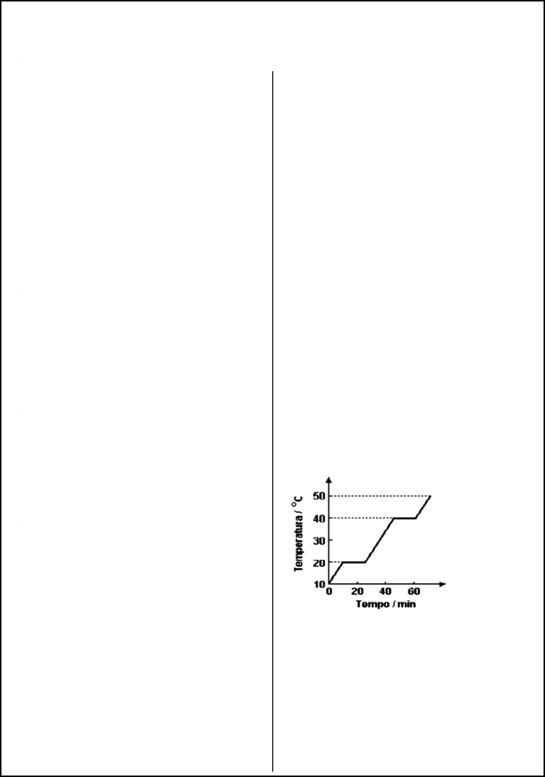 C E N T R O D E E N S I N O H U M B E R T O D E C A M P O S A V A L I A Ç Ã O B I M E S T R A L D E Q U I M I C A - 1º ANO - T A R D E NOME:_____________________________________________________________ 01. A curiosidade natural do ser humano o leva a explorar o ambiente que o cerca, observando, analisando, realizando experiências, procurando saber o porquê das coisas. Nesta atividade, exploradora e investigativa, ele observa os fenômenos químicos e físicos para conhecer melhor a natureza. Procure reconhecer, nas situações cotidianas citadas a seguir, quais envolvem fenômenos físicos (F) e quais envolvem fenômenos químicos (Q): ( ) Água fervendo para fazer café. ( ) Combustão da gasolina no motor de um carro. ( ) Funcionamento do motor elétrico de um liquidificador. ( ) Gordura sendo removida com detergente. ( ) Resfriamento de alimentos na geladeira. Assinale a resposta que contemple a ordem correta: A) Q-Q-F-F-Q. B) F-Q-F-Q-F. C) F-Q-F-F-Q. D) Q-F-F-Q-F. 02. Em um laboratório de química, em condições ambientais, foram preparadas as seguintes misturas: I) gasolina + areia II) água + gasolina III) oxigênio + nitrogênio IV) água + sal V) água + álcool Quais misturas podem ser homogêneas? A) III, IV e V, somente. B) II e IV, somente. C) IV e V, somente. D) I, II e IV, somente. 03. Com relação ao número de fases, os sistemas podem ser classificados como homogêneos ou heterogêneos. As alternativas correlacionam adequadamente o sistema e sua classificação, exceto em: A) Água de coco/heterogêneo B) Laranjada/ heterogêneo C) Leite/homogêneo D) Poeira no ar/ heterogêneo E) Água do mar filtrada/homogêneo 04. Qual das alternativas abaixo apresenta somente substâncias compostas: A) N2, P4, S8 B) CO, He, NH3. C) H2O, I2, Cl2. D) N2, O3, H2O. E) CO2, H2O, C6H12O6 05. Um sistema formado por água, açúcar dissolvido, álcool comum, limalha de ferro e carvão apresenta: A) 1 fase B) 2 fases C) 3 fases D) 4 fases E) 5 fases 06. Nas condições normais, quais das substâncias formam misturas heterogêneas? A) Gasolina e querosene B) Gasolina e água, C) Acetona e clorofórmio D) Etanol e metenol E) Nitrogênio e oxigênio 07. Numere a segunda de acordo com a primeira, escolhendo, em seguida, a opção correspondente à numeração correta de cima para baixo. 1 - oxigênio e nitrogênio 2 - óleo e água 3 - álcool e água 4 - ferro e enxofre 5 - ar e poeira ( ) destilação ( ) filtração ( ) separação magnética ( ) decantação ( ) liquefação A) 1-4-5-2-3 D) 3-5-4-2-1 B) 1-5-4-3-2 E) 5-1-3-4-2 C) 3-2-4-5-1 08. Um dos estados brasileiros produtores de cloreto de sódio é o Rio Grande do Norte. Nas salinas o processo físico que separa a água e o sal é: A) filtração B) sublimação C) destilação D) evaporação E) ebulição 09. Assinale a alternativa onde encontramos uma substância pura, uma mistura homogênea e uma mistura heterogênea. A) Açúcar, água doce, água do mar. B) Leite, suco de laranja, feijoada. C) Água destilada, água potável, água e gelo. D) Vinagre, vinho, álcool etílico. E) Geleia, água potável, suco de frutas. 10. O gráfico abaixo representa a variação de temperatura observada ao se aquecer uma substância A durante cerca de 80 minutos. A) Qual a faixa de temperatura em que a substância A permanece sólida? B) Qual a faixa de temperatura em que a substância A permanece líquida? C) Qual a temperatura de ebulição da substância?