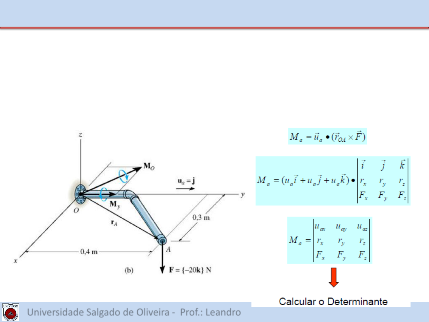 1 Aula 9 – Momento em Relação a um Eixo Momento em Relação a um Eixo Específico Determina-se o momento da força em relação a um ponto do sistema e depois se realiza a projeção sobre o eixo que se deseja a partir do produto escalar. A solução contempla duas etapas, um produto vetorial seguido de um produto escalar (produto misto). Momento em Relação a um Eixo Específico – Formulação Matemática Universidade Salgado de Oliveira - Prof.: Leandro 1 2 Aula 9 – Momento em Relação a um Eixo Exercício 1) A força F atua no ponto A mostrado na figura. Determine o momento desta força em relação: a) ao eixo x e b) ao eixo a. Universidade Salgado de Oliveira - Prof.: Leandro 2 3 Aula 9 – Momento em Relação a um Eixo a) Universidade Salgado de Oliveira - Prof.: Leandro 3 4 Aula 9 – Momento em Relação a um Eixo b) 1º Passo: Escrevendo o vetor unitário ua 2º Passo: Calcular o produto misto com Universidade Salgado de Oliveira - Prof.: Leandro 4 5 Aula 9 – Momento em Relação a um Eixo Momento de um Binário Um binário é definido como duas forças paralelas de mesma intensidade, sentidos opostos e separadas por um distância d. O efeito de um binário é proporcionar rotação ou tendência de rotação em um determinado sentido. Universidade Salgado de Oliveira - Prof.: Leandro 5 6 Aula 9 – Momento em Relação a um Eixo Formulação Matemática de um Binário Universidade Salgado de Oliveira - Prof.: Leandro 6 7 Aula 9 – Momento em Relação a um Eixo Binários Equivalentes Dois binários são ditos equivalentes se produzem o mesmo momento. O momento resultante de dois binários é obtido pela soma dos binários. Universidade Salgado de Oliveira - Prof.: Leandro 7 8 Aula 9 – Momento em Relação a um Eixo Exercícios Resolvidos 1º) Um binário atua nos tendes da engrenagem mostrada na figura. Substitua esse binário por um equivalente, composto por um par de forças que atuam nos pontos A e B. 1º Passo: Calculando o momento binário 2º Passo: Calando a nova força aplicada em A e B Universidade Salgado de Oliveira - Prof.: Leandro 8 9 Aula 9 – Momento em Relação a um Eixo Exercícios Propostos 1º) A barra mostrada na figura é suportada por dois mancais em A e B. Determine o momento MAB produzido por F = -600i + 200j – 300k [N] que tende a girar a barra em trono do eixo AB Universidade Salgado de Oliveira - Prof.: Leandro 9 10 Aula 9 – Momento em Relação a um Eixo Exercícios Propostos 2º) As extremidades da chapa triangular estão sujeitas a três binários. Determine a dimensão d da chapa de modo que o momento de binário resultante seja igual a 350N.m no sentido horário. Universidade Salgado de Oliveira - Prof.: Leandro 10 11 Aula 9 – Momento em Relação a um Eixo Exercícios Propostos 3º) O sistema de rodízio é submetido a dois binários. Determine as forças F que os dois mancais criam no eixo, de modo que o momento binário resultante no rodízio seja nulo. Universidade Salgado de Oliveira - Prof.: Leandro 11 12 Aula 9 – Momento em Relação a um Eixo Exercícios Propostos 4º) Um momento torsor de 4N.m é aplicado ao cabo de uma chave de fenda conforme a figura. Decomponha esse momento de binário em um par de binários F exercido no cabo e P atuando na lâmina da ferramenta Universidade Salgado de Oliveira - Prof.: Leandro 12 13 Aula 9 – Momento em Relação a um Eixo Exercícios Propostos 5º) O redutor de velocidade está sujeito ao binário mostrado na figura. Determine o momento de binário resultante especificando sua intensidade e os ângulos coordenados diretores. Universidade Salgado de Oliveira - Prof.: Leandro 13 14 Aula 9 – Momento em Relação a um Eixo Exercícios Propostos 6º) As engrenagens estão sujeitas aos momentos de binário mostrados na figura. Determine a intensidade do momento de binário resultante e especifique seus ângulos coordenados diretores. Universidade Salgado de Oliveira - Prof.: Leandro 14