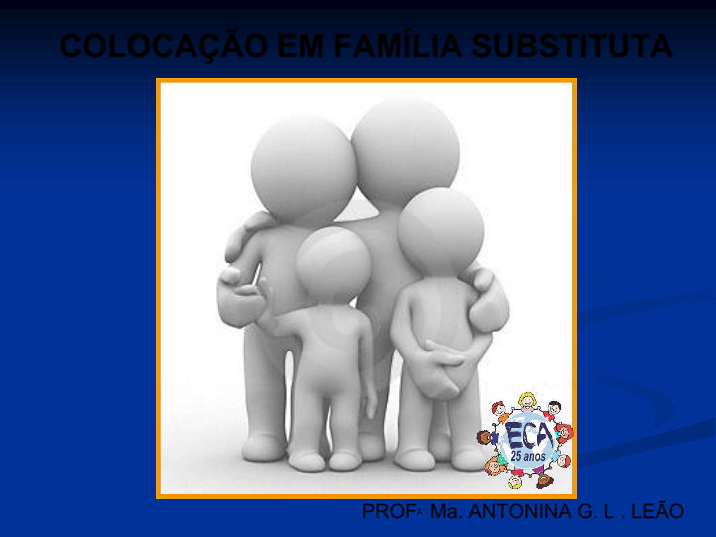 COLOCAÇÃO EM FAMÍLIA SUBSTITUTA PROFA Ma. ANTONINA G. L . LEÃO MARCO LEGAL – CF, Art. 227 “É dever da família, da sociedade e do Estado assegurar à criança, ao adolescente e ao jovem, com absoluta prioridade, o direito à vida, à saúde, à alimentação, à educação, ao lazer, à profissionalização, à cultura, à dignidade, ao respeito, à liberdade e à convivência familiar e comunitária, além de colocá-los a salvo de toda forma de negligência, discriminação, exploração, violência, crueldade e opressão.” “VALE PESCAR CD” Art. 4º, ECA Art. 4º É dever da família, da comunidade, da sociedade em geral e do poder público assegurar, com absoluta prioridade, a efetivação dos direitos referentes à vida, à saúde, à alimentação, à educação, ao esporte, ao lazer, à profissionalização, à cultura, à dignidade, ao respeito, à liberdade e à convivência familiar e comunitária. Art. 5º, ECA Art. 5º Nenhuma criança ou adolescente será objeto de qualquer forma de negligência, discriminação, exploração, violência, crueldade e opressão, punido na forma da lei qualquer atentado, por ação ou omissão, aos seus direitos fundamentais. CRIANÇAS E ADOLESCENTES DIREITO À FAMÍLIA; FAMÍLIA - CONVIVÊNCIA SAUDÁVEL – físico, psicológico, moral; PREVALÊNCIA DA FAMÍLIA NATURAL; FAMÍLIA - PODER FAMILIAR (parental, autoridade parental) – “PODER-DEVER” - “DEVER PARENTAL”- mais obrigações do que poderes! PRINCÍPIO PREVALÊNCIA DA FAMÍLIA O QUE ACONTECE QUANDO OS PAIS VIOLAM ? https://www.google.com.br/url?sa=i&rct=j&q=&esrc=s&source=images&cd=&ved=0CAcQjRxqFQoTCIzTr9-7iMkCFQOOkAodPlsJuQ&url=http://eclesia.com.br/portal/fim-dos-tempos-pais-e-filhos-chocam-o-mundo-por-seus-atos-brutais-relembre-casos/&psig=AFQjCNFQj7lIN9-8oJS6H0lJI3MxEagWAg&ust=1447334565631857 https://www.google.com.br/url?sa=i&rct=j&q=&esrc=s&source=images&cd=&ved=0CAcQjRxqFQoTCL6W1p3IiMkCFQMXkAodkUcL2g&url=http://www.indicedesaude.com/artigos_ver.php?id=2233&psig=AFQjCNG7QJC559BFgpb5Br3Vdqe3CZXttQ&ust=1447337960046851 VÍDEO 1 Pais que maltratam filhos são obrigados a voltar para a escola http://g1.globo.com/fantastico/noticia/2015/04/pais-que-maltratam-filhos-sao-obrigados-voltar-para-escola.html http://g1.globo.com/fantastico/noticia/2015/04/pais-que-maltratam-filhos-sao-obrigados-voltar-para-escola.html http://g1.globo.com/fantastico/noticia/2015/04/pais-que-maltratam-filhos-sao-obrigados-voltar-para-escola.html http://g1.globo.com/fantastico/noticia/2015/04/pais-que-maltratam-filhos-sao-obrigados-voltar-para-escola.html http://g1.globo.com/fantastico/noticia/2015/04/pais-que-maltratam-filhos-sao-obrigados-voltar-para-escola.html http://g1.globo.com/fantastico/noticia/2015/04/pais-que-maltratam-filhos-sao-obrigados-voltar-para-escola.html http://g1.globo.com/fantastico/noticia/2015/04/pais-que-maltratam-filhos-sao-obrigados-voltar-para-escola.html http://g1.globo.com/fantastico/noticia/2015/04/pais-que-maltratam-filhos-sao-obrigados-voltar-para-escola.html http://g1.globo.com/fantastico/noticia/2015/04/pais-que-maltratam-filhos-sao-obrigados-voltar-para-escola.html http://g1.globo.com/fantastico/noticia/2015/04/pais-que-maltratam-filhos-sao-obrigados-voltar-para-escola.html http://g1.globo.com/fantastico/noticia/2015/04/pais-que-maltratam-filhos-sao-obrigados-voltar-para-escola.html http://g1.globo.com/fantastico/noticia/2015/04/pais-que-maltratam-filhos-sao-obrigados-voltar-para-escola.html http://g1.globo.com/fantastico/noticia/2015/04/pais-que-maltratam-filhos-sao-obrigados-voltar-para-escola.html http://g1.globo.com/fantastico/noticia/2015/04/pais-que-maltratam-filhos-sao-obrigados-voltar-para-escola.html http://g1.globo.com/fantastico/noticia/2015/04/pais-que-maltratam-filhos-sao-obrigados-voltar-para-escola.html http://g1.globo.com/fantastico/noticia/2015/04/pais-que-maltratam-filhos-sao-obrigados-voltar-para-escola.html http://g1.globo.com/fantastico/noticia/2015/04/pais-que-maltratam-filhos-sao-obrigados-voltar-para-escola.html http://g1.globo.com/fantastico/noticia/2015/04/pais-que-maltratam-filhos-sao-obrigados-voltar-para-escola.html http://g1.globo.com/fantastico/noticia/2015/04/pais-que-maltratam-filhos-sao-obrigados-voltar-para-escola.html http://g1.globo.com/fantastico/noticia/2015/04/pais-que-maltratam-filhos-sao-obrigados-voltar-para-escola.html http://g1.globo.com/fantastico/noticia/2015/04/pais-que-maltratam-filhos-sao-obrigados-voltar-para-escola.html https://www.google.com.br/url?sa=i&rct=j&q=&esrc=s&source=images&cd=&ved=0CAcQjRxqFQoTCI_An-XJiMkCFcKMkAodtOYHoQ&url=http://www.escoladepais.org.br/index.php/component/joomgallery/galeria-de-fotos/2011-48-congresso-nacional-da-escola-de-pais-do-brasil&bvm=bv.106923889,d.Y2I&psig=AFQjCNE3x-5YcxadvPAr6o5qYNlhC1QMGg&ust=1447338353777689 COLOCAÇÃO EM FAMÍLIA SUBSTITUTA REGRA GERAL (CONVIVÊNCIA FAMILIAR - Direito Fundamental) Laços familiares – amparo emocional – crescimento e estruturação da personalidade; Valores éticos, civis e morais – jornada - fase adulta. LEI 12.010/09 – Lei da ADOÇÃO – convivência familiar. REGRA GERAL Ser criado e educado no seio de sua família natural, e excepcionalmente, em família substituta, assegurada a convivência familiar e comunitária (art.19, ECA). EXCEÇÃO - família natural incapaz de garantir direitos e garantias decorrentes do princípio da proteção integral (maus-tratos, abandono, dependência a entorpecentes, orfandade), promover-se-á a colocação da criança e adolescente, sempre tendo em vista o melhor interesse destes, em uma família substituta, sob três espécies: GUARDA, TUTELA E ADOÇÃO. COLOCAÇÃO EM FAMÍLIA SUBSTITUTA Art. 28. A colocação em família substituta far-se-á mediante GUARDA, TUTELA OU ADOÇÃO. Família substituta é quase tão antiga quanto a humanidade - brotou do próprio espírito de solidariedade existente nos seres humanos – suprir ausências da família natural; FAMÍLIA SUBSTITUTA Subs