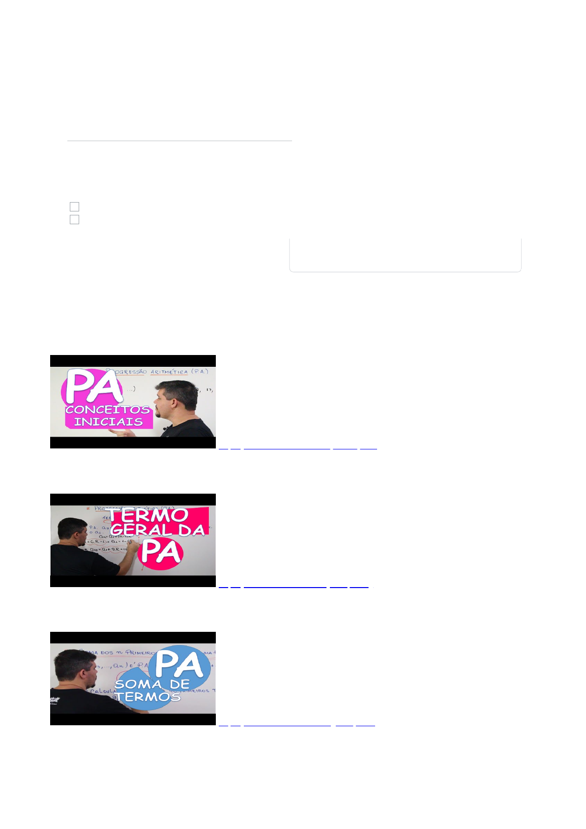 25/04/2020 ATIVIDADE 3 https://docs.google.com/forms/d/1fYj04M_S-chIwGgdE3c7fpTcjG54SnOf6nhNgINMxaw/edit 1/3 1. 2. Marque todas que se aplicam. 1°M01 1°M02 ATIVIDADE 2 Questões do PAEBES TRI a respeito de PROGRESSÃO ARITMÉTICA (P.A.) INDICAÇÃO DE VÍDEOS Deixarei a indicação de três vídeos, para que vocês reforcem esse conteúdo. Conceitos básicos de P.A. http://youtube.com/watch?v=QE3GieQD-Ps Fórmula do termo geral de uma P.A http://youtube.com/watch?v=yLCtLp-VcZg Soma dos n primeiros termos de uma P.A http://youtube.com/watch?v=zgT8oQlUtZ8 ATIVIDADE 3 Não deixe de se identificar! NOME: Qual é a sua série e turma? http://youtube.com/watch?v=QE3GieQD-Ps http://youtube.com/watch?v=yLCtLp-VcZg http://youtube.com/watch?v=zgT8oQlUtZ8 25/04/2020 ATIVIDADE 3 https://docs.google.com/forms/d/1fYj04M_S-chIwGgdE3c7fpTcjG54SnOf6nhNgINMxaw/edit 2/3 3. 0 pontos Marcar apenas uma oval. R$ 6 500,00 R$ 6 700,00 R$ 10 500,00 R$ 10 850,00 R$ 21 700,00 4. 0 pontos Marcar apenas uma oval. 2 550 m 3 850 m 4 200 m 6 050 m 6 400 m 5. 0 pontos Marcar apenas uma oval. 19 20 21 22 24 6. 0 pontos Marcar apenas uma oval. 31 34 255 465 510 1) (PAEBES – 2015) Paula abriu uma caderneta de poupança e fez um depósito inicial de 200 reais. A partir daí, ela depositou, a cada mês, 10 reais a mais que o valor depositado no mês anterior, até que o último depósito atingiu o valor de 500 reais. Ao final desses depósitos, qual foi o valor total depositado por Paula em sua caderneta de poupança? 2) (PAEBES – 2015) O instrutor de uma academia orientou uma pessoa a caminhar inicialmente 2 200 metros por dia durante o primeiro mês de atividade física, aumentando essa distância em 350 metros a cada mês. Seguindo essa orientação, no 12° mês de atividade física, essa pessoa deverá caminhar, por dia: 3) (PAEBES – 2016) Existem dois telefones instalados ao longo do acostamento de uma rodovia: um no km 7 e outro no km 167. Entre eles serão instalados novos telefones ao longo dessa rodovia de modo que, a cada 8 km, se tenha um telefone disponível. Quantos novos telefones serão instalados? 4) (PAEBES – 2017) Um paisagista criou um projeto de um jardim, que consiste em plantar mudas de flores sobre 15 circunferências de mesmo centro e raios distintos. Sobre a primeira circunferência, planta-se 3 mudas; sobre a segunda, planta-se 5 mudas; e assim por diante, de forma que a quantidade de mudas representam os termos de uma progressão aritmética. O número de mudas de flores que devem ser plantadas nesse jardim, de acordo com esse projeto, é: 25/04/2020 ATIVIDADE 3 https://docs.google.com/forms/d/1fYj04M_S-chIwGgdE3c7fpTcjG54SnOf6nhNgINMxaw/edit 3/3 7. 0 pontos Marcar apenas uma oval. 5 580 5 500 5 300 4 950 4 500 8. 0 pontos Marcar apenas uma oval. 10 20 24 29 58 Este conteúdo não foi criado nem aprovado pelo Google. 5) (PAEBES – 2018) André participou de um treinamento de corridas para atletas. No primeiro dia desse treinamento, André percorreu 1 800 metros e, em cada dia posterior, a distância percorrida por ele foi equivalente à do dia anterior, acrescida de uma quantidade fixa de metros. No nono e último dia desse treinamento, André percorreria 8 100 metros. No entanto, quando ele encerrou o quinto dia de treino, se lesionou e não continuou. Qual foi a distância, em metros, que André percorreu no dia em que se lesionou? 6) (PAEBES – 2019) Laura comprou um livro de 840 páginas e precisa realizar sua leitura antes de uma prova. Para alcançar seu objetivo, ela elaborou um cronograma de leitura no qual as quantidades de páginas a serem lidas por dia seguem uma progressão aritmética. De acordo com esse cronograma, no primeiro dia de leitura ela deverá ler 13 páginas desse livro e no último dia, 71 páginas. Seguindo esse cronograma, Laura precisará de quantos dias para ler todo esse livro? Formulários https://www.google.com/forms/about/?utm_source=product&utm_medium=forms_logo&utm_campaign=forms