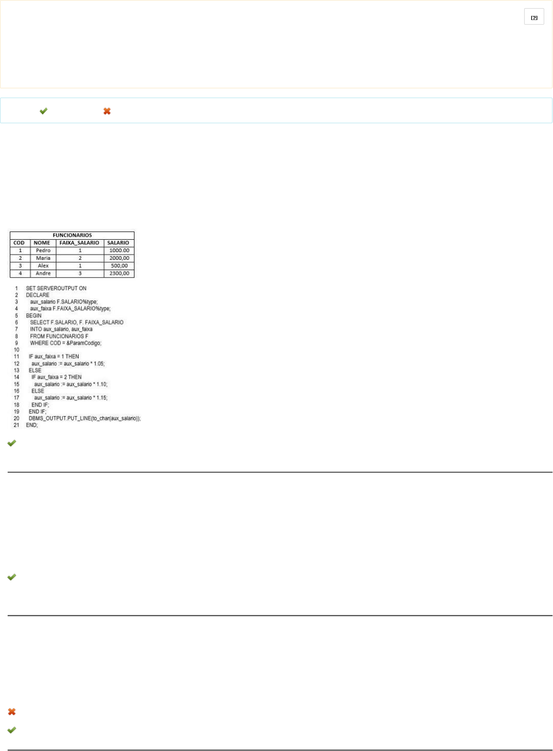 09/05/2020 UNIASSELVI - Centro Universitário Leonardo Da Vinci - Portal do Aluno - Portal do Aluno - Grupo UNIASSELVI https://portaldoalunoead.uniasselvi.com.br/ava/avaliacao/avaliacao_lista.php 1/3 1. A maioria dos softwares, desenvolvidos em determinados pontos de sua execução, necessitam tomar decisões, como, por exemplo, verificar qual a faixa salarial que determinado fu encontra, a fim de estabelecer qual será o percentual de reajuste do seu salário, ou seja, será necessário empregar um controle condicional, o qual permitirá controlar o fluxo de exe software baseado em uma condição. Acerca das estruturas condicionais no PL/SQL, analise as sentenças a seguir: I- A estrutura condicional apresentada entre as linhas 11 e 19 refere-se a uma estrutura condicional composta. II- Ao executar o bloco de comandos e selecionar o funcionário de código 3 (Alex), pode-se afirmar que a mensagem impressa será 550,00. III- O funcionário de código 4 (Andre) nunca receberá aumento, uma vez que sua faixa de salário não se encontra nas condições estabelecidas entre as linhas 11 e 19. IV- O bloco de comandos prevê a alteração salarial para todos os funcionários, cujo percentual deverá observar a faixa salarial. Agora, assinale a alternativa CORRETA: 2. SQL é um programa simples para emitir comandos sql para um banco de dados, é cliente servidor. É considerado um aplicativo padrão para acessar e manipular informações no ba ORACLE. Pode ser considerado também como um programa de computador que usa linha de comando para executar ações em SQL e PLSQL em uma base de dados ORACLE. É uma interface padrão para desenvolvedores e analistas de sistemas. Sobre a linguagem SQL, analise as sentenças a seguir: I- O operador EXISTS verifica se o resultado de uma consulta aninhada correlacionada é vazio ou não. II- As opções para a especificação de junção de tabelas disponíveis em SQL incluem INNER JOIN, LEFT OUTER JOIN, CENTER OUTER JOIN, CENTER INNER JOIN, RIGHT OUFULL OUTER JOIN. III- O operador CONTAINS compara dois conjuntos de valores e devolve TRUE se um conjunto contiver todos os valores do outro conjunto. IV- A cláusula WHERE especifica as condições para a seleção de tuplas das relações, incluindo as condições para as junções, se necessário. 3. As triggers são gatilhos disparados quando ocorre um evento nas tabelas, como a inclusão, a exclusão ou a alteração dos dados. Imagine situações de execução de operações com como as sentenças a seguir. Considerando o disparo de triggers especificamente no banco de dados ORACLE, ou seja, os comandos que têm a capacidade de disparar as triggers, para as opções verdadeiras e F para as falsas: ( ) Uma instrução DML (DELETE, INSERT ou UPDATE). ( ) Uma instrução DDL (CREATE, ALTER ou DROP). ( ) Uma instrução DTL (COMMIT, ROLLBACK ou REVOKE). ( ) Comandos de leitura (SELECTS). Acadêmico: Disciplina: Banco de Dados Avançado (ADS16) Avaliação: Prova: Nota da Prova: 5 , 00 Legenda: Resposta Certa Sua Resposta Errada a) As sentenças II e III estão corretas. b) Somente a sentença I está correta. c) As sentenças I, III e IV estão corretas. d) As sentenças I, II e IV estão corretas. Assinale a alternativa CORRETA: a) As sentenças I e IV estão corretas. b) As sentenças I e II estão corretas. c) As sentenças I e III estão corretas. d) As sentenças I, III e IV estão corretas. Assinale a alternativa que apresenta a sequência CORRETA: a) V - F - F - F. b) V - V - F - V. c) V - V - F - F. d) F - V - V - V. 09/05/2020 UNIASSELVI - Centro Universitário Leonardo Da Vinci - Portal do Aluno - Portal do Aluno - Grupo UNIASSELVI https://portaldoalunoead.uniasselvi.com.br/ava/avaliacao/avaliacao_lista.php 2/3 4. Um banco de dados é uma aplicação que lhe permite armazenar e obter de volta dados com eficiência. O que o torna relacional é a maneira como os dados são armazenados e org banco de dados. Quando falamos em banco de dados, aqui, nos referimos a um banco de dados relacional - RDBMS Relational Database Management System. Em um banco de d relacional, todos os dados são guardados em tabelas. Estas têm uma estrutura que se repete a cada linha, como você pode observar em uma planilha. São os relacionamentos entr que as tornam relacionais. Sobre os comandos/funções de agrupamento que podem ser utilizadas em cláusulas SELECT de um comando SQL, assinale a alternativa CORRETA: FONTE: https://elias.praciano.com/2013/09/o-que-e-um-banco-de-dados-relacional/. Acesso em: 6 mar. 2019. 5. O desenvolvimento de triggers, stored procedures e functions, visam a possibilitar o encapsulamento e a execução de blocos PL/SQL através de aplicações front-end, garantindo ain recuperação e edição, sem a necessidade de reescrever todo o código. Acerca destes blocos de comando PL/SQL, classifique V para as sentenças verdadeiras e F para as falsas: ( ) As triggers são utilizadas para auxiliar a manutenção da consistência dos dados, bem como na propagação de alterações ocorridas em um determinado dado de uma tabela pa tabela. ( ) As procedures são semelhantes às functions, uma vez que ambas retornam um valor. ( ) As procedures não podem conter comandos de modificação dos valores dos registros das tabelas do banco de dados. ( ) A function poderá ser executada como parte de uma instrução SELECT. ( ) Tanto a function como a procedure poderão ser executadas dentro de uma trigger. 6. Procedures suportam um grupo de instruções em SQL e PLSQL. São procedimentos de programação que permitem um ou mais parâmetros de entrada e saída em seu código de p Permitem centralizar as regras de negócio no banco de dados ou no fonte do programa. Com relação ao conceito de procedure, analise as sentenças a seguir: I- É necessário ter acesso ao banco de dados para ser possível criar, executar e compilar as procedures. II- Procedures não têm comando de finalização. III- É possível reaprov