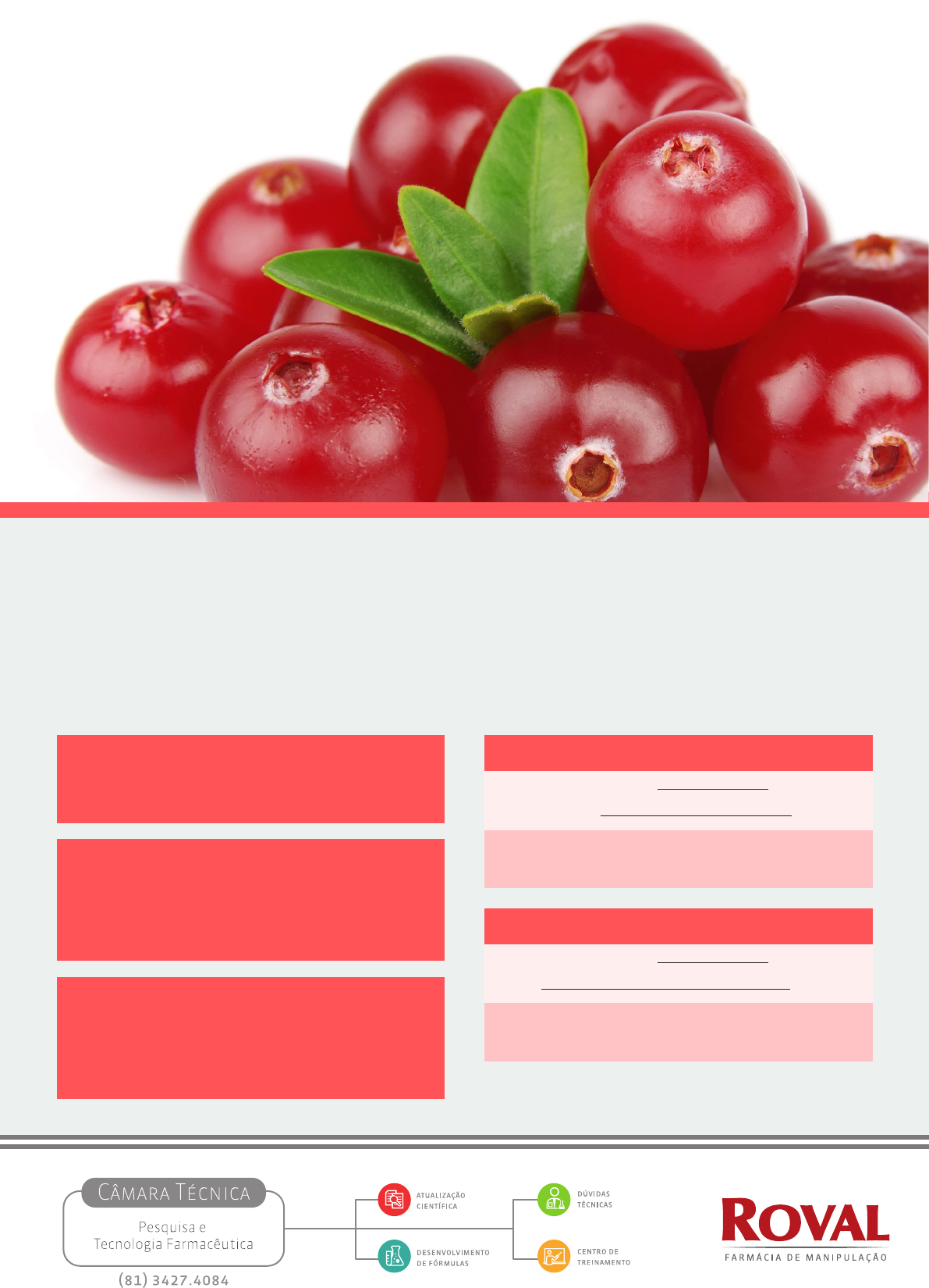 APLICAÇÕES CLÍNICAS DO EXTRATO DE CRANBERRY COMO PRESCREVER: EXTRATO SECO DE CRANBERRY Tratamento e prevenção das infecções do trato urinário CÁPSULA Extrato de Cranberry * 200 a 400mg Excipiente qsp 1 cápsula Posologia: Tomar 1 a 3 cápsulas ao dia, junto às refeições. SACHÊ Extrato de Cranberry * 200 a 400mg Sachê 1 unidade Posologia: Tomar 1 a 3 saches ao dia, junto às refeições. Reduz a incidência de ITU’s Cochrane Database Syst Rev. 2008;(1):CD001321 Extrato de Cranberry previne as ITU’s em pacientes com lesão medular e bexiga neurogênica Spinal Cord. Apr 2008 Extrato de Cranberry previne a reinci- dência de ITU’s em mulheres sujeitas a infecções recorrentes Phytomedicine 2007 Apr. 14(4):237-41 * Padronizado com 25% de polifenóis REFERÊNCIAS BIBLIOGRÁFICAS 1. Hess MJ, Hess PE, Sullivan MR, Nee M, Yalla SV. Evaluation of cranberry tablets for the prevention of urinary tract infections in spinal cord injured patients with neurogenic bladder. Spinal Cord. 2008 Apr 8. 2. Waites KB, Canupp KC, Roper JF, Camp SM, Chen Y. Evaluation of 3 methods of bladder irrigation to treat bacteriuria in persons with neurogenic bladder. J Spinal Cord Med. 2006;29(3):217-26. 3. Nowack R. Cranberry juice-- a well-characterized folk-remedy against bacterial urinary tract infection. Dialysis-Center Lindau, Lindau, Germany. Wien Med Wochenschr. 2007;157(13-14):325-30. 4. Di Martino P, Agniel R, David K, Templer C, Gaillard JL, Denys P, Botto H. Reduction of Escherichia coli adherence to uroepithelial bladder cells after consumption of cranberry juice: a double-blind randomized placebo-controlled cross-over trial. World J Urol. 2006 Feb;24(1):21-7. 5. Catherine C. Cranberry and its phytochemicals: A review of in vitro anticancer studies. J. Nutr. 137:186-193, 2007. 6. PDR Health – Cranberry. Disponível em: <http://www.pdrhealth.com/drugs/altmed/altmed- mono.aspx?contentFileName=ame0055.xml& contentName=Cranberry& contentId=218>. Acessado em: 06/01/09. 7. Valentova K, Stejskal D, Bednar P, Vostalova J, Cíhalík C, Vecerova R, Koukalova D, Kolar M, Reichenbach R, Sknouril L, Ulrichova J, Simanek V. Biosafety, antioxidant status, and metabolites in urine after consumption of dried cranberry juice in healthy women: a pilot double-blind placebo-controlled trial. J Agric Food Chem. 2007 Apr 18;55(8):3217-24. Epub 2007 Mar 24. 8. 2. Linsenmeyer TA, Harrison B, Oakley A, Kirshblum S, Stock JA, Millis SR. Evaluation of cranberry supplement for reduction of urinary tract infections in individuals with neurogenic bladders secondary to spinal cord injury. A prospective, double-blinded, placebo-controlled, crossover study. J Spinal Cord Med. 2004;27(1):29-34. 9. Avorn J, Monane M, Gurwitz JH, et al. Reduction of bacteriuria and pyuria after ingestion of cranberry juice. JAMA 1994;271:751—4. 10. Kontiokari T, et al. Randomised trial of cranberry-lingonberry juice and Lactobacillus GG drink for the prevention of urinary tract infections in women. BMJ 2001;322:1571—3. 11. Schlager TA, Anderson S, Trudell J. Effect of cranberry juice on bacteriuria in children with neurogenic bladder receiving intermittent catheterization. J Pediatr 1999;135:664—6. 12. Lee YL, Owens J, Thrupp L, et al. Does cranberry juice have antibacterial activity? (letter) JAMA 2000;283:1691. 13. Zafriri D, Ofek I, Adar R, et al. Inhibitory activity of cranberry juice on adherence of type 1 and type P fimbriated Escherichia coli to eucaryotic cells. Antimicrob Agents Chemother 1989;33:92—8. 13. Terris MK, et al. Dietary supplementation with cranberry concentrate tablets may increase the risk of nephrolithiasis. Urology 2001;57:26—9. 14. Robbers JE, Tyler VE. Tyler’s Herbs of Choice: the Therapeutic Use of Phytomedicinals, pp. 96—100. Haworth Herbal Press, Inc. Binghamton. 15. Walker EB, Barney DP, Mickelsen JN, et al. Cranberry concentrate: UTI prophylaxis. J Fam Pract 1997;45:167—8. Este material foi elaborado e desenvolvido pela Câmara Técnica da Roval e é de distribuição exclusiva a profissionais de saúde prescritores. Farmacêutico Responsável: Hilda Clecye CRF-PE: 2054. Para atendimento técnico e acesso às referências deste material, entre em contato com a Câmara Técnica Roval M at er ia l d es tin ad o ex cl us iv am en te a p ro fis si on ai s de s aú de . O Cranberry (Vaccinium macrocarpon) é uma planta nativa da América do Norte utilizada para prevenção e tratamento de infecções 3. As infecções do trato uri- nário (ITU’s) consistem nas infecções bacterianas mais comuns e são predominantemente causadas pela Es- cherichia coli 4. O Cranberry contém em sua composi- ção fitoquímica antocianidinas, flavonóides, proantocia- nidinas, taninos condensados e ácidos fenólicos. Este fitocomplexo é o responsável pela ação farmacológica do Cranberry e deve ser padronizado com 25% de po- lifenóis. MECANISMO DE AÇÃO O Cranberry contém compostos com propriedades an- tiaderentes, que previnem a adesão da E. coli nas cé- lulas do trato urinário, por alterar as propriedades da parede celular da bactéria, impedindo que se fixe às células epiteliais do trato urinário 4,5. A aderência da E. coli nas células do trato urinário é mediada pela fímbria bacteriana, denominada P adesina tipo 1 (ZAFRIRI et al., 1989). O Cranberry inibe a atividade hemaglutina- dora dos isolados urinários de Escherichia coli que ex- pressam estes tipos de adesina. Dois componentes do Cranberry são os responsáveis por esta ação: a frutose e as protoantocianidinas. Um estudo de 2000 demons- trou a atividade antibacteriana do Cranberry sobre as bactérias do trato urinário (Lee et al, 2000). Porém ainda faltam estudos para comprovar esta atividade in vivo e estabelecer a dosagem específica para obtenção deste efeito antimicrobiano. POSOLOGIA Não há uma posologia padronizada do Cranberry. É importante que o produto seja administrado na forma de extrato seco (padronizado a 25% de 