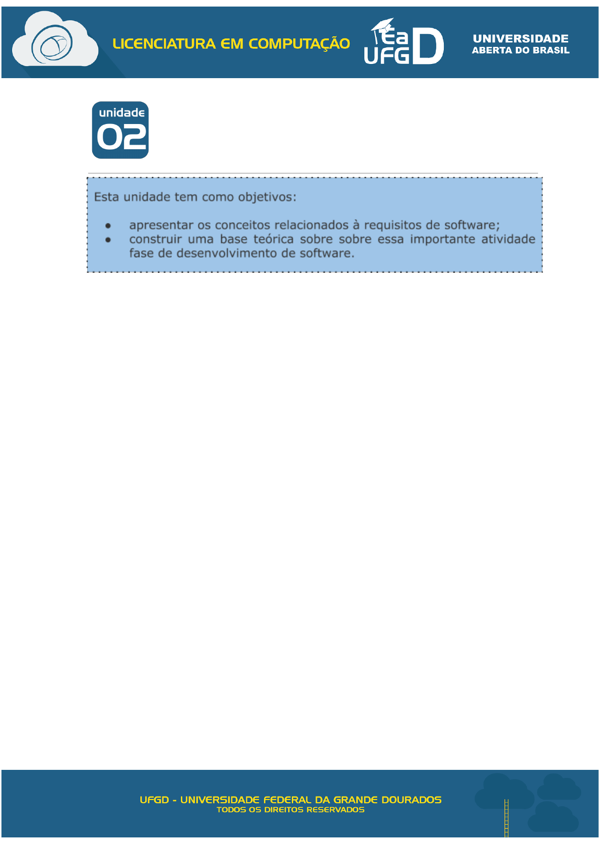 Requisitos de Software Prezados (as) acadêmicos (as)! É com grande satisfação que iniciamos a nossa segunda unidade da disciplina de Requisitos, Análise e Projeto de Sistemas do curso de Licenciatura em Computação, que trata das características e conceitos que envolvem esta disciplina tão atual no cotidiano dos profissionais da computação. Nesta unidade, estudaremos tópicos que objetivam fazer com que o aluno construa uma base de conhecimento que o permita realizar atividades voltadas à disciplina de Requisitos. Os objetivos específicos são: ● conceituar o que são Requisitos funcionais e não funcionais; ● identificar pontos relevantes pertinentes às disciplinas de Requisitos; ● compreender a importância da utilização de ferramentas e UML para essa atividade. Como leitura obrigatória desta unidade, selecionamos o texto ‘Requisitos de Software’ disponível na Aba “Biblioteca” e na ferramenta “Conteúdo Interativo”. Após a leitura atenta aos textos, vocês deverão realizar a atividade avaliativa: questionário com valor máximo: 100 pontos. A Leitura obrigatória é essencial para que vocês possam, de forma produtiva, construir o conhecimento nesta unidade, bem como participar das atividades avaliativas. Fiquem atentos ao prazo de encerramento da unidade e da atividade avaliativa. Se vocês tiverem alguma dúvida, não hesitem em entrar em contato com o seu tutor para saná-la. Além disso, procure discutir as temáticas apresentadas neste material com os seus colegas de curso, seja no ambiente de aprendizagem ou no polo de sua cidade. Bom trabalho! REQUISITOS DE SISTEMAS PARTE A - CONCEITOS FUNDAMENTAIS 1. Introdução O desenvolvimento de software objetiva criar soluções computacionais em software que atendam às necessidades de clientes e usuários. Uma correta especificação dos requisitos do software é essencial para evitarmos o esforço dispendioso de desenvolvimento. Mesmo que um sistema tenha sido bem projetado e codificado, se ele for mal especificado provavelmente frustrará o usuário e causará desconforto à equipe de desenvolvimento, que terá de modificá-lo para se adequar às necessidades do cliente. Os requisitos abrangem a definição do que o sistema deve realizar, suas propriedades e as restrições que envolvem sua operação e o processo de desenvolvimento. A interação efetiva entre os clientes e usuários do software e os desenvolvedores geralmente resulta na definição eficaz de requisitos. Os requisitos do sistema não são influenciados somente pelas preferências dos usuários, mas também por questões organizacionais. Geralmente, inúmeras dificuldades são encontradas pela equipe desenvolvedora quanto ao entendimento da informação fornecida pelo cliente / usuário. Os requisitos são frequentemente registrados de maneira desorganizada e desperdiça-se tempo verificando o que de fato foi registrado, permitido que as modificações nos requisitos controlem a equipe desenvolvedora ao invés de se estabelecer um controle de modificações. Falha-se na fundamentação sólida para o desenvolvimento de software e, quando esses problemas se combinam, a perspectiva é danosa mesmo para os gerentes e profissionais mais experientes. Mas há uma boa notícia: existem soluções para esses problemas e elas abrangem a definição correta dos requisitos funcionais e dos requisitos não funcionais do sistema. 40 2. Requisitos Funcionais Os requisitos funcionais de um sistema descrevem o que o sistema deve fazer. Esses requisitos dependem do tipo de software que está sendo desenvolvido, dos usuários a que o software se destina e da abordagem geral considerada pela organização ao redigir os requisitos. Os requisitos funcionais descrevem detalhadamente as funcionalidades, entradas, saídas e exceções do sistema. O nível de detalhamento do requisito pode variar, conforme os exemplos abaixo: ● Exemplo 1: O usuário deve ser capaz de fazer uma busca em todo o banco de dados ou selecionar uma visão nele baseado (requisito pouco detalhado). ● Exemplo 2: O sistema deve fornecer telas apropriadas para o usuário visualizar os documentos do repositório (requisito pouco detalhado). ● Exemplo 3: Para cada pedido deve ser alocado um identificador único Order_ID (requisito bem detalhado). Em uma especificação de requisitos funcionais, os serviços exigidos pelo usuário devem ser definidos (completeza) e os requisitos não devem ter definições contraditórias (consistência). Porém, é muito difícil atingir a completeza e consistência em sistemas grandes e complexos, pois além de ser fácil cometermos erros e omissões na especificação, há diferentes stakeholders[1] que possuem diferentes necessidades. Ainda, interpretações incorretas normalmente resultam na especificação de requisitos inconsistentes. Com isso, os problemas podem aparecer apenas depois de uma análise mais profunda ou, às vezes, depois que o desenvolvimento estiver concluído e o sistema tiver sido entregue para o cliente. 3. Requisitos Não Funcionais Os requisitos não funcionais definem as restrições do sistema, como a capacidade dos dispositivos de entrada/saída e as representações de dados utilizadas nas interfaces do sistema. Podem 41 especificar desempenho, proteção, disponibilidade e outras propriedades emergentes do sistema. Abrangem também restrições de orçamento, políticas organizacionais, interoperabilidade com outros sistemas de software ou hardware, regulamentos de segurança ou legislação sobre privacidade, conforme ilustrado na Figura 2.1. Geralmente são mais importantes que os requisitos funcionais, pois o não atendimento a um requisito não funcional pode comprometer o funcionamento de todo o sistema. Por outro lado, os usuários costumam contornar uma situação em que uma determinada funcionalidade do sistema não atende à sua necessidade. [1] O termo stakeholder define a pessoa ou grupo afetado direta o
