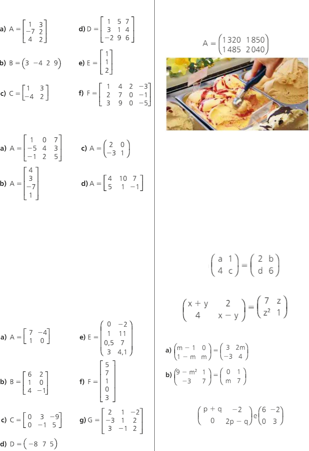 MATRIZES – REPRESENTAÇÃO DE MATRIZES | MATRIZES ESPECIAIS | IGUALDADE DE MATRIZES 1. Dê o tipo (formato) de cada uma das seguintes matrizes: 2. Em cada caso, determine o elemento a22, se existir: 3. Escreva a matriz A = (aij)2 x 2, em que aij = 3i — 2j. 4. Determine a matriz B = (bij)3 x 2, sendo bij = 2 + i + j. 5. Qual é a soma dos elementos da matriz C = (cij)2 x 4, em que cij = 1 + i - j? 6. Em cada caso, obtenha a transporta da matriz dada: 7. Na matriz seguinte, estão representadas as quantidades de sorvetes de 1 bola e de 2 bolas comercializados no primeiro bimestre de um ano em uma sorveteria: Cada elemento aij dessa matriz representa o número de unidades do sorvete do tipo i (i = 1 representa uma bola e i = 2, duas bolas) vendidas no mês j (j = 1 representa janeiro e j = 2, fevereiro). a) Quantos sorvetes de duas bolas foram vendidos em janeiro? b) Em fevereiro, quantos sorvetes de duas bolas foram vendidos a mais que os de uma bola? c) Se o sorvete de uma bola custa R$ 3,00 e o de duas bolas custa R$ 5,00, qual foi a arrecadação bruta da sorveteria no primeiro bimestre com a venda desses dois tipos de sorvete? 8. Determine os números reais a, b, c e d para que se tenha 9. Determine x, y e z reais que satisfaçam 10. Em cada item determine, caso exista, o número real m que satisfaz a igualdade: 11. Determine os números reais p e q de modo que as matrizes sejam iguais: