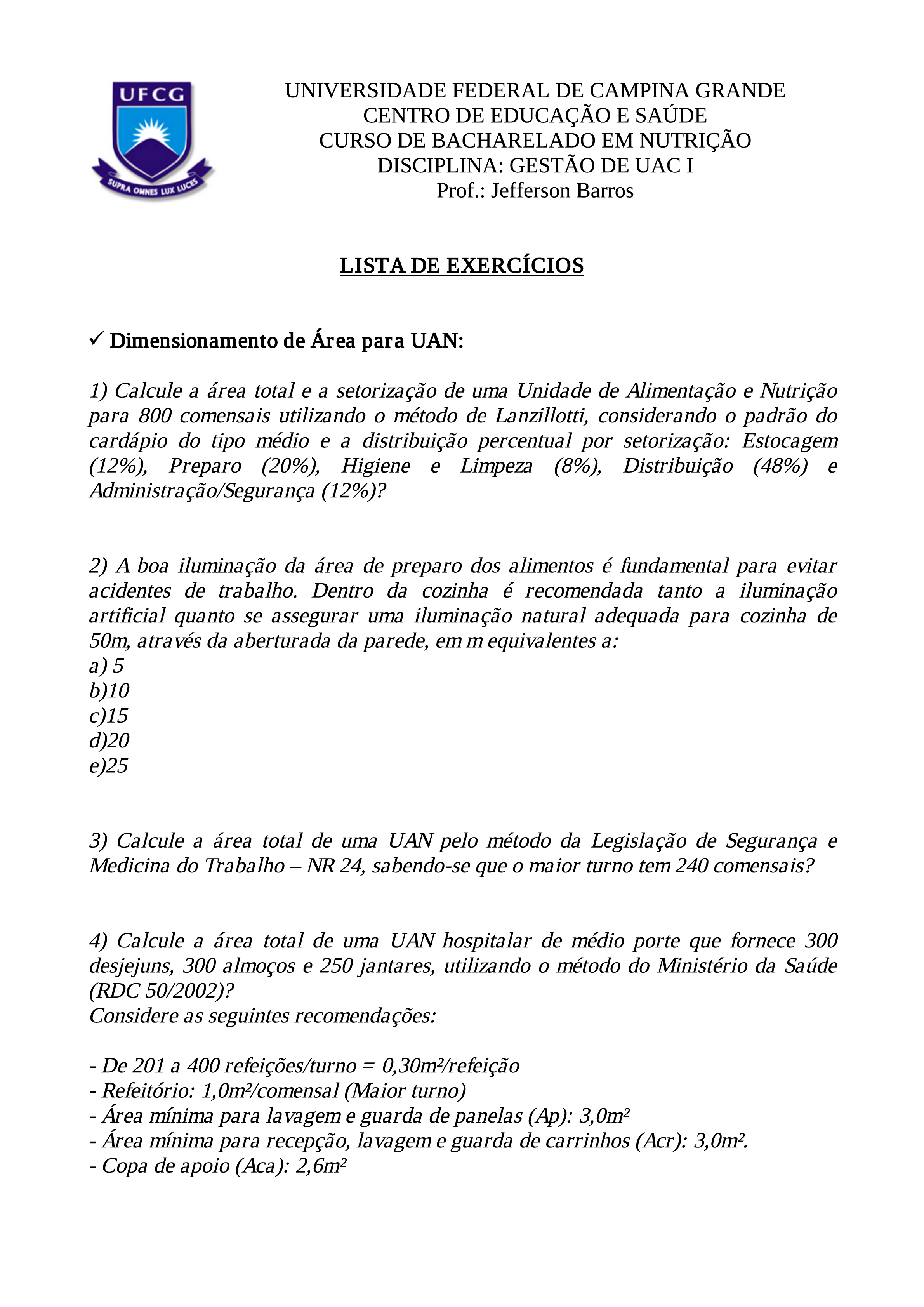 UNIVERSIDADE FEDERAL DE CAMPINA GRANDE CENTRO DE EDUCAÇÃO E SAÚDE CURSO DE BACHARELADO EM NUTRIÇÃO DISCIPLINA: GESTÃO DE UAC I Prof.: Jefferson Barros LISTA DE EXERCÍCIOS Dimensionamento de Área para UAN: 1) Calcule a área total e a setorização de uma Unidade de Alimentação e Nutrição para 800 comensais utilizando o método de Lanzillotti, considerando o padrão do cardápio do tipo médio e a distribuição percentual por setorização: Estocagem (12%), Preparo (20%), Higiene e Limpeza (8%), Distribuição (48%) e Administração/Segurança (12%)? 2) A boa iluminação da área de preparo dos alimentos é fundamental para evitar acidentes de trabalho. Dentro da cozinha é recomendada tanto a iluminação artificial quanto se assegurar uma iluminação natural adequada para cozinha de 50m, através da aberturada da parede, emm equivalentes a: a) 5 b)10 c)15 d)20 e)25 3) Calcule a área total de uma UAN pelo método da Legislação de Segurança e Medicina do Trabalho – NR 24, sabendo-se que o maior turno tem 240 comensais? 4) Calcule a área total de uma UAN hospitalar de médio porte que fornece 300 desjejuns, 300 almoços e 250 jantares, utilizando o método do Ministério da Saúde (RDC 50/2002)? Considere as seguintes recomendações: - De 201 a 400 refeições/turno = 0,30m²/refeição - Refeitório: 1,0m²/comensal (Maior turno) - Área mínima para lavagem e guarda de panelas (Ap): 3,0m² - Área mínima para recepção, lavagem e guarda de carrinhos (Acr): 3,0m². - Copa de apoio (Aca): 2,6m² 5) Calcule a área total da UAN de uma Indústria (coletividade sadia) pelos métodos da CLT e Lanzillotti (Recomendação: 0,60m²/pessoa) que fornece 1000 refeições/dia, tendo o maior turno com 510 refeições e padrão de cardápio médio? 6) Uma cozinha com 400m deve ter área de ventilação no mínimo de: A. 20m B.40 m C.60m D.80m E.70m Dimensionamento de Equipamentos para UAN: 1) Um caldeirão possui 1 m de diâmetro e 0,30 de altura. Qual será sua capacidade e qual a quantidade de arroz que nele poderá ser preparada de uma só vez, tomando por base os dados a seguir: Per capita= 70 Índice de absorção= 2 Formulação da camada de ar= 10% a) 211 L e 211 kg b) 211 L e 106 kg c) 235 L e 235 kg d) 105 L e 105 kg e) 235 L e 106 kg 2) Calcule a quantidade máxima de arroz cru que um caldeirão de 300L poderá suportar? Dados: - Fcç = 2,20 - Câmara de ar = 10% 3) Baseando-se nos dados do exercício anterior, calcule o peso final da preparação (arroz), para 980 comensais, com um per capita de 60g e analise se o caldeirão acima comporta este volume? 4) Sabendo que o fator de correção de um alimento que não se altera pela cocção é de 1,1 e seu per capita é de 120 g , determine o peso bruto necessário para atender uma clientela de 2.000 comensais: a) 211 kg b) 210 kg c) 220 kg d) 264 kg e) 240 kg 5) O dimensionamento dos equipamentos utilizados em uma unidade de alimentação e nutrição constitui uma tarefa que requer experiência do nutricionista. Quantos quilos de arroz é possível preparar em um caldeirão de 150 litros considerando o fator de cocção do arroz é igual a 3? a) 35 b) 45 c) 55 d) 65 e) 75 6) Um nutricionista de um UPR necessita comprar um caldeirão que comporte arroz para 1.000 comensais. Qual a capacidade para este caldeirão? Dados: Fator de cocção = 2,20 Câmara de ar = 10% 7) Um caldeirão com 90 cm de diâmetro interno e com uma profundidade igual a 48,5 cm, qual o seu volume? Dados: D = 90 cm h = 48,5 cm R = 90/2 = 45 cm Sendo: 1 cm³ = 1 mL 8) Um recipiente cilíndrico com 30cm de diâmetro e 90cm de altura deve ser posicionado para transportar o suco preparado até uma determinada área da distribuição, devendo atender 250 comensais com uma porção de 200ml. Qual seria a altura no interior do recipiente para o atendimento previsto? 9) Calcule a capacidade de um caldeirão para preparar arroz, sendo um per capita de 80g, fator de cocção 3 e o número de refeições de 200? 10) Uma preparação de cenoura deve ser colocada em cubas de 30 x 40 x 25 cm. A preparação representa 123 kg e sua densidade é de 0,89. Quantas cubas serão necessárias para acomodar a preparação? 11) Considerando uma câmara de um forno elétrico prepara aproximadamente 14,5 Kg de galinha em 25 minutos, quantas câmaras serão necessárias para assar 300 Kg em 3 horas? 12) Aescolha adequada e o dimensionamento correto dos equipamentos de Unidades de Alimentação e Nutrição requerem do nutricionista conhecimento específico e atenção aos objetivos definidos. Diante do exposto, marque a opção CORRETA que indica a capacidade mínima, em litros, que uma panela deveria ter para preparar arroz, sabendo-se que: o per capita cru da instituição é de 100g, o fator de cocção é 3(três) e que a preparação será distribuída a 500 pessoas. (A) 150 L (B) 324 L (C) 165 L (D) 565 L (E) 54 L