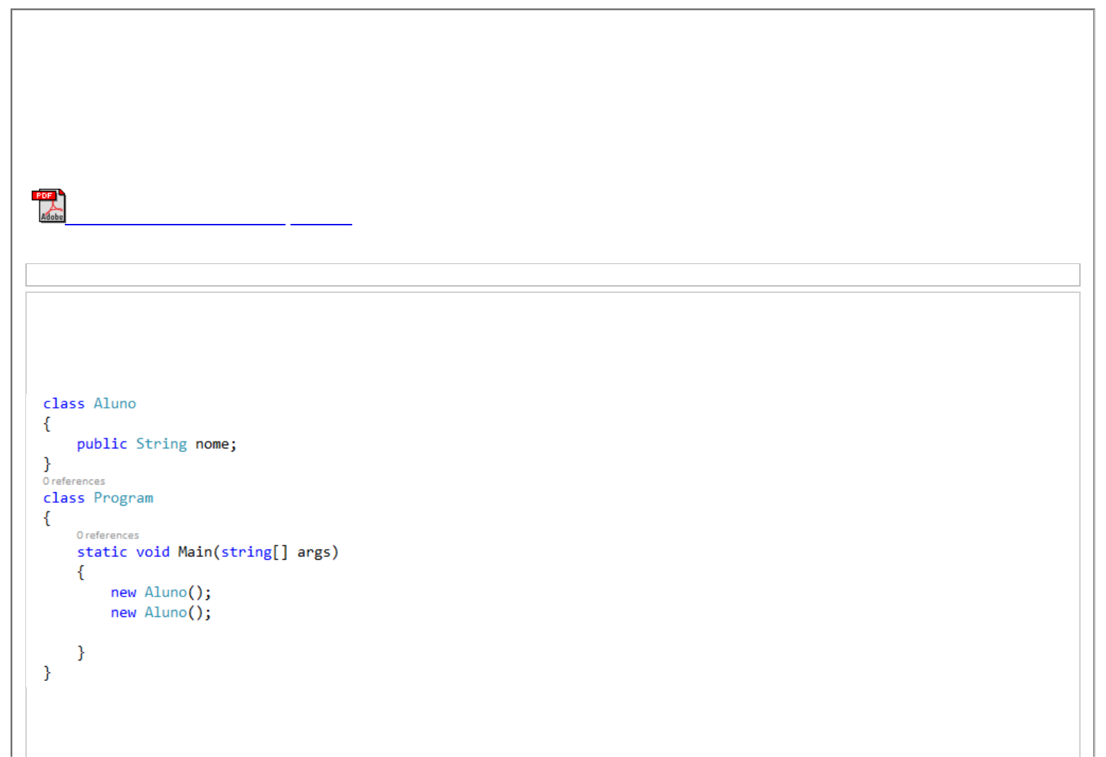 Estudos Disciplinares (ED) Os estudos disciplinares são atividades supervisionadas por professores e devem ser desenvolvidas, obrigatoriamente, pelos estudantes conforme informações previstas no manual a seguir: Manual dos Estudos Disciplinares Exercício 1: Dado o código abaixo: Considere as afirmações abaixo: https://online.unip.br/Arquivo?id=37730.PDF I. O programa não compila pois não apresenta instanciação. II. O programa cria duas instâncias III. Os objetos caso compilasse não cria objetos. Justifique mostrando em qual capítulo - e ítem do conteúdo online explica a resolução. A) Somente a afirmação I. está correta B) Somente a afirmação II. está correta C) Somente a afirmação III. está correta D) Mais de uma afirmação está correta E) nenhuma das afirmações está correta. O aluno respondeu e acertou. Alternativa(B) Comentários: B) O programa apenas vai criar duas instancias e nenhum objeto para ser manipulado. Exercício 2: Dado o código abaixo: Qual a saída? Justifique transcrevendo a sequência de linhas executadas pelo código. 30,c1-11,c1-12,c1-18,c1-20,c1-21,c1-22,c1-23,c1-15 A) B) C) D) E) O aluno respondeu e acertou. Alternativa(D) Comentários: D) O sistema vai executar prime 2 porem como temos uma implementação para executar o construtor 3 ele escrevera o construtor 3, e depois escrevera o construtor 2. Exercício 3: Dado o código abaixo: Qual a saída? Justifique escrevendo a sequência de linhas executadas pelo programa. 30,c1-11,c1-12,c1-18,c1-20,c1-21,c1-22,c1-23,c1-15 A) B) C) D) E) O aluno respondeu e acertou. Alternativa(D) Comentários: D) Ele vai executar o construtor 2 , porem ele executará 3 depois o 2 pois foi implementado o construtor 3 no 2. Exercício 4: Considere o código abaixo: Quala saída? Justifique escrevendo a sequência de execução . 27, c1-5, c1-7, 28, c1-18, c1-20, c1-13, c1-15, c1-9, c1-11, c1-16, 29 A) B) C) D) E) O aluno respondeu e acertou. Alternativa(D) Comentários: D) Primeiro o numero três é passado para o construtor, dentro do construtor a variável d1 é carregada, logo em seguida é executado o metodo1(), que dentro dele é executado um método de sobrecarga do metodo1, que executa a próxima sobrecarregado método assim votando e finalizando com o valor 54. Exercício 5: A classe Classe1 abaixo necessita ser totalmente encapsulado, sendo que o atributo total não pode ter acesso externo para modificação. Qual das alternativas apresenta o encapsulamento correto? A) B) C) D) E) O aluno respondeu e acertou. Alternativa(D) Comentários: D) Esta codificação é a que fico mais correta pois, para os encapsulamento de retorn foram iniciados com get e os de entrada com set, ao invoca-los foi usado de forma correta, e não ex: c1.setNome = "" mas sim c1.setNome (""). Exercício 6: Tomando como base as classes abaixo Considere as seguintes operações: 1. Montar os carros com os seus motores Carro Cor Motor c1 Preto m1 c2 Prata m2 Motor Cilindros Capacidade m1 4 1.0 m2 4 1.6 m3 4 1.8 2 - Trocar o motor do carro c2 para m3 3 - Aumentar a capacidade do motor do carro c1 para 1.2 Qual dos programas executa estas operações/ Justifique mostrando os erros das alternativas incorretas. A) B) C) D) E) O aluno respondeu e acertou. Alternativa(B) Comentários: B) A- incorreta devido ser declarado carro primeiro c1,c2. c- incorreta devido não possuir motor m1,m2. d- incorreta devido m2=m3; no caso só ira trocar o motor mais não esta declarado de qual carro sera trocado / m1.capacidade=1.2; esta incorreto porque não informa de qual carro ira trocar o certo seria c1. e- incorreto porque esta escrito carro na variável daria erro porque c1 e c2 já reprsenta os dois carros. Exercício 7: Considere o código abaixo: Qual o resultado mostrado na tela ? Justifique escrevendo a sequência de execução 19, c1-1, c1-8, c1-10, c1-12, c1-1, c1-3, c1-5, 20, c2-8, c2-10, c2-12 A) B) C) D) E) Erro, não compila. O aluno respondeu e acertou. Alternativa(D) Comentários: D) Ao executar o construtor da classe 1 ele á carregara a classe 2 assim escrevendo lugar2 logo em segui ele termina a classe 1 escrevendo lugar1 depois executa aclasse 2 escrevendo novamente classe2 Exercício 8: Dada a tela abaixo: QUal dos programas gerou a tela? Justifique mostrando a sequência de execução. A) B) C) D) E) O aluno respondeu e acertou. Alternativa(B) Comentários: B) Após executar todos construtores e suas dependências o programa vai chegar ao resultado 2 4 8 Exercício 9: Ao executar o programa abaixo qual a saída, Justifique escrevendo a sequência de execução. A) B) C) D) E) O aluno respondeu e acertou. Alternativa(C) Comentários: C) ao executar o programa ira aparece 73 Exercício 10: Considere o programa abaixo: Qual a instrução a ser colocada na linha 90 para alterar o ano da contratação do empregado p para 2014? A) e.getContracao().setAno(2014); B) e.getEmpregado(getContratacao(setAno(2014))); C) e.setContracao(setAno(2014)); D) e.pessoa.contratacao.ano=2014; E) e.contratacao.ano=2014; O aluno respondeu e acertou. Alternativa(A) Comentários: C) e.setContracao(setAno(2014)); sera colocado na linha 90. E) e.setContracao(setAno(2014)); sera colocado na linha 90. D) sera colocado na linha 90. A) sera colocado na linha 90. Exercício 11: Considere o código abaixo: Qual a saída ao executar o programa? A) B) C) D) E) Erro, o programa não compila O aluno respondeu e acertou. Alternativa(B) Comentários: A) Ao compilar ira aparecer essa expressão. E) não compila B) Ao compilar ira aparecer essa expressão. Exercício 12: Considerando o código abaixo, qual a saída ao executá-lo? Justifique escreventas linhas percorridas durante a execução. A) B) C) D) E) O aluno respondeu e acertou. Alternativa(C) Comentários: A) Ao executar o programa aparece essa sequencia 3 m z x w. C) Ao executar o programa aparece essa expressão