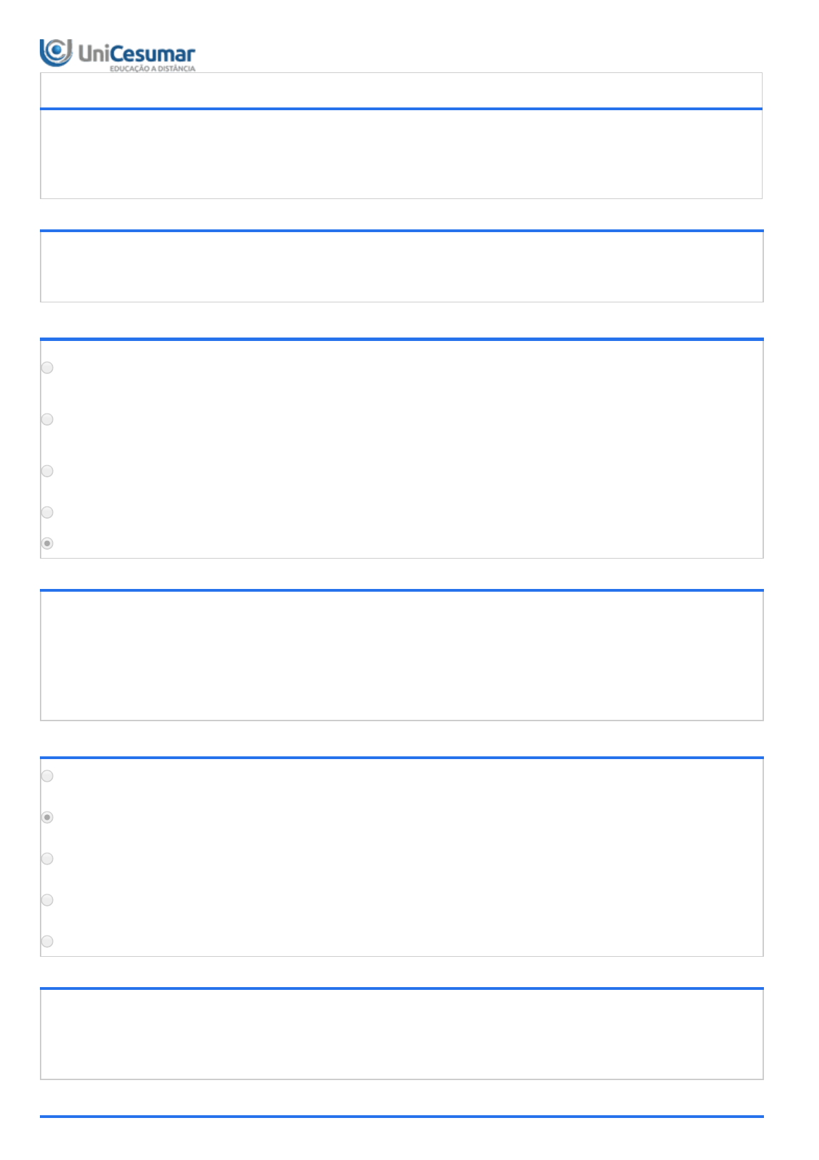 15/02/2020 Unicesumar - Ensino a Distância 1/3 PROVA GO - PROJETO DE VIDA - 2019A Período:12/11/2019 08:00 a 24/04/2020 23:59 (Horário de Brasília) Status:ABERTO Nota máxima:6,00 Gabarito:Gabarito será liberado no dia 25/05/2020 00:00 (Horário de Brasília) Nota obtida: 1ª QUESTÃO Quando buscamos a realização do projeto de vida buscamos também o equilíbrio em todas as áreas e isso se torna desafiador tendo em vista o ritmo de vida que levamos na atualidade. Sobre os pilares da vida assinale a alternativa correta: ALTERNATIVAS O pilar emocional pode ser definido pela forma como você reage a seus desafios diários, pelo nível de ansiedade, angustia e depressão. O pilar profissional relaciona-se com a carreira profissional, seu crescimento e nível de desempenho avaliados por terceiros e também por você. O pilar financeiro retrata sua relação com dinheiro, considerando não somente quanto você ganha, mas também como você gasta, poupa ou investe. O pilar de saúde e bem estar refere-se ao seu estado de saúde, vitalidade e disposição física. Todas as alternativas estão corretas. 2ª QUESTÃO Em alguns momentos passamos por situações de fracassos e erros no decorrer da vida e precisamos saber lidar com essas situações, pois compreendemos que o fato de não conseguir êxito em uma ou outra atividade não significa que devemos desanimar ou desistir, pelo contrário, precisamos pensar que é um resultado momentâneo e poderá ser revertido dependendo da forma como agirmos a partir dele. Diante de uma situação de fracasso ou erro algumas posturas podem ser consideradas e sobre isso assinale a resposta correta: ALTERNATIVAS Condenar-se é um primeiro passo para reverter o resultado negativo, assim você pensa sobre o que errou. Criticar a situação e analisar seu desempenho pensando em como fazer diferente em uma próxima situação evitando responsabilizar os outros pelo seu fracasso. Justificar é uma postura que ajudará você a compreender o erro e assimilar para que não se repita. Reclamar ou se queixar pode nos ajudar a externalizar o descontentamento e isso é primordial no processo de buscar a melhoria. Todas as alternativas estão corretas. 3ª QUESTÃO A roda da vida é uma ferramenta __________ que objetiva mapear como estão as principais áreas da vida da pessoa em um determinado momento, sendo composta por um __________ com diversas divisões. Cada ________ corresponde a um aspecto importante para se chegar a um equilíbrio pessoal. Assinale a alternativa que melhor completa as lacunas. ALTERNATIVAS 15/02/2020 Unicesumar - Ensino a Distância 2/3 Simples, círculo, divisão Estruturada, triângulo, divisão Complexa, círculo, área Simples, triângulo, divisão Complexa, círculo, divisão 4ª QUESTÃO Conquistar o equilíbrio nas diferentes áreas da vida é sem dúvidas um grande desafio que nos permite desenvolver um olhar sobre a qualidade e plenitude de nossa vida. Considerando a importância de mantermos o equilíbrio nas diferentes áreas da vida, analise as afirmações a seguir e assinale a alternativa correta: I - Devemos observar a vida de forma sistêmica considerando que todos os pilares ou áreas estão de alguma forma, conectados e impactam uns nos outros. II - Quando observamos a vida na perspectiva sistêmica, passamos a enxergá-la em todas as suas áreas e podemos identificar fortalezas e fraquezas, criar metas e concentrar esforços de forma a obter uma vida equilibrada. ALTERNATIVAS As duas afirmações são falsas. A afirmação I é verdadeira e II é falsa. A afirmação I é falsa e a II é verdadeira. As afirmações I e II são verdadeiras e se complementam. As afirmações I e II são verdadeiras, mas não se complementam. 5ª QUESTÃO O principal objetivo do Projeto de Vida é contribuir para a concretização dos sonhos e resultados, ou seja, chegar ao estado desejado. Ao determinarmos um resultado, nos tornamos conscientes da diferença entre o que temos e o que desejamos. Sobre o estado desejado, assinale a alternativa correta: ALTERNATIVAS Quando a meta para o resultado está estabelecida pouco importa o estado atual, uma vez que o estado desejado é o que determinará o alcance da meta. Um resultado é aquilo que você ainda não conseguiu realizar, portanto, é preciso realizar inúmeras tarefas, pois o que importa é estar em constante movimento. Os recursos pessoais devem ser utilizados de forma a gerar a maior quantidade possível de riqueza, uma vez que a prosperidade só pode ser vivenciada pelas pessoas financeiramente bem sucedidas. O estado desejado pode ser conquistado quando temos uma forte orientação para resultados, levando a pensar consistentemente nos objetivos a serem alcançados frente a seus propósitos gerais na vida. Trabalhar com prazos para a consolidação do estado desejado implica em definir suas metas somente no curto prazo, assim os resultados acontecerão mais rapidamente, pois as coisas sempre acontecem ao nosso tempo. 6ª QUESTÃO 15/02/2020 Unicesumar - Ensino a Distância 3/3 Conquistar o equilíbrio nas diferentes áreas da vida é sem dúvidas um grande desafio que nos permite desenvolver um olhar introspectivo sobre a qualidade e plenitude de nossa vida. Na concepção do projeto de vida, devemos buscar o sucesso em todas as áreas, contudo é muito comum as pessoas levarem a vida de forma desequilibrada sacrificando áreas da vida para obter sucesso. Vieira (2010), apresentou um conjunto de dez pilares que se destacam como os principais fundamentos da vida humana e que precisamos gerenciar. Acerca desses pilares, relacione as colunas a seguir: 1. Espiritualidade. 2. Família. 3. Saúde e bem estar. 4. Desenvolvimento pessoal. 5. Equilíbrio emocional. ( ) Refere-se ao estado de saúde, vitalidade e disposição física do indivíduo. Nesse quesito avalia-se também o preparo físico, energia e flexibilidade e a ausência de dores, obesidade e limitações físicas. ( ) Refere-