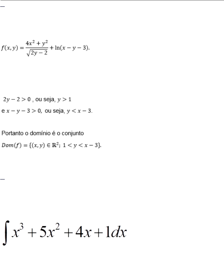 Disciplina: Cálculo Diferencial e Integral II (MAD103) Avaliação: Avaliação Final (Discursiva) - Individual FLEX ( Cod.:512671) ( peso.:4,00) Prova: 17802099 Nota da Prova: - Parte superior do formulário 1. Análogo a funções de uma variável, podemos definir que o domínio de uma função de duas variáveis f é o conjunto de todos os pontos (x, y), tais que a função f (x, y) pode ser calculada. Determine o domínio da função a seguir, apresentando os cálculos para justificar. Resposta Esperada: Precisamos determinar os valores de x e y que podemos aplicar a função 2. Com relação ao conceito de integral, existem várias aplicações que podemos destacar, principalmente na área das engenharias. A relação entre as derivadas e integrais tornou-se uma das ferramentas mais poderosas para analisar diversos fenômenos. O primeiro passo para se construir o conceito de integral é estudar alguns critérios de cálculo. Resolva a integral indefinida a seguir: Resposta Esperada: Parte inferior do formulário