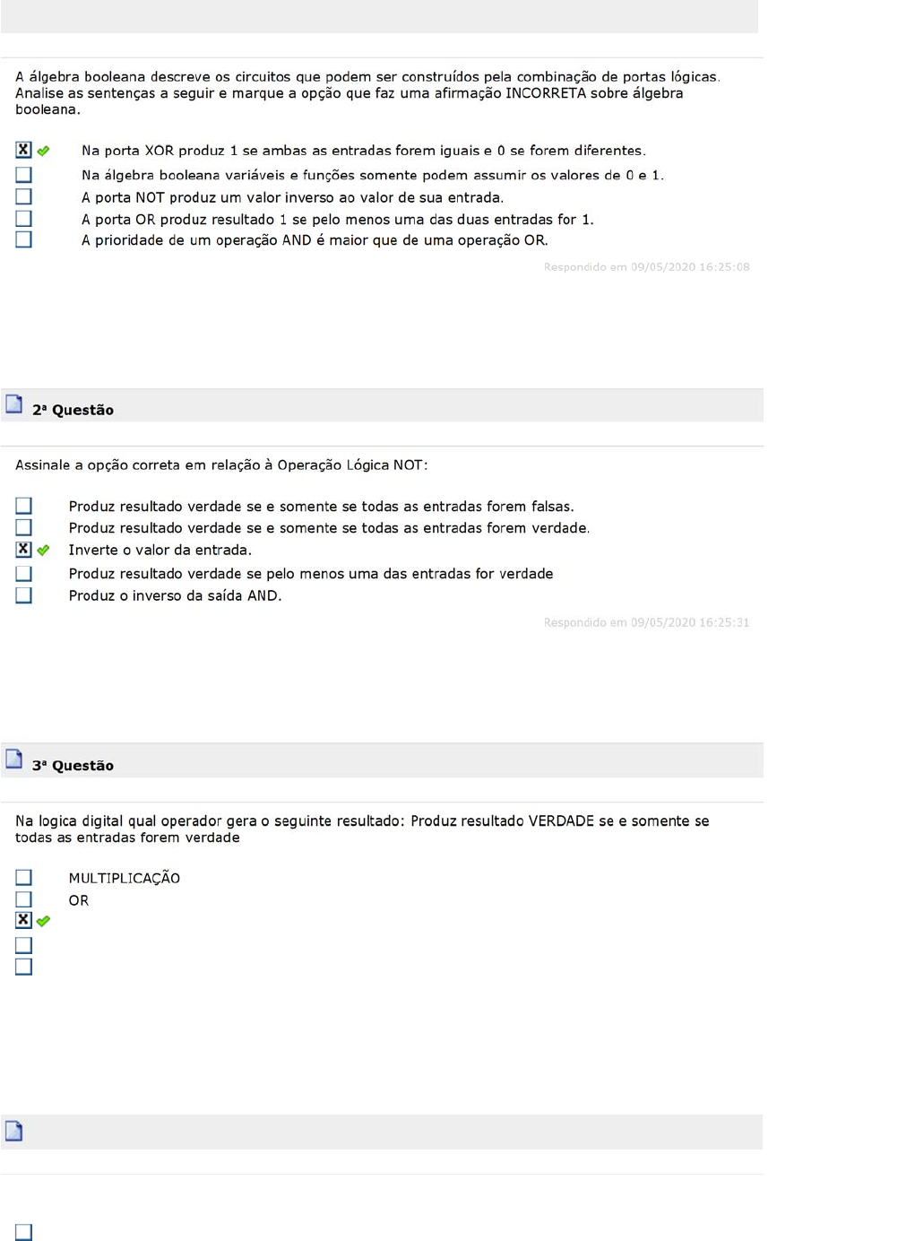 1a Questão A álgebra booleana descreve os circuitos que podem ser construídos pela combinação de portas lógicas. Analise as sentenças a seguir e marque a opção que faz uma afirmação INCORRETA sobre álgebra booleana. Na porta XOR produz 1 se ambas as entradas forem iguais e 0 se forem diferentes. Na álgebra booleana variáveis e funções somente podem assumir os valores de 0 e 1. A porta NOT produz um valor inverso ao valor de sua entrada. A porta OR produz resultado 1 se pelo menos uma das duas entradas for 1. A prioridade de um operação AND é maior que de uma operação OR. Respondido em 09/05/2020 16:25:08 2a Questão Assinale a opção correta em relação à Operação Lógica NOT: Produz resultado verdade se e somente se todas as entradas forem falsas. Produz resultado verdade se e somente se todas as entradas forem verdade. Inverte o valor da entrada. Produz resultado verdade se pelo menos uma das entradas for verdade Produz o inverso da saída AND. Respondido em 09/05/2020 16:25:31 3a Questão Na logica digital qual operador gera o seguinte resultado: Produz resultado VERDADE se e somente se todas as entradas forem verdade MULTIPLICAÇÃO OR AND NOT SOMA Respondido em 09/05/2020 16:25:49 4a Questão Assinale a opção correta em relação à Operação Lógica NOR: Produz resultado verdade se os valores de sua entrada forem diferentes. Produz resultado verdade se e somente se todas as entradas forem verdade. Inverte o valor da entrada. Produz resultado verdade se pelo menos uma das entradas for verdade. Produz resultado verdade se e somente se todas as entradas forem falsas. Respondido em 09/05/2020 16:27:36 5a Questão A função OU(OR) é representada pela expressão: A + B A . B + C A . B A / B A @ B Respondido em 09/05/2020 16:25:57 6a Questão Os circuitos digitais são formados por elementos, chamados portas, capazes de manipular apenas grandezas binárias. As portas são, então, elementos de hardware que recebem um ou mais sinais de entrada e produzem um sinal de saída, cujo valor é o resultado de uma operação lógica. Analise as três sentenças abaixo sobre as operações lógicas executadas pelas portas e, em seguida, assinale a alternativa correta: I. A porta lógica NOR produz resultado verdade se e somente se todas as entradas forem verdade II. A porta lógica AND produz resultado verdade se e somente se todas as entradas forem falsas III. A porta lógica NOT somente inverte a entrada Somente as sentenças II e III estão corretas Somente as sentenças I e III estão corretas Todas as sentenças estão corretas Somente a sentença III está correta Somente a sentença I está correta Respondido em 09/05/2020 16:26:07 7a Questão Encontre o valor de X, para: A = 0111 e B = 0111, calcule X = A+B (OR) 0011 1000 1010 0101 0111 Respondido em 09/05/2020 16:26:01 8a Questão Assinale a alternativa correta que completa a lacuna do texto. Circuitos lógicos são montados a partir da combinação de uma unidade básica construtiva denominada_____, a qual é obtida mediante a combinação de transistores e dispositivos semicondutores auxiliares. Registradores ULA Barramento de Dados Barramento de Controle Porta Lógica 1a Questão Para representar números inteiros negativos, os computadores utilizam a representação ____________, pois esta possui _______________________ para o zero e utiliza ________________ para soma e subtração. Assinale a alternativa que contém as opções que preenchem corretamente os espaços em branco da frase acima de sinal e magnitude; duas representações para o zero; dois circuitos separados de sinal e magnitude; somente uma representação para o zero; dois circuitos separados de complemento à 2; duas representações para o zero; um único circuito de complemento à 2; somente uma representação para o zero; um único circuito de sinal e magnitude; somente uma representação para o zero; um único circuito Respondido em 09/05/2020 16:28:02 Explicação: Para representar números inteiros negativos, os computadores utilizam a representação _____de complemento à 2_______, pois esta possui ___________somente uma representação para o zero____________ para o zero e utiliza ______ um único circuito__________ para soma e subtração. 2a Questão Assinale a opção correta em relação à Operação Lógica AND : Inverte o valor da entrada. Produz resultado verdade se e somente se todas as entradas forem falsas. Produz resultado verdade se os valores de sua entrada forem diferentes. Produz resultado verdade se pelo menos uma das entradas for verdade Produz resultado verdade se e somente se todas as entradas forem verdade. Respondido em 09/05/2020 16:28:27 3a Questão Foi criado um circuito lógico onde ele combina 2 entradas, cada uma formadas por 3 bits. Chamamos estas entradas de A e B. Se em determinado momento o valor da entrada A é 011 e de B é 110 e a expressão que representa em circuito é A XOR B, qual será a saída para estas entradas? 000 101 222 111 010 Respondido em 09/05/2020 16:29:06 4a Questão Considere A=101 e B=110, sendo esses valores representados em binário. O valor de y para = A.B, ou seja, y=A and B, é: 110 011 111 100 101 Respondido em 09/05/2020 16:29:40 5a Questão Considere a expressâo (A+C).B tendo os valores A=1; B=1 e C=1 qual o resultado correto 3 58 20 0 1 Respondido em 09/05/2020 16:29:50 6a Questão Uma porta lógica possui saída 0 somente se todas suas entradas forem 1, caso contrário a saída é 1. Que porta lógica é essa? NAND XOR NOR AND OR Respondido em 09/05/2020 16:29:41 7a Questão A porta lógica que representa o circuito que implementa a função XOR é: Respondido em 09/05/2020 16:30:14 8a Questão A FUNÇÃO E(AND) É CARACTERIZADA PELO OPERADOR LÓGICO: SUBTRAÇÃO S0MA E PRODUTO DE FORMA CONCOMITANTE. PRODUTO DIVISÃO SOMA Respondido em 09/05/2020 16:30:53 1a Questão Assinale a opção correta em relação à Operação Lógica OR: Produz resultado verdade se e s