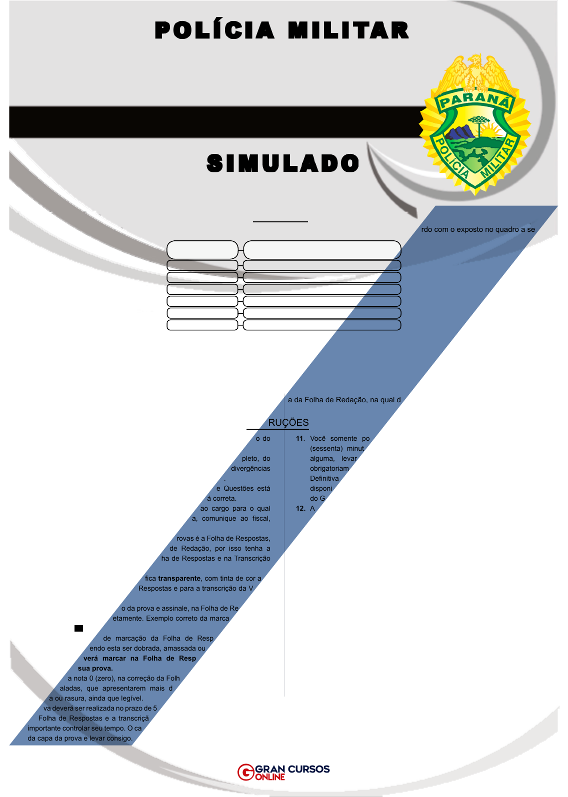 P O L Í C I A M I L I TA RP O L Í C I A M I L I TA R S I M U L A D OS I M U L A D O POLÍCIA MILITAR DO PARANÁ SOLDADO DE 2ª CLASSE ATENÇÃO INSTRUÇÕES SOLDADO DE 2ª CLASSE PC/PR – SIMULADO PREPARATÓRIO PARA CONCURSO PÚBLICO O Caderno de Questões possui 40 (quarenta) questões objetivas numeradas sequencialmente, e 01 (uma) redação, de acordo com o exposto no quadro a seguir: Será entregue, pelo fiscal, a Folha de Respostas personalizada e a Versão Definitiva da Folha de Redação, na qual deverão ser preenchidas as respostas das questões da prova objetiva e transcrita a redação, respectivamente. QUANTIDADE DE QUESTÕES MATÉRIA 1. Este Caderno de Questões não deve ser folheado antes da autorização do fiscal. 2. Na Folha de Respostas, realize a conferência de seu nome completo, do número de seu documento e do número de sua inscrição. As divergências devem ser comunicadas ao fiscal para as devidas providências. 3. Após ser autorizado pelo fiscal, verifique se o Caderno de Questões está completo, sem falhas de impressão e se a numeração está correta. Não esqueça de conferir se sua prova corresponde ao cargo para o qual você se inscreveu. Caso note alguma divergência, comunique ao fiscal, imediatamente. 4. O único documento válido para a correção das provas é a Folha de Respostas, assim como a Versão Definitiva da Folha de Redação, por isso tenha a máxima atenção no preenchimento da Folha de Respostas e na Transcrição da Redação para a Versão Definitiva. 5. Deverá ser utilizada caneta esferográfica transparente, com tinta de cor azul ou preta na marcação da Folha de Respostas e para a transcrição da Versão Definitiva da Redação. 6. Leia atentamente cada questão da prova e assinale, na Folha de Respostas, a opção que a responda corretamente. Exemplo correto da marcação da Folha de Respostas: 7. O limite dos campos de marcação da Folha de Respostas deverá ser respeitado, não podendo esta ser dobrada, amassada ou rasurada. 8. O candidato deverá marcar na Folha de Respostas o número que corresponde a sua prova. 9. Será atribuída nota 0 (zero), na correção da Folha de Respostas, às questões não assinaladas, que apresentarem mais de uma alternativa assinalada, emenda ou rasura, ainda que legível. 10. A prova deverá ser realizada no prazo de 5h (cinco horas), incluindo a marcação da Folha de Respostas e a transcrição da Versão Definitiva da Redação. É importante controlar seu tempo. O candidato poderá anotar o gabarito no verso da capa da prova e levar consigo. 11. Você somente poderá deixar definitivamente a sala de prova após 60 (sessenta) minutos de seu início. O candidato não poderá, em hipótese alguma, levar consigo o Caderno de Questões, sendo necessário, obrigatoriamente, devolver ao fiscal a Folha de Respostas e a Versão Definitiva da Folha de Redação devidamente assinadas. As provas estarão disponibilizadas no site da FAFIPA (www.fafipa.org.br), a partir da divulgação do Gabarito Preliminar. 12. A retirada da sala de prova dos 03 (três) últimos candidatos só ocorrerá conjuntamente e após a conferência de todos os documentos da sala, além da assinatura do termo de fechamento. 13. Durante a prova, não será permitida qualquer espécie de consulta ou comunicação entre os candidatos, nem a utilização de máquinas calculadoras e/ou similares, livros, anotações, réguas de cálculo, impressos ou qualquer outro material de consulta, inclusive códigos e/ou legislação. 14. Será eliminado do concurso público o candidato que, durante a realização das provas, for surpreendido utilizando aparelhos eletrônicos, tais como bip, telefone celular, walkman, agenda eletrônica, notebook, palmtop, receptor, gravador, máquina de calcular, máquina fotográfica, controle de alarme de carro etc., bem como relógio de qualquer espécie, óculos escuros ou quaisquer acessório de chapelaria tais como chapéu, boné, gorro etc., nem a utilização de livros, códigos, manuais, impressos ou anotações, calculadoras, relógios, agendas eletrônicas, pagers, telefones celulares, BIP, Walkman, gravador ou qualquer outro equipamento eletrônico. A utilização desses objetos causará eliminação imediata do candidato. 15. Incorrerá, também, na eliminação do candidato, caso qualquer equipamento eletrônico venha a emitir ruídos, mesmo que devidamente acondicionado no envelope de guarda de pertences, durante a realização das provas. 16. Qualquer tentativa de fraude, se descoberta, implicará em imediata denúncia à autoridade competente, que tomará as medidas cabíveis, inclusive com prisão em flagrante dos envolvidos. 01 a 15 Língua Portuguesa 16 a 27 Raciocínio Matemático 28 a 39 Geografia 40 a 49 História 50 a 56 Informática 57 a 60 Legislação Ba se ad o n o f or m at o d e p ro va ap lic ad o p ela ba nc a F un pa r LÍNGUA PORTUGUESA (MÁRCIO WESLEY) Leia o excerto abaixo. Vivemos grudados em nossos smartphones, __________ eles são úteis e divertidos. __________ o que pouca gente sabe é o seguinte: por trás dos ícones coloridos e apps de nomes engraçadinhos, as gigantes da tecnologia fazem um esforço consciente para nos manipular, usando recursos da psicologia, da neurologia e até dos cassinos. Revista Superinteressante, outubro/2019, p. 22, com adaptações. 01 Assinale a alternativa que preenche corretamente as lacunas acima, na ordem em que aparecem no texto. (A) porquanto – embora. (B) portanto – contudo. (C) pois – todavia. (D) posto que – portanto. (E) ainda que – no entanto. O texto abaixo é referência para as questões de 02 a 04. Ao ser questionado sobre o impacto da pandemia na desigualdade, Harari reafirma que “são as nossas escolhas que vão definir isso”. Mesmo ante uma crise tão grave, que parece não permitir nada mais do que reações, o professor israelense chama ____ atenção para os muitos caminhos possíveis. O enfrenta
