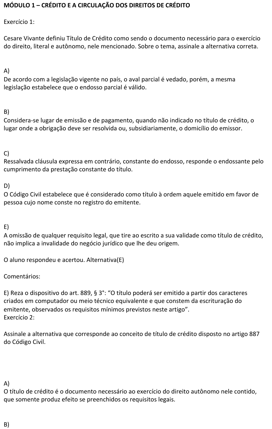 MÓDULO 1 – CRÉDITO E A CIRCULAÇÃO DOS DIREITOS DE CRÉDITO Exercício 1: Cesare Vivante definiu Título de Crédito como sendo o documento necessário para o exercício do direito, literal e autônomo, nele mencionado. Sobre o tema, assinale a alternativa correta. A) De acordo com a legislação vigente no país, o aval parcial é vedado, porém, a mesma legislação estabelece que o endosso parcial é válido. B) Considera-se lugar de emissão e de pagamento, quando não indicado no título de crédito, o lugar onde a obrigação deve ser resolvida ou, subsidiariamente, o domicílio do emissor. C) Ressalvada cláusula expressa em contrário, constante do endosso, responde o endossante pelo cumprimento da prestação constante do título. D) O Código Civil estabelece que é considerado como título à ordem aquele emitido em favor de pessoa cujo nome conste no registro do emitente. E) A omissão de qualquer requisito legal, que tire ao escrito a sua validade como título de crédito, não implica a invalidade do negócio jurídico que lhe deu origem. O aluno respondeu e acertou. Alternativa(E) Comentários: E) Reza o dispositivo do art. 889, § 3°: “O título poderá ser emitido a partir dos caracteres criados em computador ou meio técnico equivalente e que constem da escrituração do emitente, observados os requisitos mínimos previstos neste artigo”. Exercício 2: Assinale a alternativa que corresponde ao conceito de título de crédito disposto no artigo 887 do Código Civil. A) O título de crédito é o documento necessário ao exercício do direito autônomo nele contido, que somente produz efeito se preenchidos os requisitos legais. B) O título de crédito, documento dispensável ao exercício do direito literal e autônomo nele contido, somente produz efeito quando preencha os requisitos da lei. C) O título de crédito, documento necessário ao exercício do direito nele contido, produz efeito independentemente de preenchidos os requisitos legais. D) O título de crédito, documento necessário ao exercício do direito literal e autônomo nele contido, somente produz efeito quando preencha os requisitos da lei. E) O título de crédito é o documento necessário ao exercício do direito literal e autônomo nele contido, que produz seus efeitos independentemente de preenchidos os requisitos legais. O aluno respondeu e acertou. Alternativa(D) Comentários: D) parte da doutrina, ressaltando o fato de o artigo 887 ter definido título de crédito, entende que a literalidade só pode decorrer de lei, e não da vontade das partes. É evidente que as partes podem criar títulos executivos, documentos de legitimação, mas não títulos de créditos com as características definidas no artigo 887 do Código Civil. Exercício 3: Em janeiro de 2019, foi emitido título de crédito, omitindo requisito legal que lhe tira ao escrito a sua validade como título de crédito. De acordo com o Código Civil de 2002, o negócio jurídico que lhe deu origem A) será nulo. B) poderá ser anulado no prazo de 4 anos contados da sua celebração. C) poderá ser anulado no prazo de 4 anos contados da data da emissão do título de crédito. D) não será afetado pela invalidade do título de crédito. E) será inexistente. O aluno respondeu e acertou. Alternativa(D) Comentários: D) O Código Civil de 2002, no seu art. 888, estatui que “a omissão de qualquer requisito legal, que tire ao escrito a sua validade como título de crédito, não implica a invalidade do negócio jurídico que lhe deu origem.” O dispositivo estabelece a regra segundo a qual a nulidade ou anulabilidade da obrigação cambial ou a nulidade da cártula não invalida a causa debendi ou a relação fundamental no dizer de Tulio Ascarelli. Exercício 4: Os princípios de um título de crédito são: A) literalidade, forma, causa. B) forma, causa, abstração. C) abstração, autonomia, literalidade. D) conteúdo, cartela, autonomia. E) NDA O aluno respondeu e acertou. Alternativa(C) Comentários: C) Literalidade: o fato de valer nos títulos apenas o que neles está escrito. Autonomia:não estar o cumprimento das obrigações assumidas por alguém no título vinculado a outra obrigação qualquer, mesmo ao negócio que deu lugar ao nascimento do título. Abstração: Significa isso que os direitos decorrentes do título são abstratos, não dependentes do negócio que deu lugar ao nascimento do título. Exercício 5: Sobre Títulos de Crédito no Código Civil, assinale a alternativa correta. A) A transferência do título de crédito implica a transferência de todos os direitos que lhe são inerentes. B) O pagamento de título de crédito, que contenha obrigação de pagar soma determinada, pode ser garantido por aval parcial. C) Pagando o título, tem o avalista ação de regresso contra o seu avalizado e demais coobrigados posteriores. D) Não subsiste a responsabilidade do avalista quando nula a obrigação daquele a quem se equipara, a menos que a nulidade decorra de vício de forma. E) A omissão de qualquer requisito legal, que tire ao escrito a sua validade como título de crédito, implica a invalidade do negócio jurídico que lhe deu origem. O aluno respondeu e acertou. Alternativa(A) Comentários: A) Apensar da redação do Art. 893, não se pode desconsiderar que existe transferência do título de crédito SEM implicar na de todos os direitos. Endosso é a forma pela qual se transfere a titularidade do crédito escrito no título, através da tradição da própria cártula, sem assinatura no verso, caso não nomidado, ou com assinatura no verso, nominando o endossatário ou não (endosso em branco). Exercício 6: Três Coroas Comércio de Artigos Eletrônicos Ltda. subscreveu nota promissória em favor do Banco Dois Irmãos S.A. com vencimento a dia certo. Após o vencimento, foi aceita uma proposta de moratória feita pelo devedor por 120 (cento e vinte) dias, sem alteração da data de vencimento