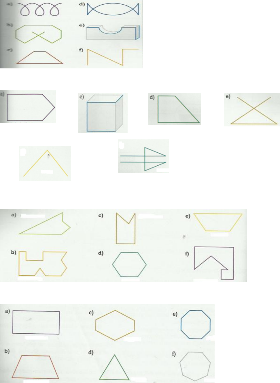TRABALHO DE GEOMETRIA 6º ANO 3º BIMESTRE 2016 1- Verifique quais das figuras são linhas poligonais. 2- Classifique as linhas poligonais em abertas ou fechadas, simples ou não simples. f) g) 3- Verifique quais figuras são polígonos e classifique-os como convexo ou não convexo (côncavo). 4- Dê o nome dos polígonos abaixo. 5- Observe o polígono e responda as questões abaixo? a) Qual é o nome desse polígono? b) Quantos vértices tem esse polígono? c) Quantos ângulos internos tem esse polígono? d) Quantas diagonais partem de cada vértice desse polígono? e) Quantas diagonais tem esse polígono? 6-- O desenho das bandeiras é formado por várias figuras geométricas. Qual ou quais destas bandeiras apresentam apenas figuras que são polígonos? 7- Escreva o nome do polígono que possui: a) 20 ângulos internos ______________________ b) 5 vértices ________________________ c) 10 lados ____________________ d) Duas diagonais __________________ e) O menor número de lados _______________