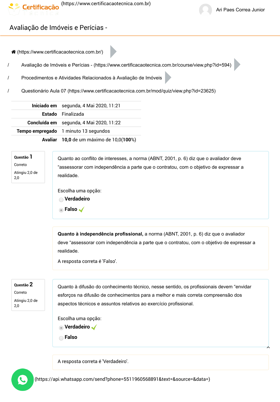 (https://www.certificacaotecnica.com.br) Ari Paes Correa Junior Avaliação de Imóveis e Perícias - Questão 1 Correto Atingiu 2,0 de 2,0 Questão 2 Correto Atingiu 2,0 de 2,0 / / / Iniciado em segunda, 4 Mai 2020, 11:21 Estado Finalizada Concluída em segunda, 4 Mai 2020, 11:22 Tempo empregado 1 minuto 13 segundos Avaliar 10,0 de um máximo de 10,0(100%) Quanto ao conflito de interesses, a norma (ABNT, 2001, p. 6) diz que o avaliador deve “assessorar com independência a parte que o contratou, com o objetivo de expressar a realidade. Escolha uma opção: Verdadeiro Falso Quanto à independência profissional, a norma (ABNT, 2001, p. 6) diz que o avaliador deve “assessorar com independência a parte que o contratou, com o objetivo de expressar a realidade. A resposta correta é 'Falso'. Quanto à difusão do conhecimento técnico, nesse sentido, os profissionais devem “envidar esforços na difusão de conhecimentos para a melhor e mais correta compreensão dos aspectos técnicos e assuntos relativos ao exercício profissional. Escolha uma opção: Verdadeiro Falso A resposta correta é 'Verdadeiro'. (https://www.certificacaotecnica.com.br/) Avaliação de Imóveis e Perícias - (https://www.certificacaotecnica.com.br/course/view.php?id=594) Procedimentos e Atividades Relacionados à Avaliação de Imóveis Questionário Aula 07 (https://www.certificacaotecnica.com.br/mod/quiz/view.php?id=23625) (https://api.whatsapp.com/send?phone=5511960568891&text=&source=&data=) https://www.certificacaotecnica.com.br/ https://www.certificacaotecnica.com.br/ https://www.certificacaotecnica.com.br/course/view.php?id=594 https://www.certificacaotecnica.com.br/mod/quiz/view.php?id=23625 https://api.whatsapp.com/send?phone=5511960568891&text=&source=&data= Questão 3 Correto Atingiu 2,0 de 2,0 Questão 4 Correto Atingiu 2,0 de 2,0 Questão 5 Correto Atingiu 2,0 de 2,0 Para avaliar é preciso conhecer. No caso das avaliações de imóveis, para conhecer é necessário realizar sua vistoria. Inicialmente, devem ser observados aspectos intrínsecos ao imóvel: as áreas, os limites e as formas geométricas, os recuos, a invasão dos limites dos terrenos, entre outros. Deve-se verificar especialmente a orientação solar e a divisão interna para benfeitorias. Escolha uma opção: Verdadeiro Falso A resposta correta é 'Verdadeiro'. O processo de avaliação de um imóvel envolve quantas atividades indicadas pela Norma Brasileira 14.653-1 (ABNT, 2001, p. 6-7) ? Escolha uma: a. Seis. b. Três. c. Quatro. d. Cinco. Sua resposta está correta. A resposta correta é: Seis.. Quando se inicia uma avaliação, a primeira providência a ser tomada é o conhecimento a respeito da documentação disponível. Nesse momento, deve-se buscar elementos que forneçam dados do imóvel, tais como: Escolha uma: a. Documentos legais e documentos técnicos. b. N.D.R. c. Documentos técnicos e documentos textuais. d. Documentos textuais e documentos gráficos. Sua resposta está correta. A resposta correta é: Documentos legais e documentos técnicos.. (https://api.whatsapp.com/send?phone=5511960568891&text=&source=&data=) https://api.whatsapp.com/send?phone=5511960568891&text=&source=&data=