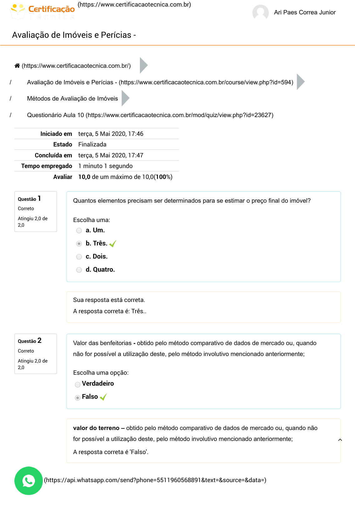 (https://www.certificacaotecnica.com.br) Ari Paes Correa Junior Avaliação de Imóveis e Perícias - Questão 1 Correto Atingiu 2,0 de 2,0 Questão 2 Correto Atingiu 2,0 de 2,0 / / / Iniciado em terça, 5 Mai 2020, 17:46 Estado Finalizada Concluída em terça, 5 Mai 2020, 17:47 Tempo empregado 1 minuto 1 segundo Avaliar 10,0 de um máximo de 10,0(100%) Quantos elementos precisam ser determinados para se estimar o preço final do imóvel? Escolha uma: a. Um. b. Três. c. Dois. d. Quatro. Sua resposta está correta. A resposta correta é: Três.. Valor das benfeitorias - obtido pelo método comparativo de dados de mercado ou, quando não for possível a utilização deste, pelo método involutivo mencionado anteriormente; Escolha uma opção: Verdadeiro Falso valor do terreno – obtido pelo método comparativo de dados de mercado ou, quando não for possível a utilização deste, pelo método involutivo mencionado anteriormente; A resposta correta é 'Falso'. (https://www.certificacaotecnica.com.br/) Avaliação de Imóveis e Perícias - (https://www.certificacaotecnica.com.br/course/view.php?id=594) Métodos de Avaliação de Imóveis Questionário Aula 10 (https://www.certificacaotecnica.com.br/mod/quiz/view.php?id=23627) (https://api.whatsapp.com/send?phone=5511960568891&text=&source=&data=) https://www.certificacaotecnica.com.br/ https://www.certificacaotecnica.com.br/ https://www.certificacaotecnica.com.br/course/view.php?id=594 https://www.certificacaotecnica.com.br/mod/quiz/view.php?id=23627 https://api.whatsapp.com/send?phone=5511960568891&text=&source=&data= Questão 3 Correto Atingiu 2,0 de 2,0 Questão 4 Correto Atingiu 2,0 de 2,0 Questão 5 Correto Atingiu 2,0 de 2,0 Por esse e outros motivos, a Norma Brasileira para Avaliação de Bens estabelece quatro espécies de métodos para se identificar o valor de um bem, seus frutos e direitos que podem ser adotados, tanto para a avaliação de imóveis urbanos quanto de imóveis rurais. Assinale a alternativa que NÃO compõe esse método. Escolha uma: a. Método involutivo; b. Método da capitalização da renda; c. N.D.R. d. Método comparativo direto de dados de mercado; Sua resposta está correta. A resposta correta é: N.D.R.. Método da capitalização da renda é utilizado quando o valor de um bem depende essencialmente de sua capacidade de produzir renda. Logo, ele é muito útil para a avaliação de imóveis (DANTAS, 1998, p. 31). Assinale a alternativa incorreta. Escolha uma: a. Possuem potencial para a geração de renda; nesse caso, pode haver pessoas interessadas em adquirir o bem para ter direito sobre seus rendimentos. b. Não Possuem potencial para geração de renda. c. Apresentam dificuldades para a reprodução, e por isso também excluem a possibilidade de serem avaliados por outros métodos, como o evolutivo ou o involutivo; d. Não se encontram corriqueiramente à venda no mercado, não podendo assim ser comparados e avaliados pelo método comparativo direto de dados de mercado; Sua resposta está correta. A resposta correta é: Não Possuem potencial para geração de renda.. Métodos para identificar o custo de um bem - São dois os métodos possíveis de serem utilizados para determinar o custo de um bem. As respectivas explicações encontram-se a seguir. Escolha uma opção: Verdadeiro Falso A resposta correta é 'Verdadeiro'. (https://api.whatsapp.com/send?phone=5511960568891&text=&source=&data=) https://api.whatsapp.com/send?phone=5511960568891&text=&source=&data= (https://api.whatsapp.com/send?phone=5511960568891&text=&source=&data=) https://api.whatsapp.com/send?phone=5511960568891&text=&source=&data=