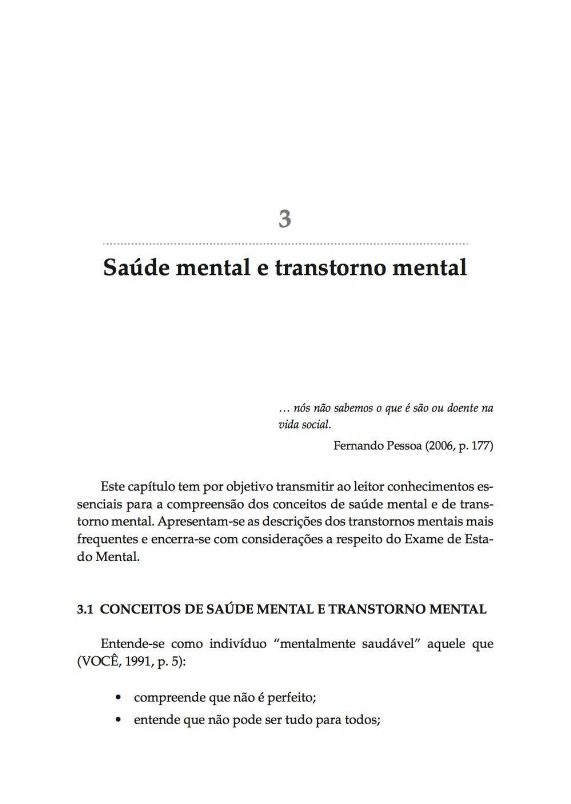 • compreende que nao é perfeito; • entende que nao pode ser tuda para todos; Entende-se como indivíduo "mentalmente saudável" aquele que (VOCE, 1991, p. 5): 3.1 CONCEITOS DE SAÚDE MENTAL E TRANSTORNO MENTAL Este capítulo tem por objetivo transmitir ao leitor conhecimentos es- senciais para a compreensáo dos conceitos de saúde mental e de trans- torno mental. Apresentam-se as descricñes dos transtornos mentais mais frequentes e encerra-se com consideracóes a respeito do Exame de Esta- do Mental. Femando Pessoa (2006, p. 177) . . . nós níio sabemos o que é siio ou doente na vida social. Saúde mental e transtorno mental 3 O transtorno mental impossibilita atuar dentro de padróes de norma- lidade, aceites como tais no ambiente do indivíduo, e isso se toma percep- tível para os demais. Destaque-se que "normalidade e anormalidade existem em um continuum [ ... ]. A primeira vista, pessoas com distúrbios psicológicos siio geralmente indistintas daquelas que niio os iém" (WEITEN, 2002, p. 411). Efetivamente, "delimitar os conceitos de saúde e doenca mental nao é ta- refa fácil, como também definir a nodio de saúde e de normalidade mental. .. as fronteiras siio, em boa medida, relativas, circunstanciais e mutantes", assinalam Gomes e Melina (1997, p. 226). Por isso, o diagnóstico por profissionais especializados é indispensável. As características dos transtornos, orgánicos ou mentáis, transfor- mam-se com o passar do tempo. Novos sao identificados, alguns acen- tuam-se, enquanto outros apresentam reducáo, Por exemplo, registra-se perceptível aumento de transtornos associados a estresse. O mesmo acontece comos resultados dos diagnósticos, explica Thomas Szasz (1996, p. 12), professor emérito de Psiquiatría na State University • funfoes mentais superiores recebem interferencia, dificultando ou afetando a atuacáo (por exemplo, o indivíduo nao consegue lembrar-se de compromissos); • atividades da vida diaria, rotineiras, usualmente necessárias, so- frem comprometimento em algum grau. A pessoa sadia "muda construtos pessoais que se originam de predicoes refutadas pela experiencia. A pessoa nao sadia [ ... ] tem urna teoria sobre con- seouéncias [ ... ] que nao funciona, mas nao consegue mudá-la" (KELLY, apud HALL; LINDZEY; CAMPBELL, 2000, p. 329). A expressáo transtorno mental, adotada em lugar de 11 doenca", acom- panha o critério da CID-10 (1993, p. 5): o desvío ou conflito social sozi- nho, sem comprometimento do funcionamento do indioiduo, nao deve ser in- cluído em transtorno mental. Há comprometimento quando: • vivencia urna vasta gama de emocóes: • enfrenta desafíos e mudancas da vida cotidiana; • procura ajuda para lidar com traumas e transicóes importantes (nao se considera onipotente). Saúde Mental e Transtomo Mental 97 Questáo sempre presente no estudo e na observacáo dos comporta- mentos, e muitas vezes lembrada para tentar justificar delitos, é o papel representado pelo instinto, o "esquema de comportamento herdado, próprio de urna espécie animal, que pouco varia de um indivíduo para outro, que se desenro- la segundo urna sequéncia temporal pouco susceptível de alieracies e que parece corresponder a urna finalidade" (LAPLANCHE; PONTALIS, 1995, p. 241). Observacáo: As pessoas modificam seus comportamentos, involuntariamente, ao se perceberem observadas ou sabendo que isso acorre ou possa aconte- cer: delinquentes, vítimas, testemunhas, profissionais do direito nao fa- zem excecáo. Hawthorne demonstrou, cientificamente, a existencia da ieairalizacdo, em sua célebre e, sob alguns aspectos, surpreendente experiencia com tra- balhadores (HUFFMAN; VERNOY; VERNOY, 2003, p. 651). Compreen- de-se, pois, o alerta de Skinner. Os comportamentos acontecem em um esquema de referencia de valores e expectativas. Modificam-se como tempo e, em geral, sao contingenciais. Skinner(1992,p.31) O estudo distorce a coisa estudada. 3.2 COMPORTAMENTO USUAL: PERSONALIDADE of New York: pelo fato de serem "inierpreiadies sociais, eles variam de tempo em tempo e de cultura a cultura". Exemplo: homossexualidade. A observacáo comprova que DORT (doenca ocupacional relacionada ao trabalho), queixa comum, geradora de inúmeros afastamentos do tra- balho e acóes indenizatórias, manifesta-se com maior incidencia em algu- mas categorías profissionais e menos em outras, ainda que as atividades re- petitivas sejam semelhantes; isso sugere urna conotacáo emocional a qual devem estar atentos médicos do trabalho e advogados trabalhistas, tanto os que representam o empregado, como os patronais. 98 Psicología jurídica · Fíorelli, Mangíni Em um ambiente sob controle (por exemplo, na presenc;a de juiz ou delegado de polícia), urna pessoa pode se mostrar dócil, porque na cor- te de [ustica ou na delegacia nao se encontram condícóes estimulado- ras da agressividade; contudo, a mesma pessoa pode mostrar-se agres- conforme a situacáo na qual acorre, bem como de acordo com proprieda- des da acáo e que é possível considerar que os seres humanos atuam a par- tir de urna determinada história pessoal, bem como a partir de um contex- to, composto por inúmeras variáveis, como o ambiente social, económico, cultural, político. Kaplan e Sadock (1993, p. 556) conceituam personalidade como a "to- talidade relativamente estável e previsível dos traros emocionais e comporiamen- tais que caracterizam a pessoa na vida cotidiana, sob condicñes normais". Estabilidade, contudo, nao significa imutabilidade; Gordon Allport transmite adequadamente essa compreensáo: "personalidade é a organiza- fªº dinámica, dentro do indivíduo, daqueles sistemas psicofísicos que determi- nam seus ajustamentos únicos ao ambiente" (CAMPBELL; HALL; LINDZEY, 2000, p. 228). A personalidade, acentue-se, "só se manifesta quando a pessoa está se comportando em reladio a um ou mais indivíduos", presentes ou nao, reais ou ilusórios (BRAGHIROLLI et al., 1998, p. 141). Trata-se