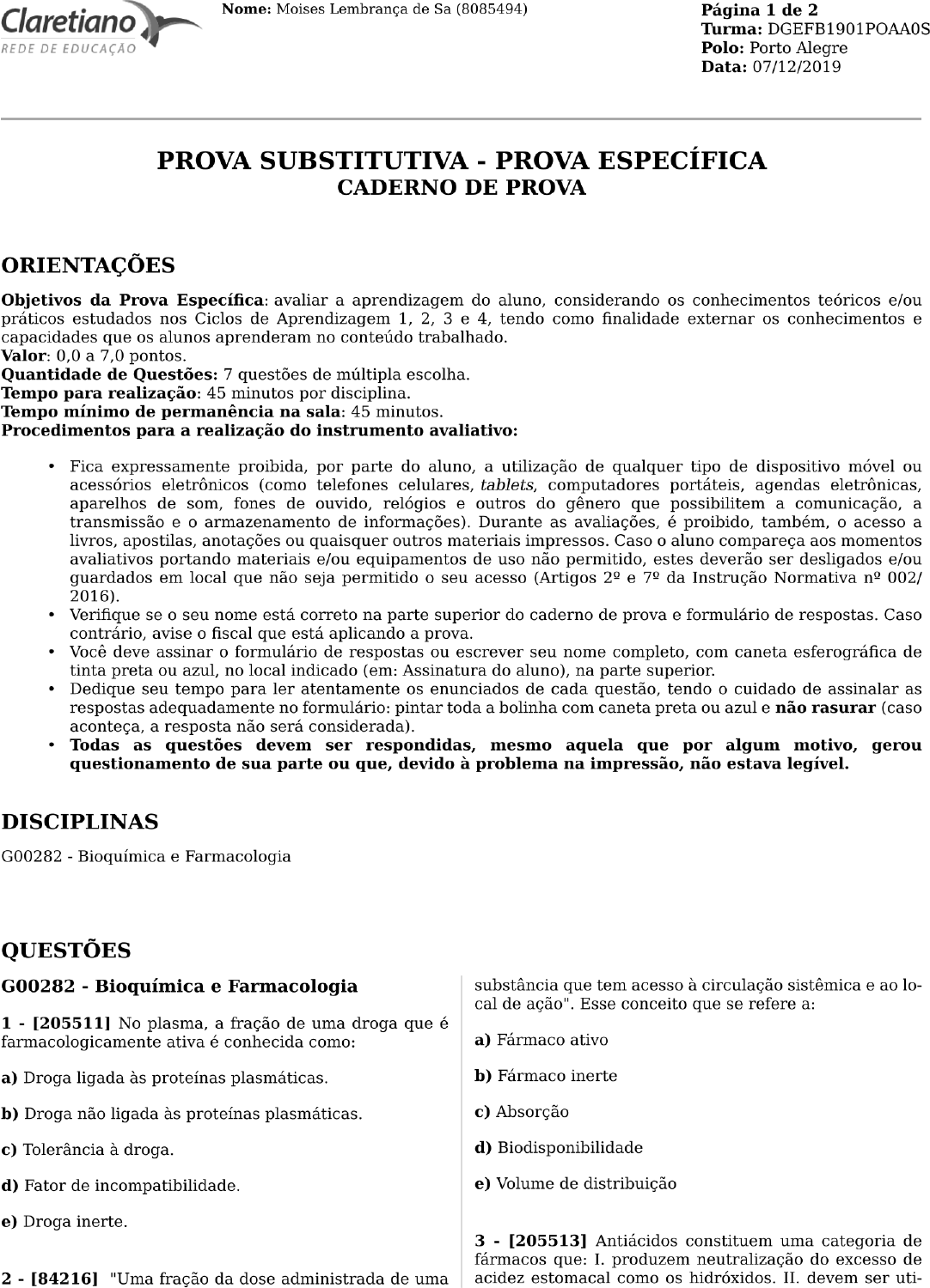 PROVA SUBSTITUTIVA - PROVA ESPECÍFICA CADERNO DE PROVA ORIENTAÇÕES Objetivos da Prova Específica: avaliar a aprendizagem do aluno, considerando os conhecimentos teóricos e/ou práticos estudados nos Ciclos de Aprendizagem 1, 2, 3 e 4, tendo como finalidade externar os conhecimentos e capacidades que os alunos aprenderam no conteúdo trabalhado. Valor: 0,0 a 7,0 pontos. Quantidade de Questões: 7 questões de múltipla escolha. Tempo para realização: 45 minutos por disciplina. Tempo mínimo de permanência na sala: 45 minutos. Procedimentos para a realização do instrumento avaliativo: • Fica expressamente proibida, por parte do aluno, a utilização de qualquer tipo de dispositivo móvel ou acessórios eletrônicos (como telefones celulares, tablets, computadores portáteis, agendas eletrônicas, aparelhos de som, fones de ouvido, relógios e outros do gênero que possibilitem a comunicação, a transmissão e o armazenamento de informações). Durante as avaliações, é proibido, também, o acesso a livros, apostilas, anotações ou quaisquer outros materiais impressos. Caso o aluno compareça aos momentos avaliativos portando materiais e/ou equipamentos de uso não permitido, estes deverão ser desligados e/ou guardados em local que não seja permitido o seu acesso (Artigos 2º e 7º da Instrução Normativa nº 002/ 2016). • Verifique se o seu nome está correto na parte superior do caderno de prova e formulário de respostas. Caso contrário, avise o fiscal que está aplicando a prova. • Você deve assinar o formulário de respostas ou escrever seu nome completo, com caneta esferográfica de tinta preta ou azul, no local indicado (em: Assinatura do aluno), na parte superior. • Dedique seu tempo para ler atentamente os enunciados de cada questão, tendo o cuidado de assinalar as respostas adequadamente no formulário: pintar toda a bolinha com caneta preta ou azul e não rasurar (caso aconteça, a resposta não será considerada). • Todas as questões devem ser respondidas, mesmo aquela que por algum motivo, gerou questionamento de sua parte ou que, devido à problema na impressão, não estava legível. DISCIPLINAS G00282 - Bioquímica e Farmacologia QUESTÕES G00282 - Bioquímica e Farmacologia 1 - [205511] No plasma, a fração de uma droga que é farmacologicamente ativa é conhecida como: a) Droga ligada às proteínas plasmáticas. b) Droga não ligada às proteínas plasmáticas. c) Tolerância à droga. d) Fator de incompatibilidade. e) Droga inerte. 2 - [84216] "Uma fração da dose administrada de uma substância que tem acesso à circulação sistêmica e ao lo- cal de ação". Esse conceito que se refere a: a) Fármaco ativo b) Fármaco inerte c) Absorção d) Biodisponibilidade e) Volume de distribuição 3 - [205513] Antiácidos constituem uma categoria de fármacos que: I. produzem neutralização do excesso de acidez estomacal como os hidróxidos. II. devem ser uti- Nome: Moises Lembrança de Sa (8085494) Página 1 de 2 Turma: DGEFB1901POAA0S Polo: Porto Alegre Data: 07/12/2019 lizados diariamente, uma vez que facilitam a digestão. III. não possuem restrição na utilização, pois não pro- duzem efeitos colaterais. Estão CORRETAS: a) Apenas I. b) Apenas II. c) Apenas III. d) Apenas II e III. e) I, II e III. 4 - [211934] Qual das propriedades físicas da água con- tribuiu de forma mais significativa para o surgimento da vida nos mares primitivos? a) calor específico b) calor de fusão c) calor de vaprização d) densidade e) capacidade calorífica 5 - [213063] Fármacos como dexametasona, prednisona e cortisona são utilizados como anti-inflamatórios, mas também em pacientes que realizaram transplantes ou ainda naqueles que apresentam reação alérgica a medicamentos e alimentos, uma vez que: a) apresentam atividade anticolinérgica. b) apresentam atividade anti-hipertensiva. c) apresentam atividade antidiarreica. d) apresentam atividade antidepressiva. e) apresentam atividade imunossupressora. 6 - [187507] Para um fármaco exercer efeito sistêmico, essencialmente ele deve alcançar: a) o sistema digestivo b) o intestino delgado c) o receptor/alvo terapêutico d) o sistema vascular e) o sistema linfático 7 - [173312] Com relação aos efeitos dos fármacos sobre o estado nutricional, considere as seguintes afir- mativas: I – os fármacos psicoestimulantes aumentam o apetite. II – os fármacos antineoplásicos provocam náusea e vômito. III – os fármacos antipsicóticos dimin- uem o apetite. Estão CORRETAS: a) apenas I. b) apenas II. c) apenas III. d) apenas II e III. e) I, II, III. Nome: Moises Lembrança de Sa (8085494) Página 2 de 2 Turma: DGEFB1901POAA0S Polo: Porto Alegre Data: 07/12/2019 Página 2 de 2