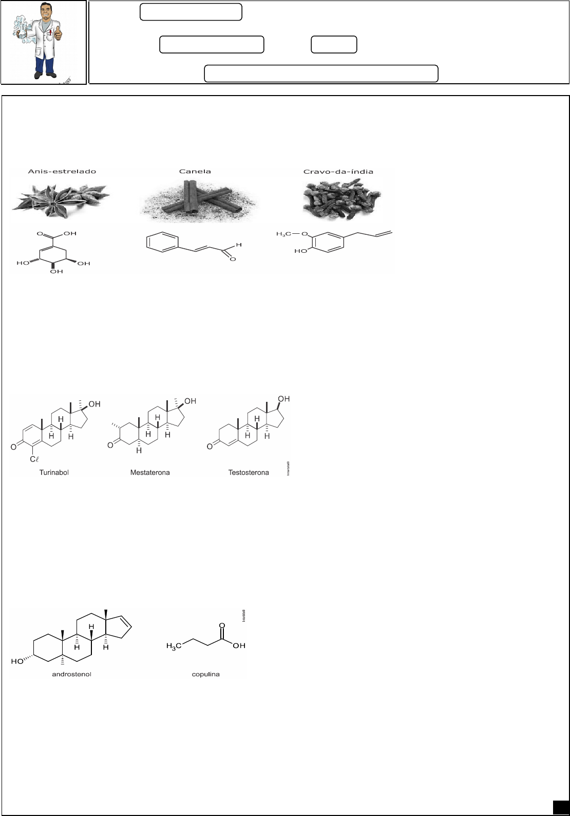 1. (G1 - ifsul 2017) Especiarias, como anis-estrelado, canela e cravo-da-índia, são deliciosas, sendo comumente utilizadas na gastronomia, devido aos seus deliciosos aromas. Também são utilizadas na fabricação de doces, como chicletes, balas e bolachas, na perfumaria e na aromatização de ambientes. Abaixo, temos as fórmulas estruturais de três compostos orgânicos, presentes no aroma dessas especiarias. Esses compostos apresentam em suas fórmulas estruturais os grupos funcionais a) álcool, cetona e fenol. b) aldeído, álcool, éter e fenol. c) aldeído, álcool, cetona e éter. d) álcool, ácido carboxílico, éster e fenol. 2. (Ufpr 2017) Poucos meses antes das Olimpíadas Rio 2016, veio a público um escândalo de doping envolvendo atletas da Rússia. Entre as substâncias anabolizantes supostamente utilizadas pelos atletas envolvidos estão o turinabol e a mestaterona. Esses dois compostos são, estruturalmente, muito similares à testosterona e utilizados para aumento da massa muscular e melhora do desempenho dos atletas. Quais funções orgânicas oxigenadas estão presentes em todos os compostos citados? a) Cetona e álcool. b) Fenol e éter. c) Amida e epóxido. d) Anidrido e aldeído. e) Ácido carboxílico e enol. 3. (Fatec 2017) Leia o texto. Feromônios são substâncias químicas secretadas pelos indivíduos que permitem a comunicação com outros seres vivos. Nos seres humanos, há evidências de que algumas substâncias, como o androstenol e a copulina, atuam como feromônios. <http://tinyurl.com/hqfrxbb> Acesso em: 17.09.2016. Adaptado. As fórmulas estruturais do androstenol e da copulina encontram-se representadas As funções orgânicas oxigenadas encontradas no androstenol e na copulina são, respectivamente, a) fenol e ácido carboxílico. b) álcool e ácido carboxílico. c) álcool e aldeído. d) álcool e cetona. e) fenol e éster. 4. (G1 - ifba 2017) O ano de 2016 foi declarado Ano Internacional das Leguminosas (AIL) pela 68ª Assembleia-Geral das Nações Unidas, tendo a Organização para a Alimentação e Agricultura das Nações Unidas (FAO) sido nomeado para facilitar a execução das atividades, em colaboração com os governos. Os agrotóxicos fazem parte do cultivo de muitos alimentos (dentre eles as leguminosas) de muitos países com o objetivo de eliminar pragas que infestam as plantações. Porém, quando esses compostos são usados em excesso podem causar sérios problemas de intoxicação no organismo humano. Na figura são apresentadas as estruturas químicas da Piretrina e da Coronopilina (agrotóxicos muito utilizados no combate a pragas nas plantações), identifique as funções orgânicas presentes simultaneamente nas estruturas apresentadas: a) Éter e Éster b) Cetona e Éster c) Aldeído e Cetona d) Éter e Ácido Carboxílico e) Álcool e Cetona 5. (Fmp 2017) Árvore da morte Esse é um dos seus nomes conhecidos, usado por quem convive com ela. Seus frutos, muitos parecidos com maçãs, são cheirosos, doces e saborosos. Também é conhecida como Mancenilheira da Areia – mas “árvore da morte” é o apelido que melhor escreve a realidade. Sua seiva leitosa contém forbol, um componente químico perigoso e só de encostar-se à árvore, a pele pode ficar horrivelmente queimada. Refugiar-se debaixo dos seus galhos durante uma chuva tropical também pode ser desastroso, porque até a seiva diluída pode causar uma erupção cutânea grave. Disponível em: <http://g1.globo.com/ciencia-e-saude/noticia/2016/06/a-arvore-da-morte-a-mais-perigosa-do-mundo-segundo-o-livro dos-recordes.html>. Adaptado. Acesso em: 18 jul. 2016. Considere a fórmula estrutural do forbol representada abaixo. Uma das funções orgânicas e o nome de um dos grupamentos funcionais presentes em sua molécula são, respectivamente, a) fenol e carbonila b) cetona e carboxila c) aldeído e hidroxila d) álcool e carboxila e) álcool e carbonila 7. (Fac. Santa Marcelina - Medicin 2017) A oleuropeína é o composto fenólico mais abundante presente nas folhas da oliveira. A partir dessa substância, produz-se o hidroxitirosol, um poderoso antioxidante ortodifenólico, responsável por grande parte dos benefícios atribuídos ao azeite de oliva extravirgem. O hidroxitirosol e um segundo álcool podem ser obtidos por hidrólise ácida da oleuropeína. a) Indique duas funções orgânicas presentes na molécula de oleuropeína, além da função fenol. b) Escreva a fórmula molecular do hidroxitirosol 8. (Ufjf-pism 2 2017) O gengibre é uma planta herbácea originária da Ilha de Java, da Índia e da China, e é utilizado mundialmente na culinária para o preparo de pratos doces e salgados. Seu caule subterrâneo possui sabor picante, que se deve ao gingerol, cuja fórmula estrutural é apresentada a seguir: Quais funções orgânicas estão presentes na estrutura do gingerol? a) Éster, aldeído, álcool, ácido carboxílico. b) Éster, cetona, fenol, ácido carboxílico. c) Éter, aldeído, fenol, ácido carboxílico. d) Éter, cetona, álcool, aldeído. e) Éter, cetona, fenol, álcool. 9. (Uerj 2017) Em determinadas condições, a toxina presente na carambola, chamada caramboxina, é convertida em uma molécula X sem atividade biológica, conforme representado abaixo. Nesse caso, dois grupamentos químicos presentes na caramboxina reagem formando um novo grupamento. Indique o nome de cada função oxigenada desse novo grupamento químico. 10. (Unisinos 2016) O mercado de beleza em 2015: crescimento e investimento das empresas O cuidado com o corpo tem conquistado mais adeptos entre mulheres e homens; hoje, a lista de produtos de beleza que são indispensáveis está bem mais ampla. O setor de higiene pessoal, perfumaria e cosméticos cada vez mais se consolida dentro da economia brasileira, e seu papel é fundamental nos aspectos econômicos, financeiros, sociais e também na contribuição em iniciativas sustentáveis. (Disponível em http://www.hairbrasil.com