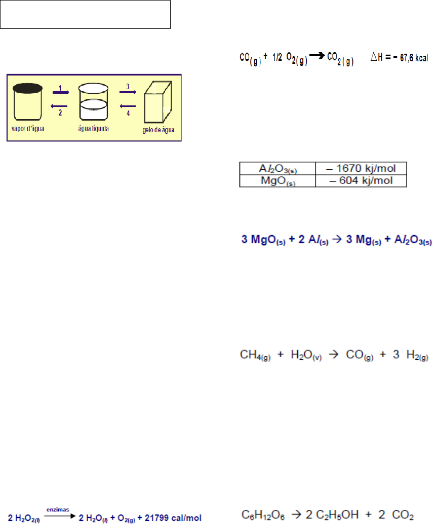 APOIO DIDÁTICO – 2º ano DISC. QUÍMICA PROF.DAVID WILLAMES Exercícios 1. Considere as transformações a que é submetida uma amostra de água, sem que ocorra variação da pressão externa: Pode-se afirmar que: a) As transformações 3 e 4 são exotérmicas. b) As transformações 1 e 3 são endotérmicas. c) A quantidade de energia absorvida em 3 é igual à quantidade liberada em 4. d) A quantidade de energia liberada em 1 é igual à quantidade liberada em 3. e) A quantidade de energia liberada em 1 é igual à quantidade absorvida em 2. 2. Considere as seguintes transformações: I . Dióxido de carbono sólido (gelo seco) _ dióxido de carbono gasoso. II . Ferro fundido _ ferro sólido. III . Água líquida _ vapor d’água. Dessas transformações, no sentido indicado e à temperatura constante, apenas: a) I é exotérmica. b) II é exotérmica. c) III é exotérmica. d) I e II são exotérmicas. e) II e III são exotérmicas. 3. A “efervescência” da água oxigenada, quando empregada no tratamento de ferimentos, é representada pela equação: Essa reação pode ser classificada como: a) síntese e endotérmica. b) síntese e exotérmica. c) decomposição e exotérmica d) decomposição e endotérmica. e) deslocamento e exotérmica. 4. Dada à equação abaixo, podemos afirmar que o calor liberado na queima de 2,8g de monóxido de carbono será: Dados: C = 12g/mol; O = 16g/mol. a) 6,76 kcal. b) 3,38 kcal. c) 10,14 kcal. d) 67,6 kcal. e) 33,8 kcal. 5.Considere as seguintes entalpias de formação: Com essas informações, pode-se calcular a variação de entalpia da reação representada por: Seu valor será igual a: a) – 1006 kj. b) – 142 kj. c) + 142 kj. d) + 1066 kj. e) + 2274 kj. 6.O gás hidrogênio pode ser obtido pela reação abaixo equacionada:A entalpia da reação a 25°C e 1 atm, é igual a: Dados: Entalpias de formação em kj/mol, CH4 = – 75; H2O = – 287; CO = – 108. a) + 254 kj. b) – 127 kj. c) – 479 kj. d) + 508 kj. e) – 254 kj. 7.Uma das etapas envolvidas na produção de álcool combustível é a fermentação. A equação que representa esta transformação é:Sabendo que os calores de formação da glicose, do gás carbônico e do álcool são, respectivamente iguais a – 302 kcal/mol, – 94,3 kcal/mol e – 66 kcal/mol, pode-se afirmar que a fermentação ocorre com: a) liberação de 18,6 kcal. b) absorção de 18,6 kcal. c) liberação de 142 kcal. d) absorção de 142 kcal. e) variação energética nula. 8. O acetileno é um gás que, ao queimar, produz uma chama luminosa, alcançando uma temperatura ao redor de 3000°C. É utilizado em maçaricos e no corte e solda de metais. A sua decomposição é dada pela equação abaixo: Baseando-se nessa reação, analise as afirmativas: I. Invertendo o sentido da equação, o sinal da entalpia não varia. II. Há liberação de calor, constituindo-se numa reação exotérmica. III. A entalpia dos produtos é menor que a entalpia dos reagentes. Está(ão) correta(s). a) apenas I. b) apenas II. c) apenas III. d) apenas I e II. e) apenas II e III. 9. Em um conversor catalítico, usado em veículos automotores em seu cano de escape para redução da poluição atmosfera, ocorrem várias reações químicas, sendo que uma das mais importantes é: Dado que as entalpias das reações abaixo são: Pode-se afirmar que a reação inicial é: a) exotérmica e absorve 67,7 kcal/mol. b) exotérmica e libera 120,5 kcal/mol. c) exotérmica e libera 67,7 kcal/mol. d) endotérmica e absorve 120,5 kcal/mol. e) endotérmica e absorve 67,7 kcal/mol. 10. Dadas às reações: Calcular a variação de entalpia da reação: e assinale a opção correta . a) – 25,8 e a reação é endotérmica. b) – 162,4 e a reação é endotérmica. c) + 162,4 e a reação é endotérmica. d) – 162,4 e a reação é exotérmica. e) – 25,8 e a reação é exotérmica. 12. Denomina-se dimerização ao processo no qual duas moléculas iguais reunem-se para formar uma única estrutura. Exemplo: Determine o valor de H da dimerização acima, sendo dadas: Entalpia de NO2(g) = +34 kJ/mol Entalpia de N2O4(g) = +10 kJ/mol 13. A partir das entalpias padrão das reações de oxidação do ferro dadas abaixo: Determine a quantidade de calor liberada a 298 K e 1 atm na reação: “Junte-se aos bons e torne-se o melhor”