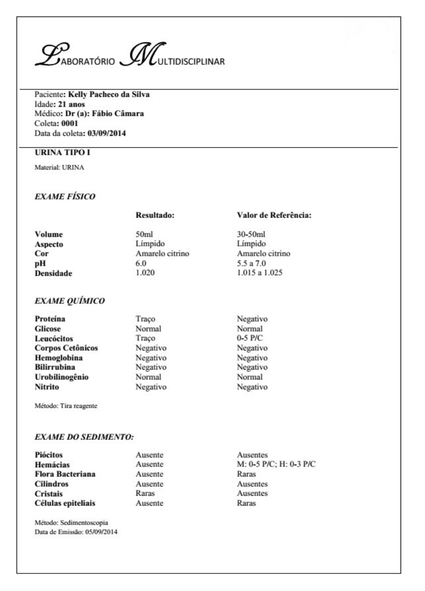 EXERCÍCIO a) Montar um laudo de Urina Tipo 1. b) Detalhar todo o procedimento e as etapas da realização do exame. Coleta da urina: é necessário ser coletada a primeira urina da manhã, caso isso não for possível, é importante ficar de 2 a 4 horas sem urinar antes da coleta. Realização do exame: o exame consiste em três partes: O exame físico (onde são observadas cor, transparência e a medida da gravidade específica), o exame químico (onde é analisado pH, proteína, bilirrubina, etc.), e o exame microscópico, onde a lâmina com o material fresco será analisada para identificar as estruturas presentes. A parte química é realizada com o auxílio da tira reagente, que são quadrados de papéis absorventes com substâncias químicas. Consiste em homogeinizar bem a urina e submergir completamente todas as áreas da fita por 10vezes, retirando logo depois. Logo em seguida, é necessário eliminar o excesso da urina e aguardar o tempo recomendado para a reação. A reação é enzimática de ponto final. Se não for realizada no tempo correto, altera o resultado. A sedimentoscopia é a última etapa do exame, ou seja, o exame microscópico. Consiste em centrifugar o sedimento por 10 minutos e desprezar o sobrenadante. Logo em seguida, com o auxilio de uma pipeta, coletar o sedimento e preparar a lâmina. Preparo da lâmina: Colocar duas gotas do sedimento em uma lâmina, uma de cada vez. Colocar, logo em seguida, uma gota do corante urinário (STERNHEIMER-MALBIN), homogeneizar e cobrir com uma lamínula para a observação do sedimento a fresco. Para analisar exame a fresco é recomendado utilizar a luz baixa, começando com um menor aumento (100x) e depois um maior aumento(400x). c) Escrever o possível diagnóstico do paciente. R: Paciente sem alterações.